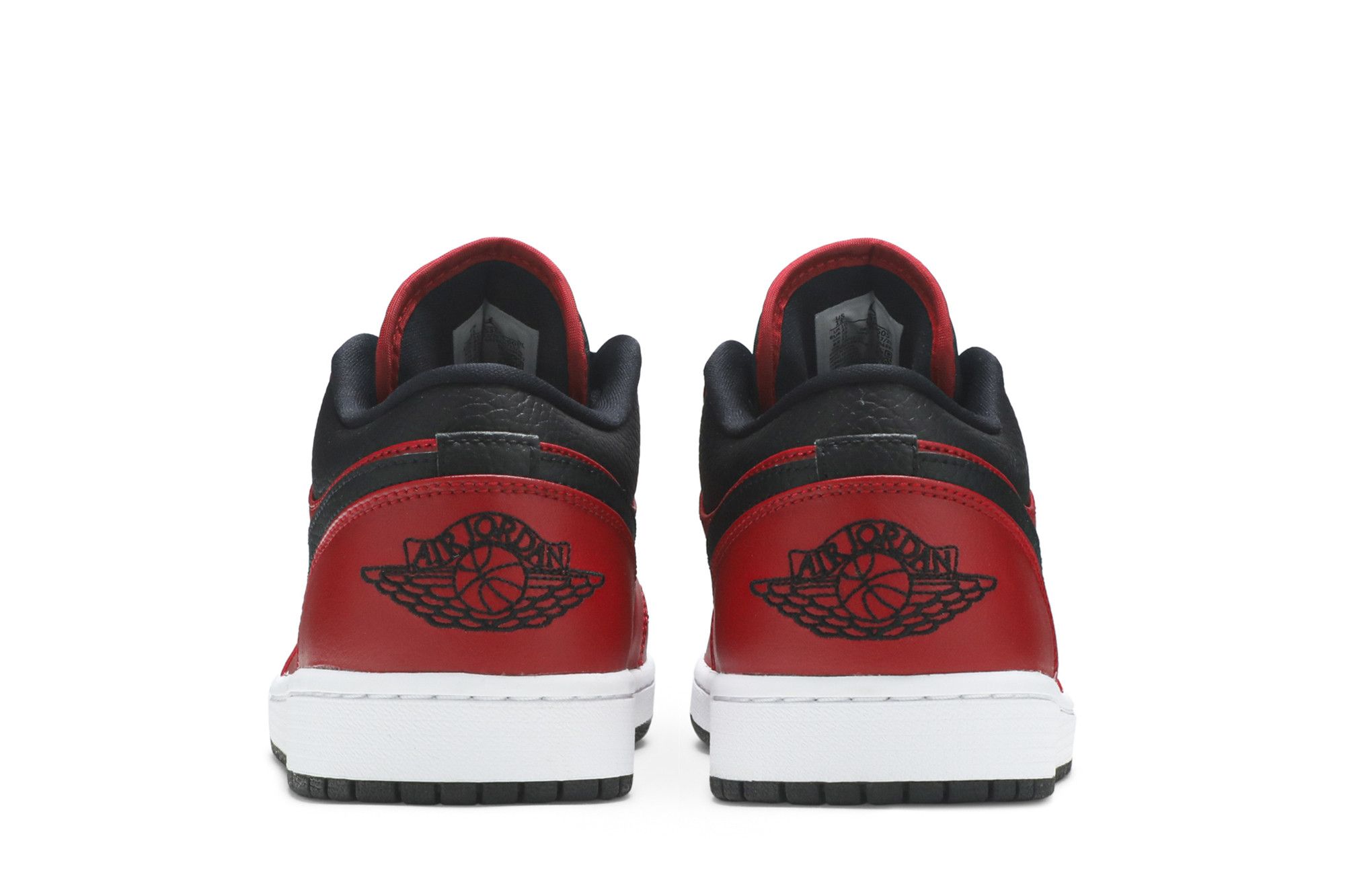 The Air Jordan 1 Low Reverse Bred Pebbled Swoosh combines three major colors: red, white, and black.