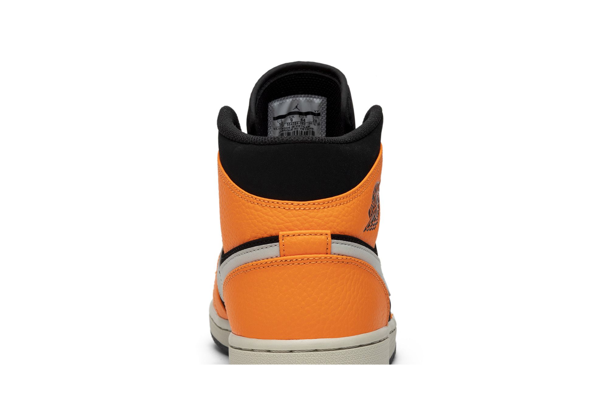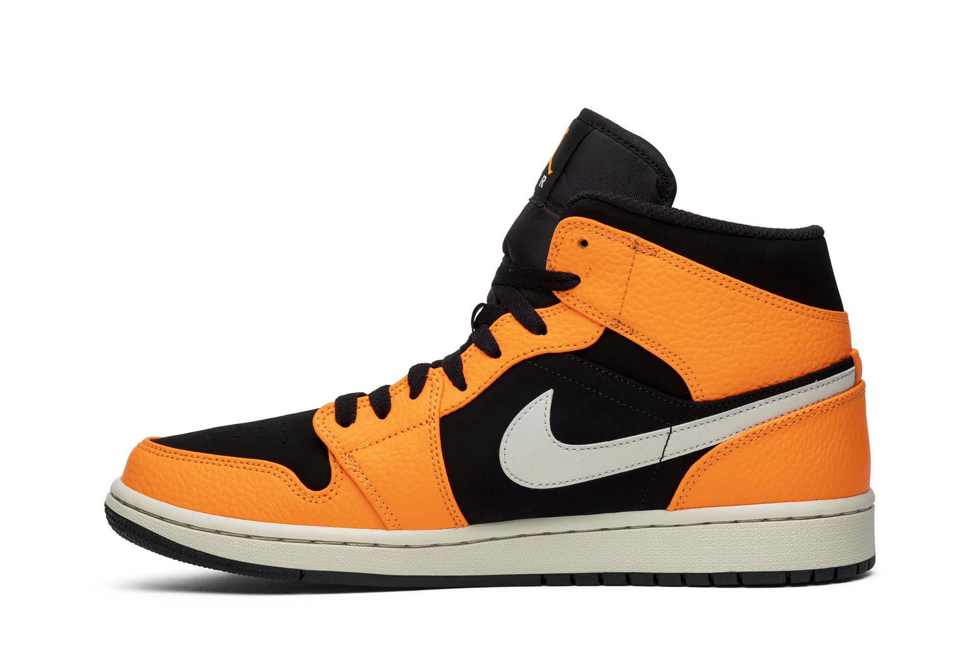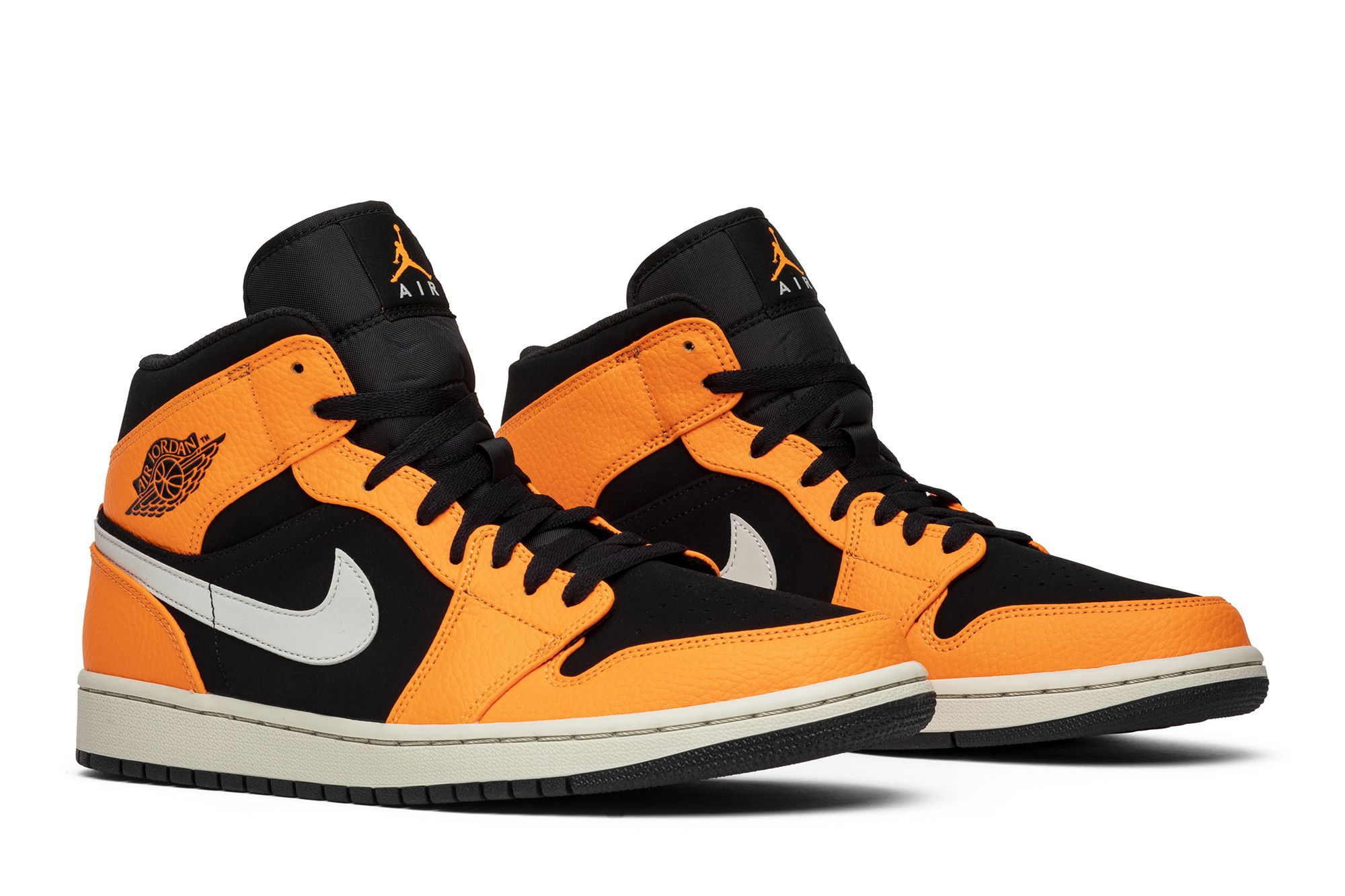 The Air Jordan 1 Mid Black Cone is a high-level sneaker featuring a black elevated with an Orange Cone leather surface. It displays a Wings logo on the side of the ankle.