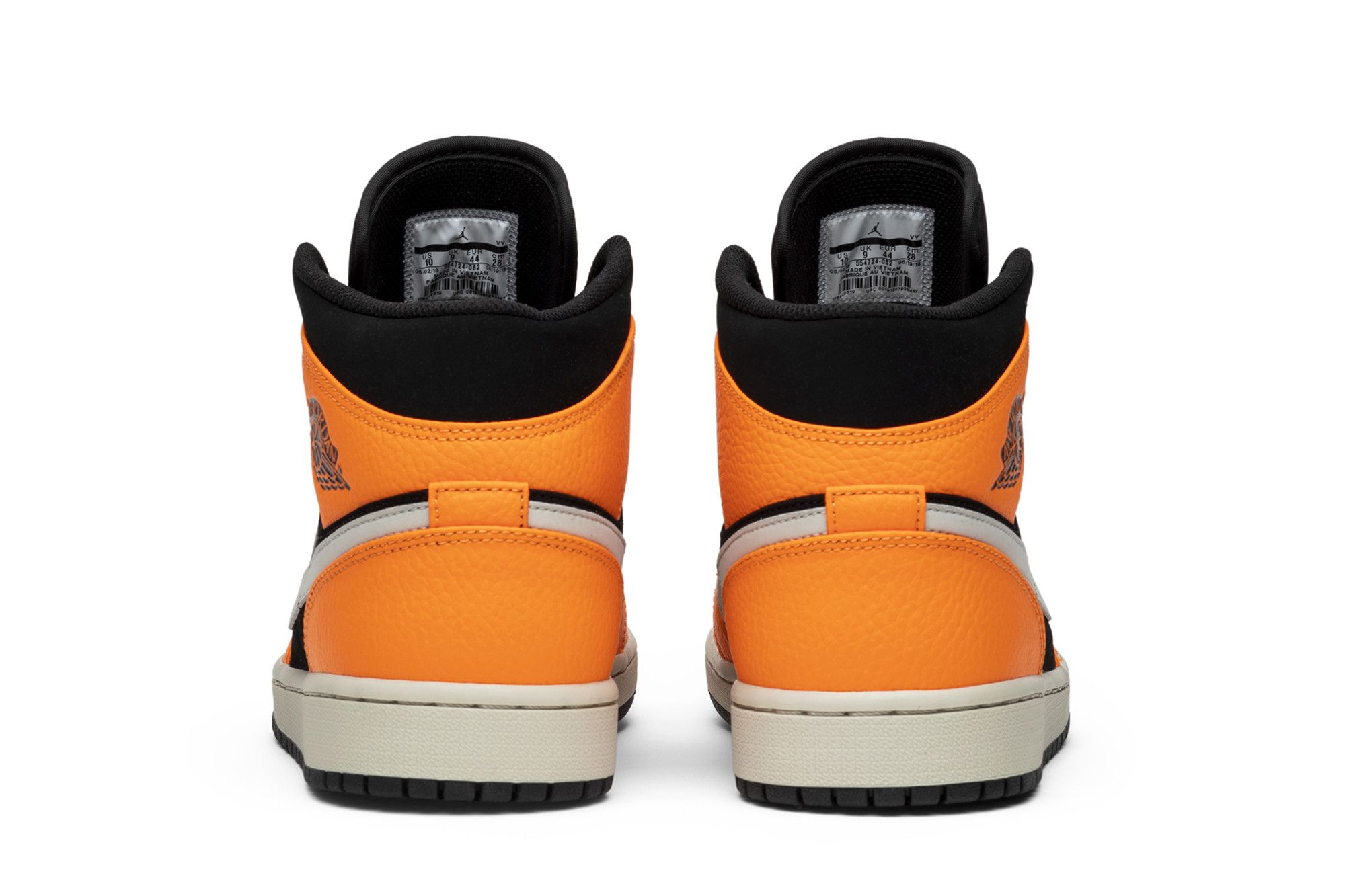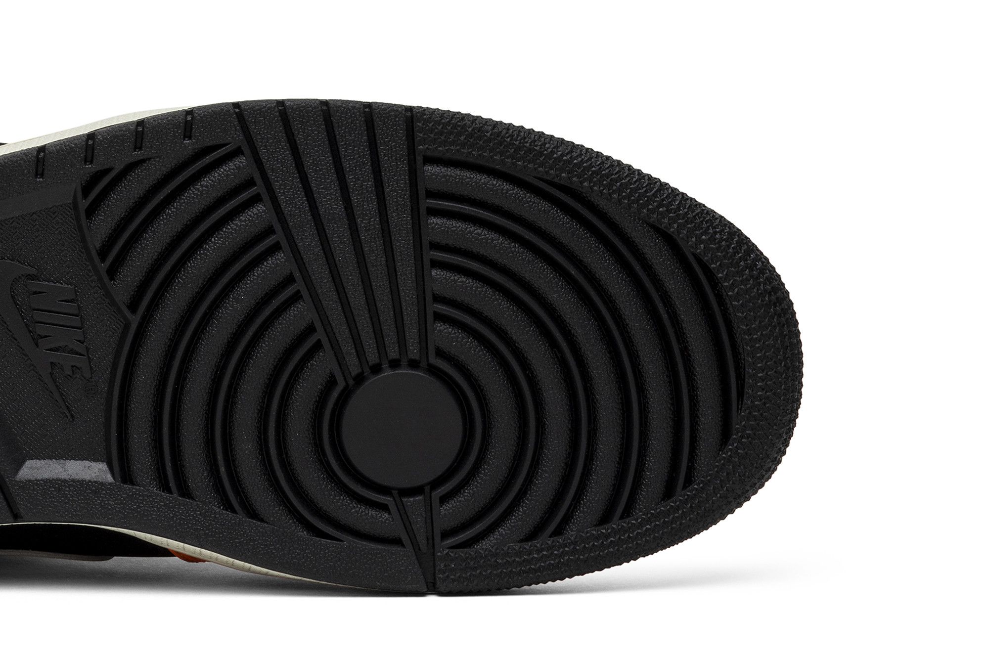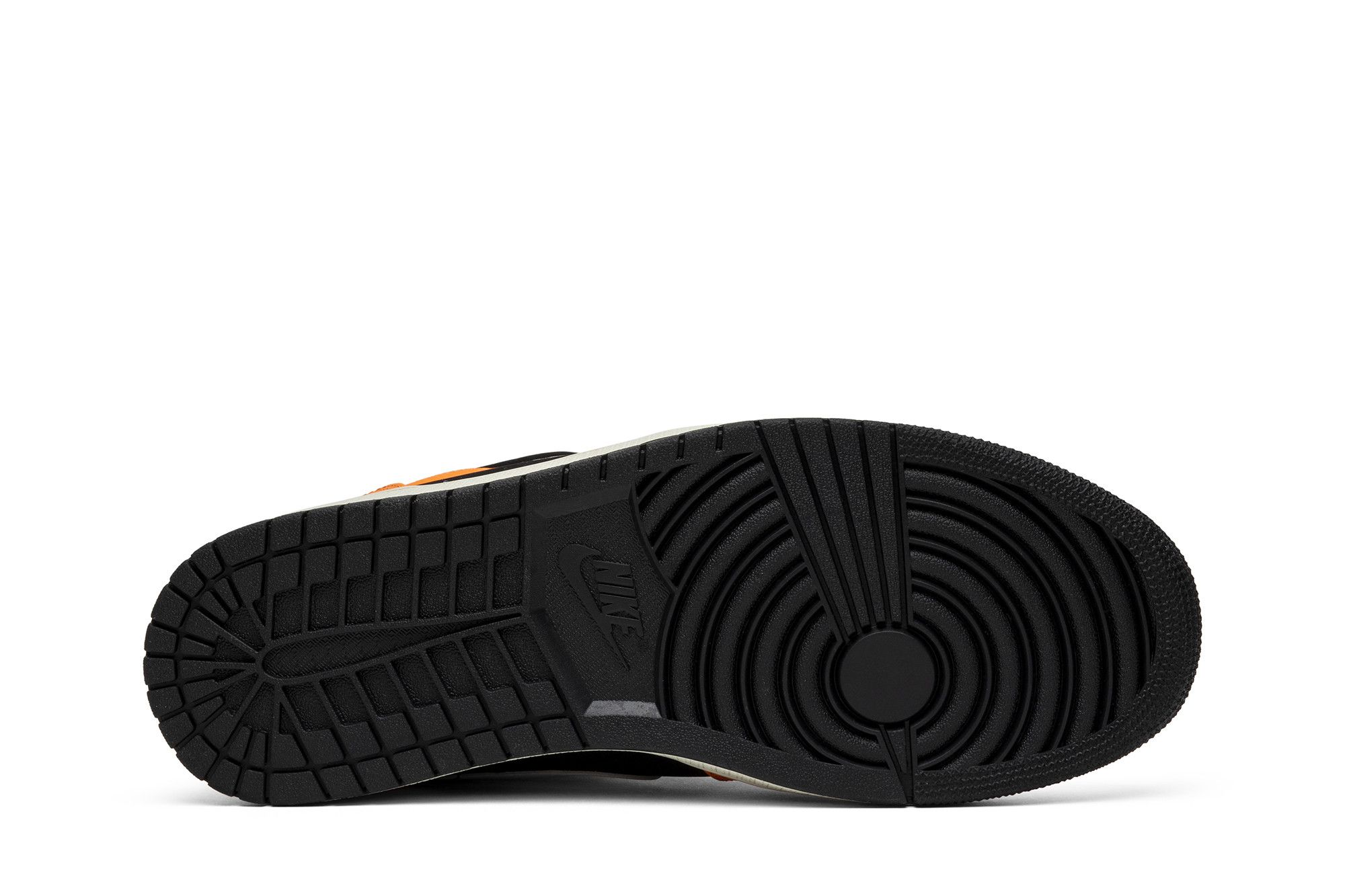 The Air Jordan 1 has a white Nike Swoosh, and black highlights the mesh, boot, sole, sides, ankle, and insole. A Cone Orange color appears on the undersurface, boot, ankle cuff, and heel. Also, the Jordan logo pops out on the bottom of the shoe and is printed on the heel.