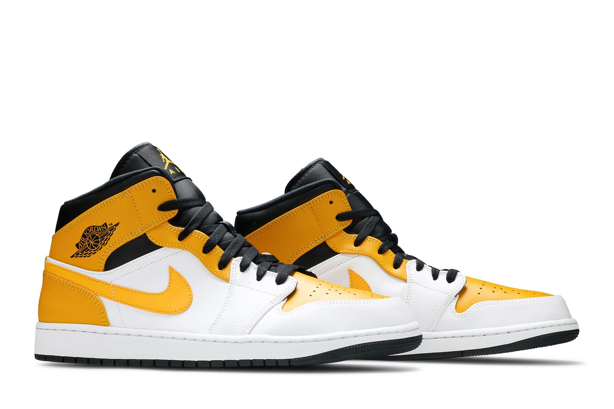 The Air Jordan 1 Mid University Gold is a slightly reworked version of the original Air Jordan 1 Mid. A colorful shoe, it boasts a White, University Gold, and Black colorway. The University Gold coloring is visible on the shoe’s upper eyelets, heels, Swooshes, toe box, and ankle flap, while the white appears on the leather upper overlays. The black is visible on the shoe’s mesh tongue, laces, leather ankle collars, insoles, and Air Wings logos.