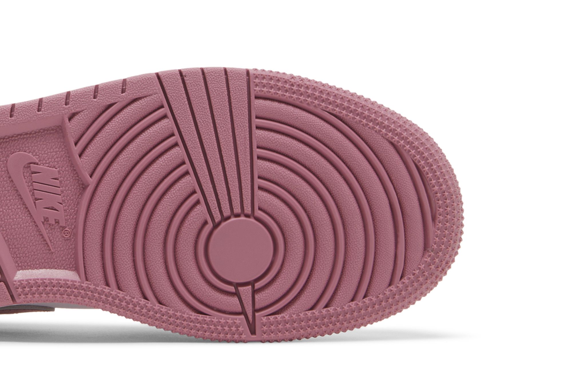 The shoe features a white leather upper with perforated detailing on the toe box in classic Air Jordan 1 fashion. It also has pink overlays around the midfoot, lace eyelets and around the ankle and heel with stitching all around the upper and midsole synonymous with most shoes on the silhouette. The Swoosh appears in an even darker shade of pink, providing a cool contrasting effect that also extends to the outsole. Branding details on the shoe include the Air Jordan Wings logo on the outer side of ankle and the Jumpman logo with Air branding on the tongue.