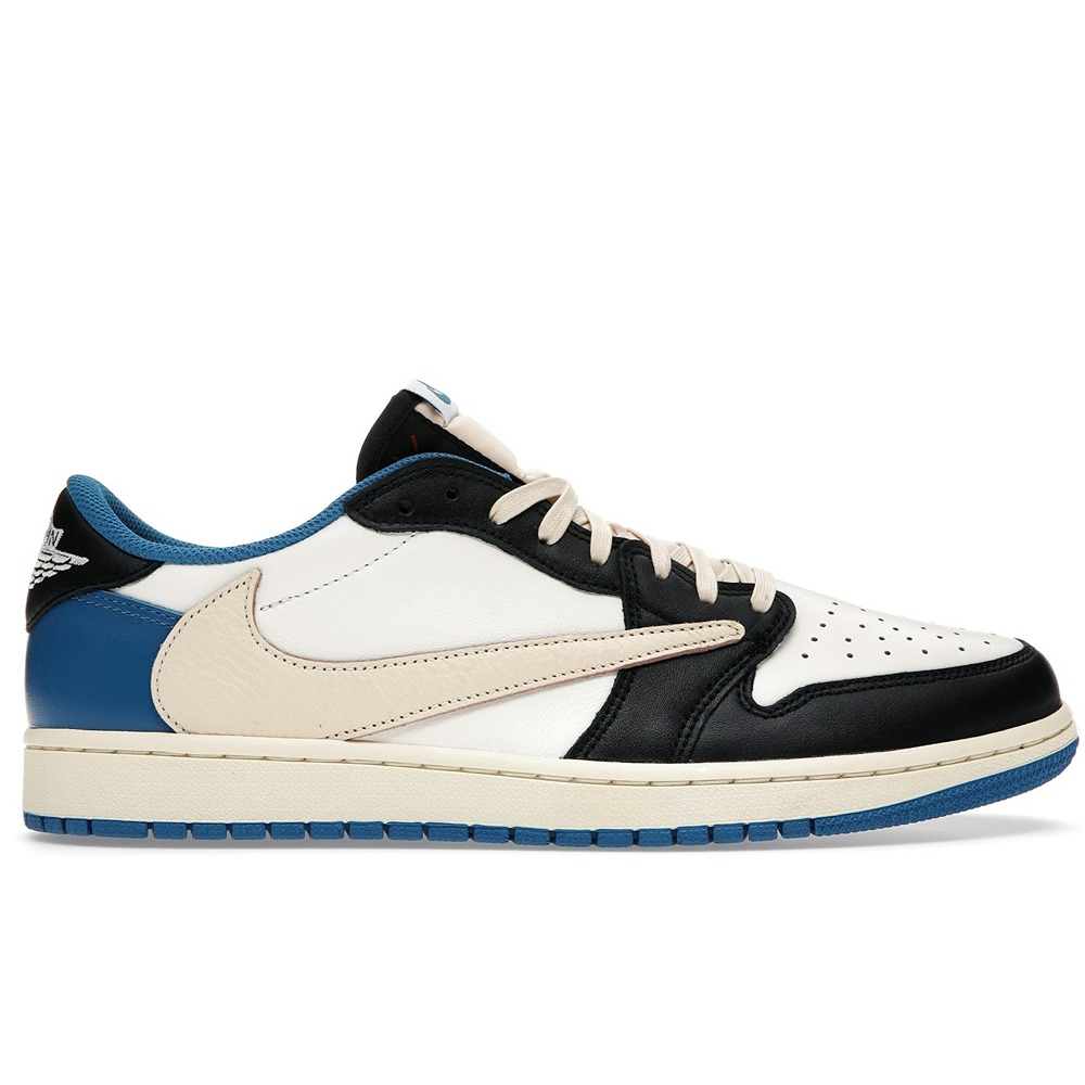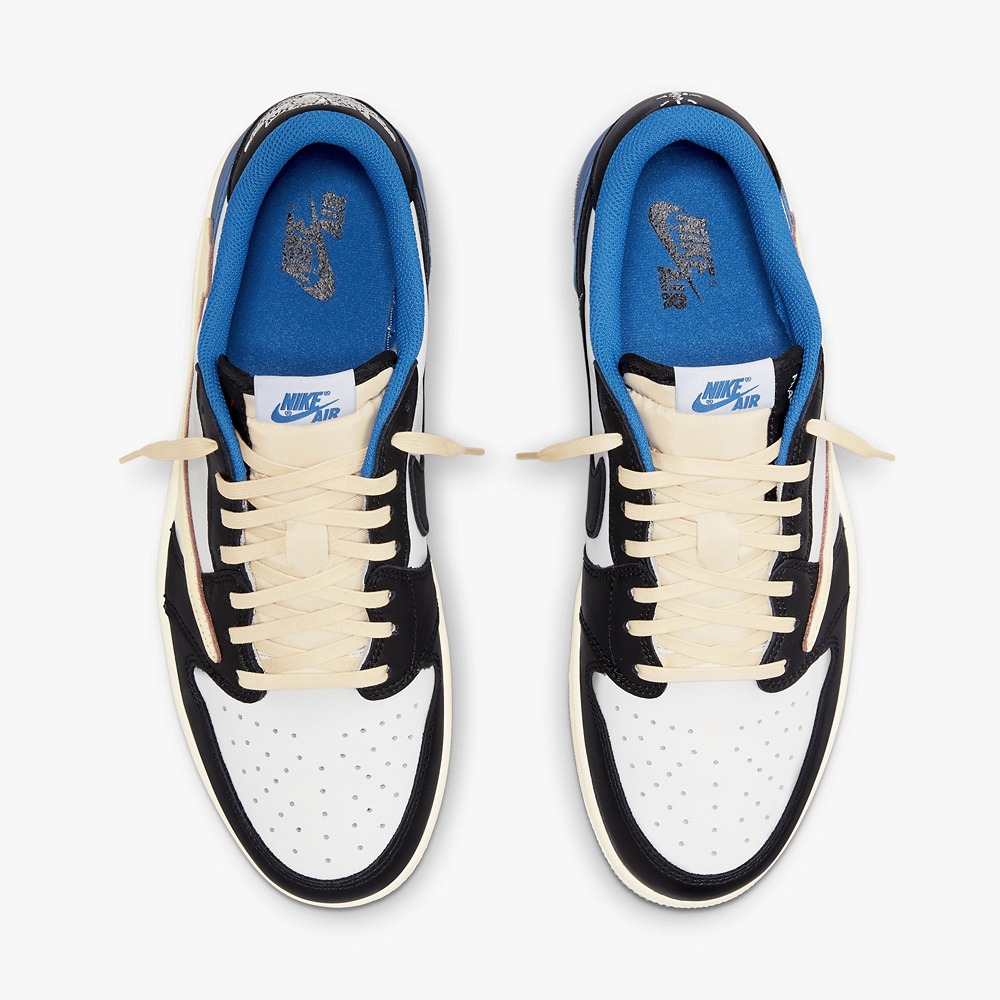The Air Jordan 1 Low Fragment Design x Travis Scott nods to the original 2016 Air Jordan 1 Fragment with its simple color blocking. It features a smooth white leather upper with black and royal blue leather overlays. From there, a signature reversed Swoosh and yellowed soles add a Cactus Jack flair to the classic silhouette.
