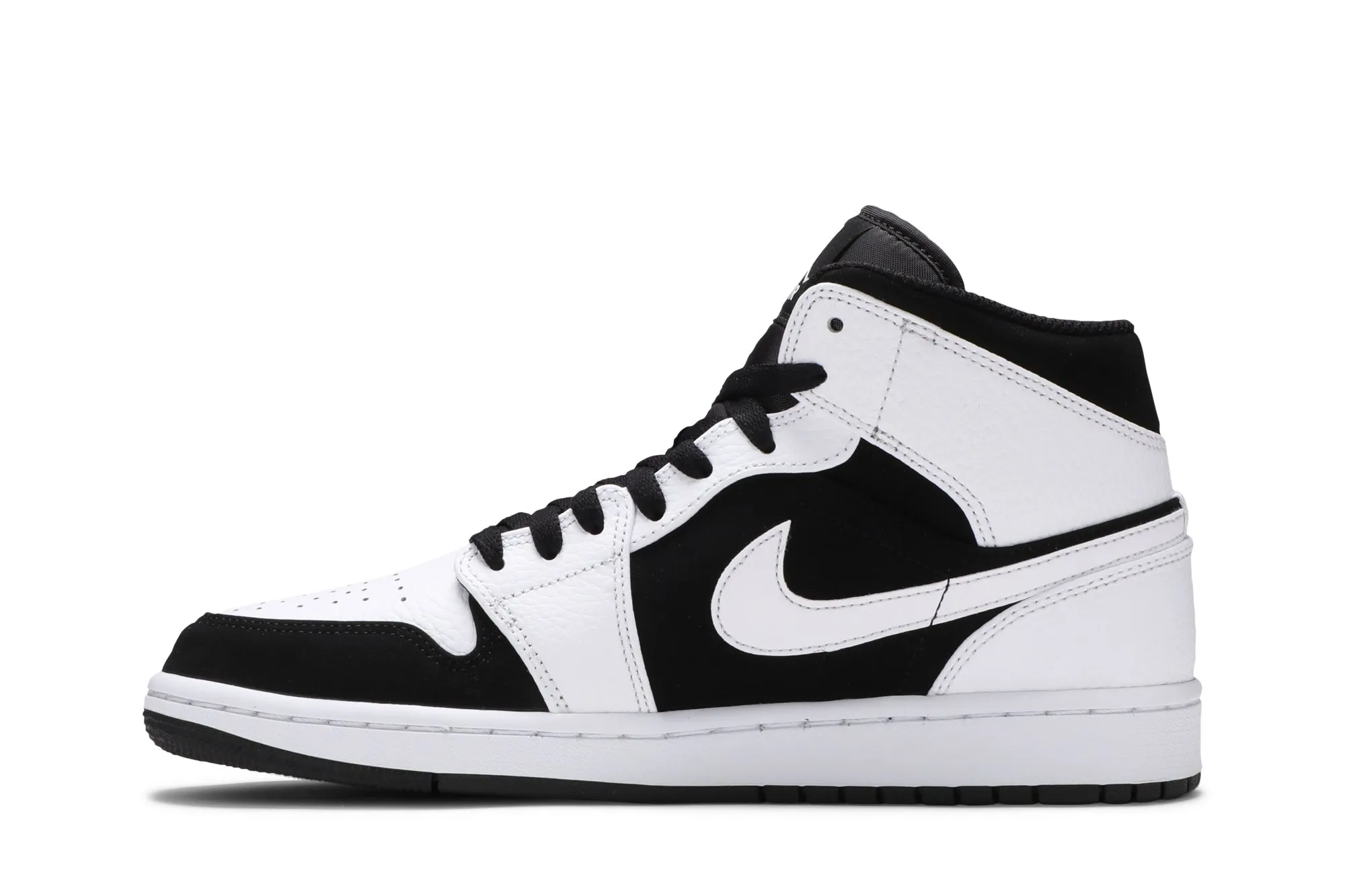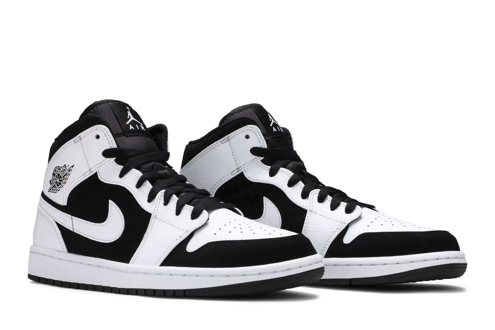 Since Michael Jordan debuted the sneaker in 1985, Nike’s Air Jordan has been a footwear staple in shoe history. The Air Jordan 1 Retro Mid ‘Tuxedo’ sneaker looks to the past and reimagines the classic design. Released in the Fall of 2018, the ‘Tuxedo’ colorway features a grained leather upper withsoft nubuck overlays and signature wings logo. The heel contains an Air-Sole unit that reinforces the cushioned midsole, while the rubber outsole ensures traction to prevent slippage.
