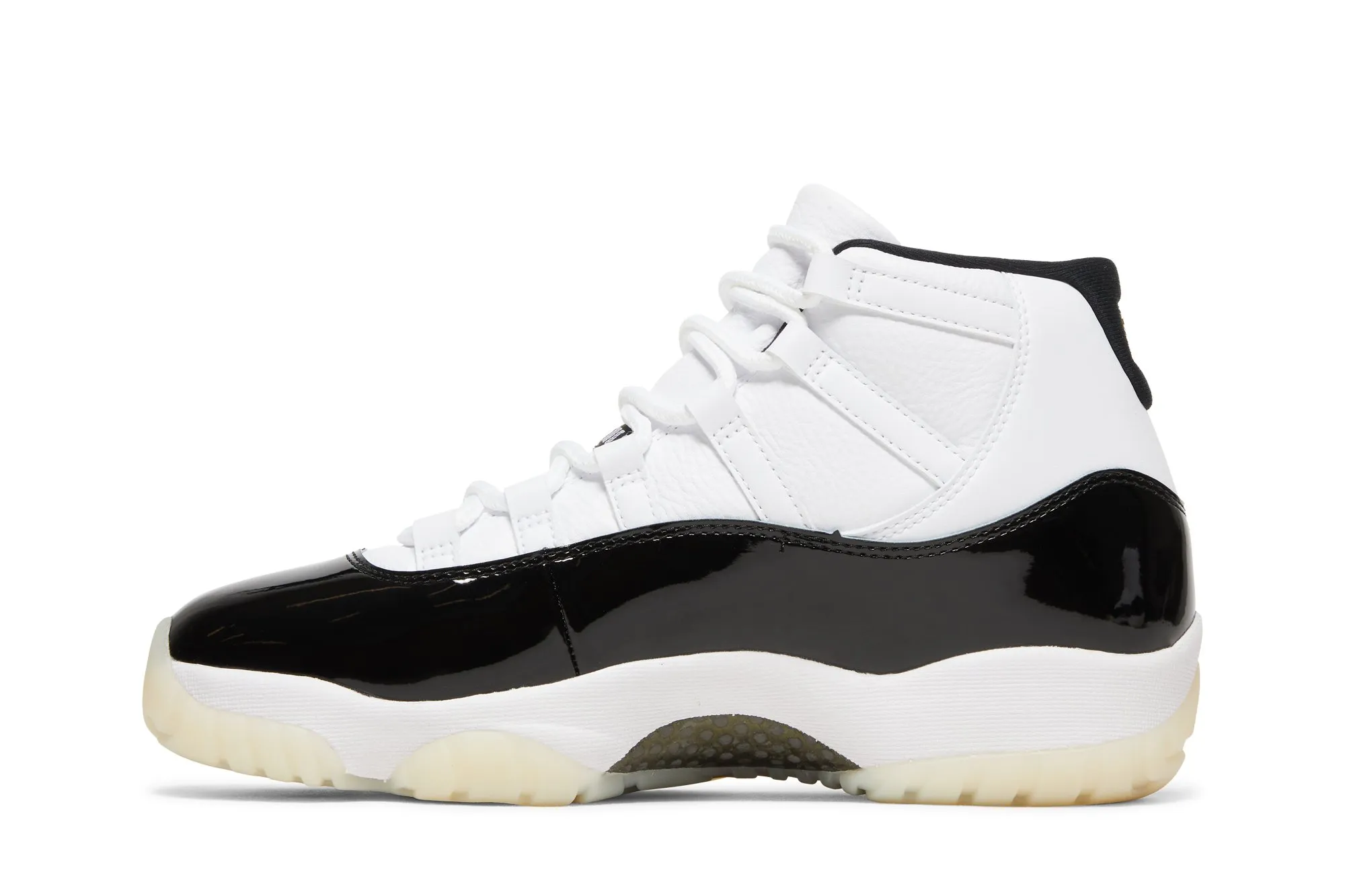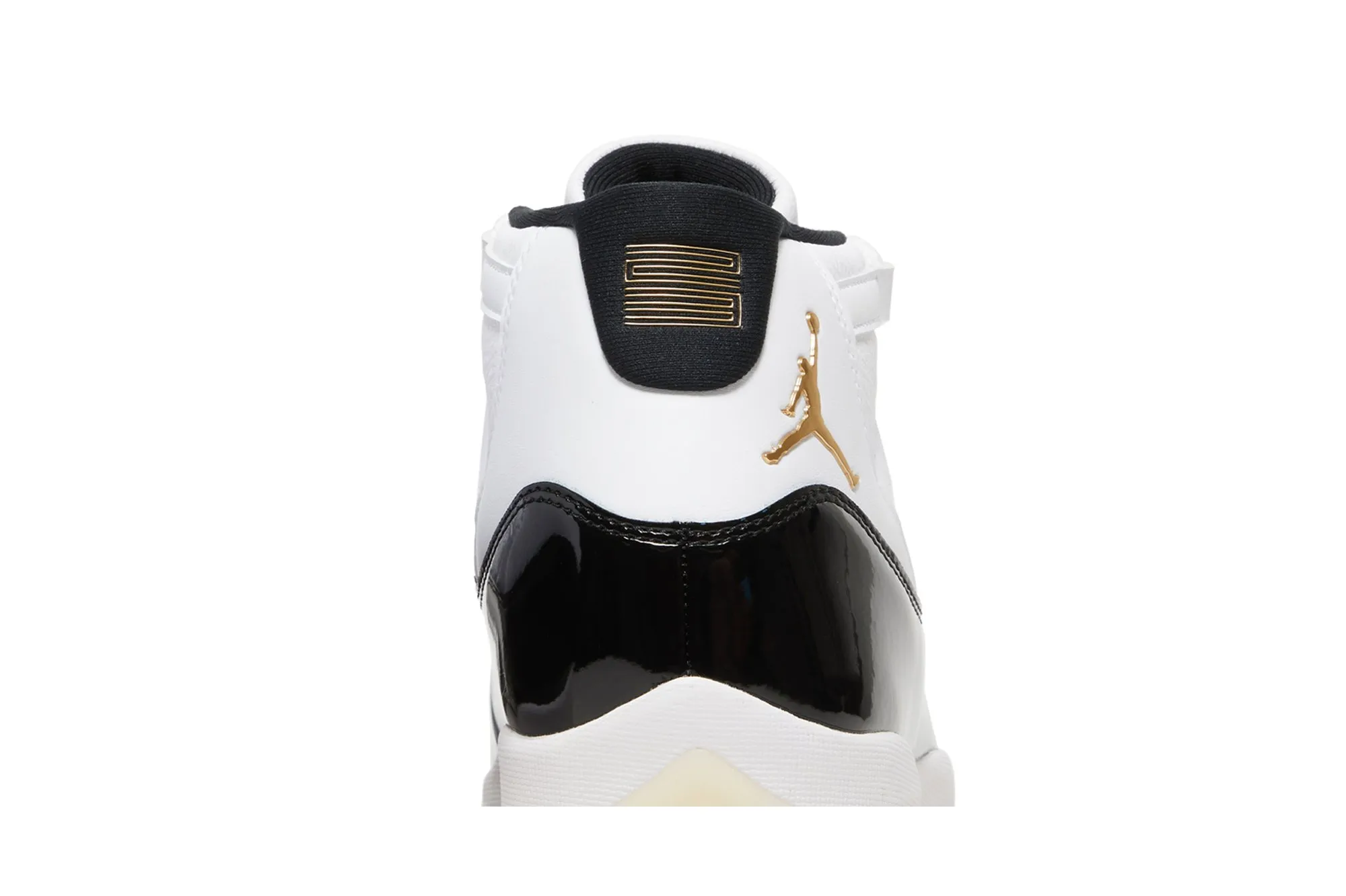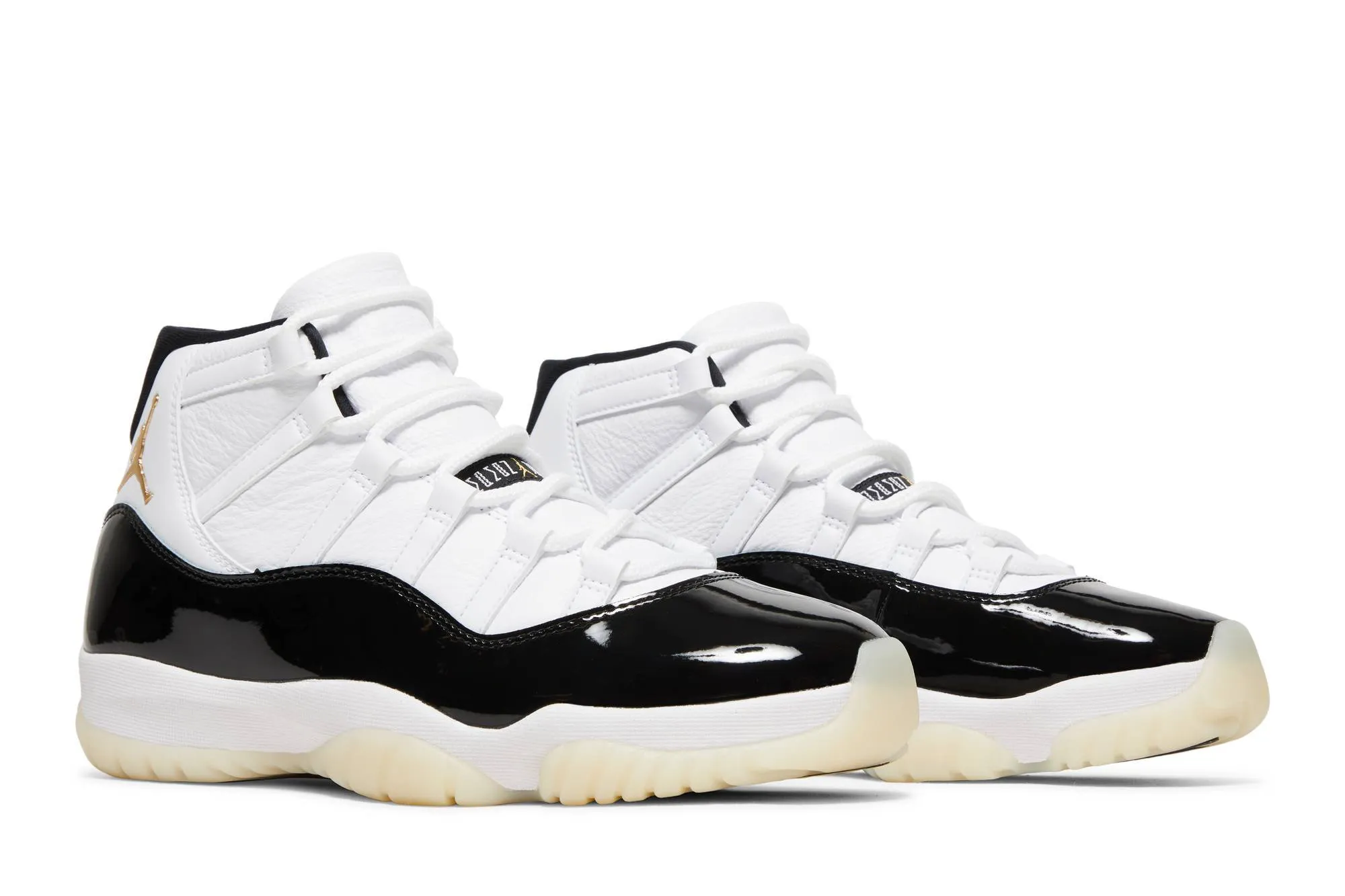 The 2023 edition of the Air Jordan 11 Retro ‘Gratitude / Defining Moments’, also known as ‘DMP’, brings back a coveted colorway of the iconic silhouette, originally paired with an Air Jordan 6 as one-half of the ‘Defining Moments Pack’ from 2006. Inspired by the OG ‘Concord’ colorway, the championship model features a white tumbled leather upper with tonal webbing eyelets and a black patent leather mudguard. Metallic gold accents highlight the shoe’s branding elements, including an embossed Jumpman logo on the lateral ankle and a ’23’ stamped on the heel tab. The sneaker sits atop a Phylon midsole, supported by a carbon fiber shank plate and a translucent rubber outsole.