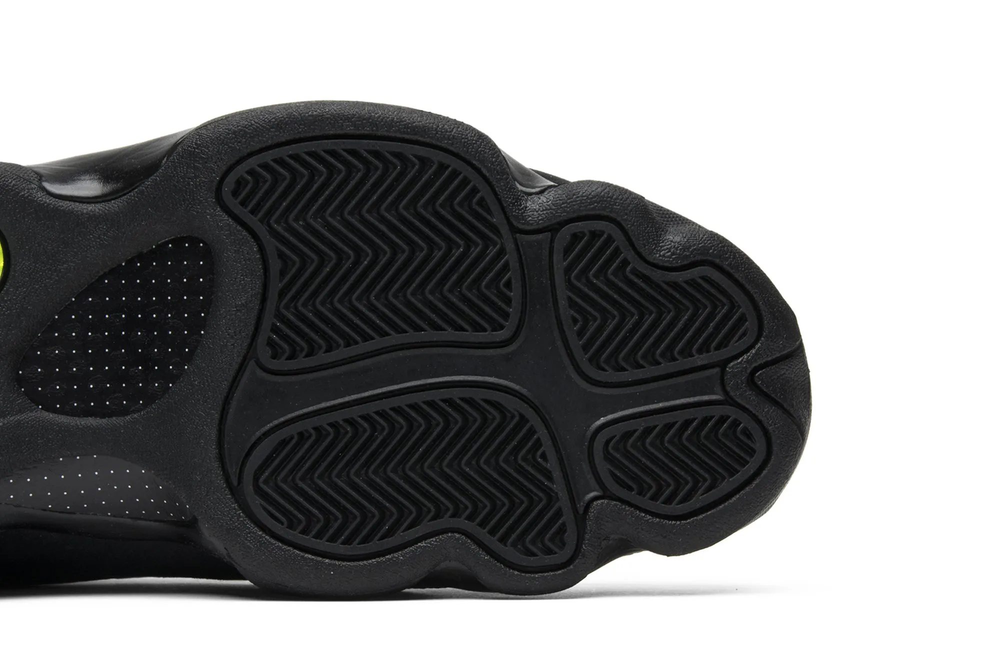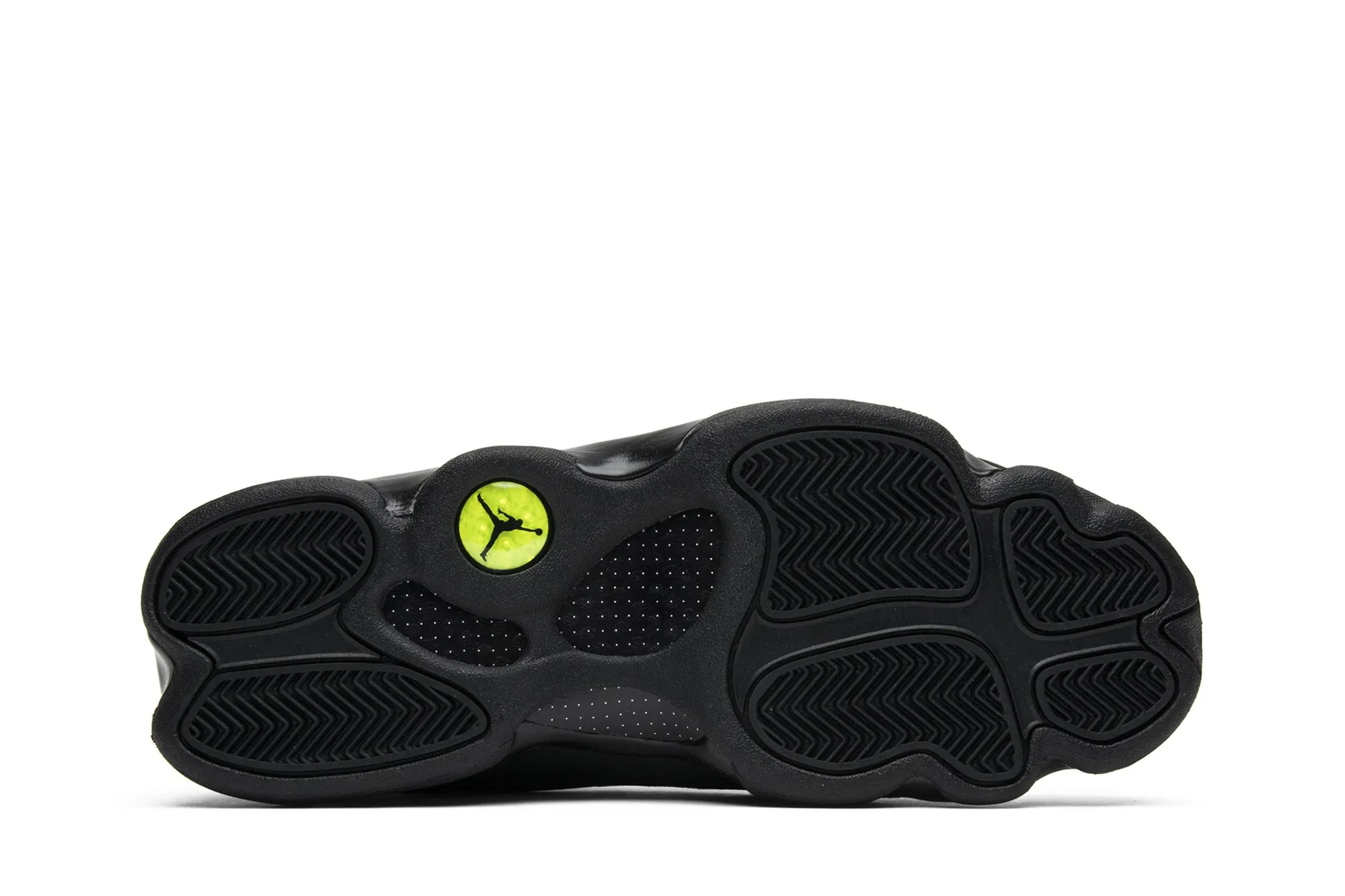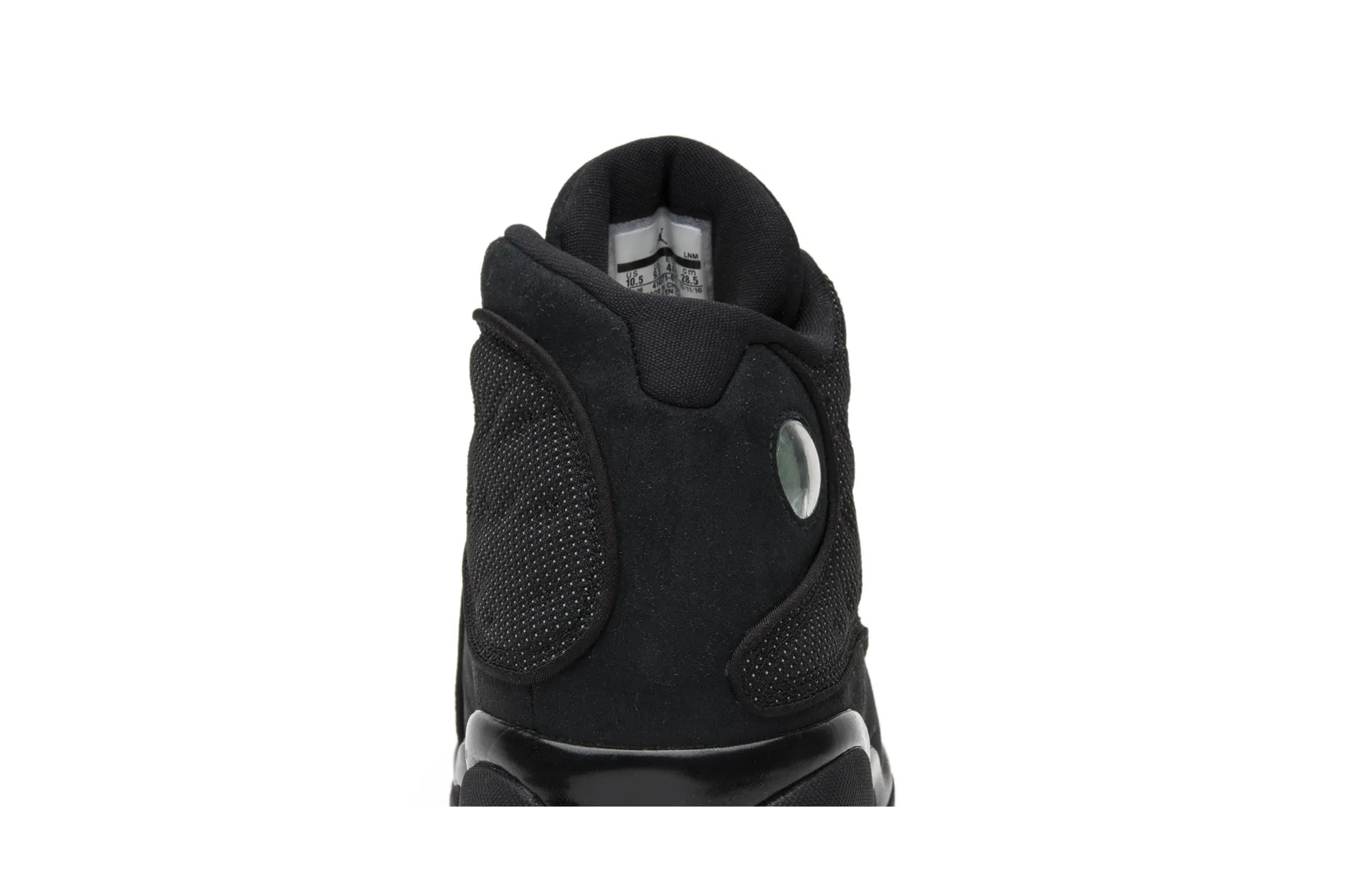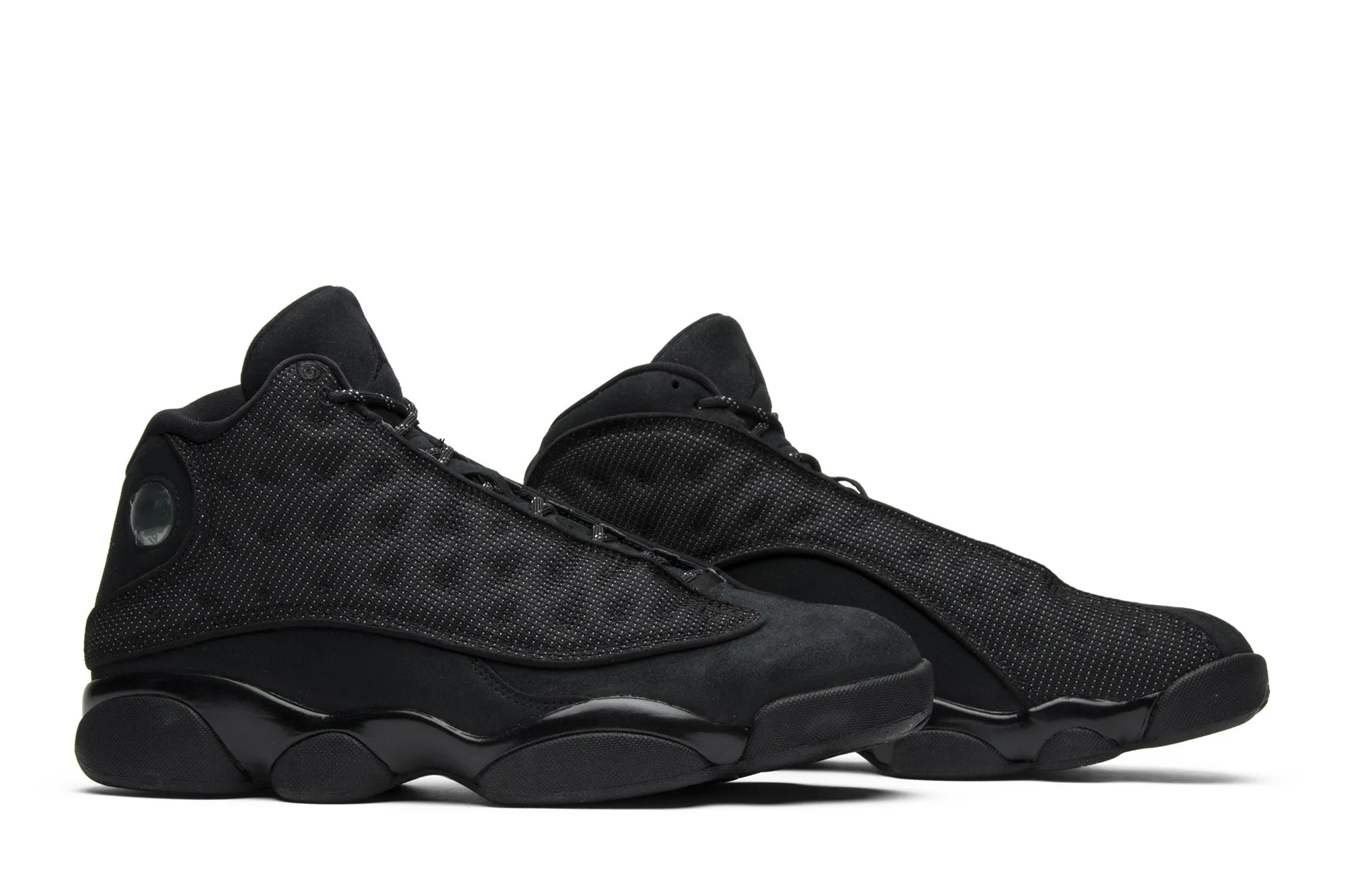 This Retro Air Jordan 13 model has an upper that is built with suede material, finished in black, and overlaid by mesh, which sports a reflective finish. Rope laces secure the fit, while the Jumpman hologram logo marks the heel. Underfoot, there is a Zoom Air in the forefoot and heel of the Phylon midsole for cushioning, giving way to a herringbone panther's-paw outsole for traction.