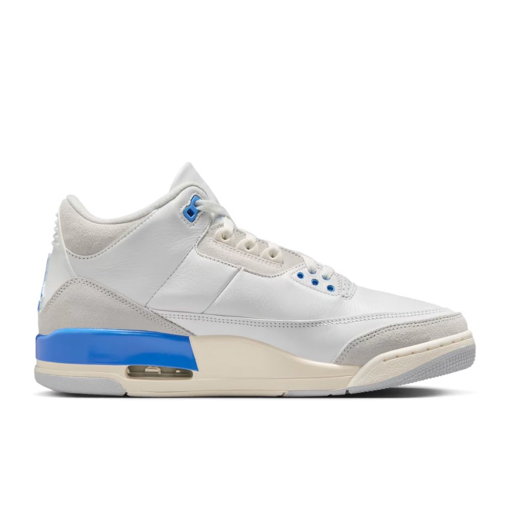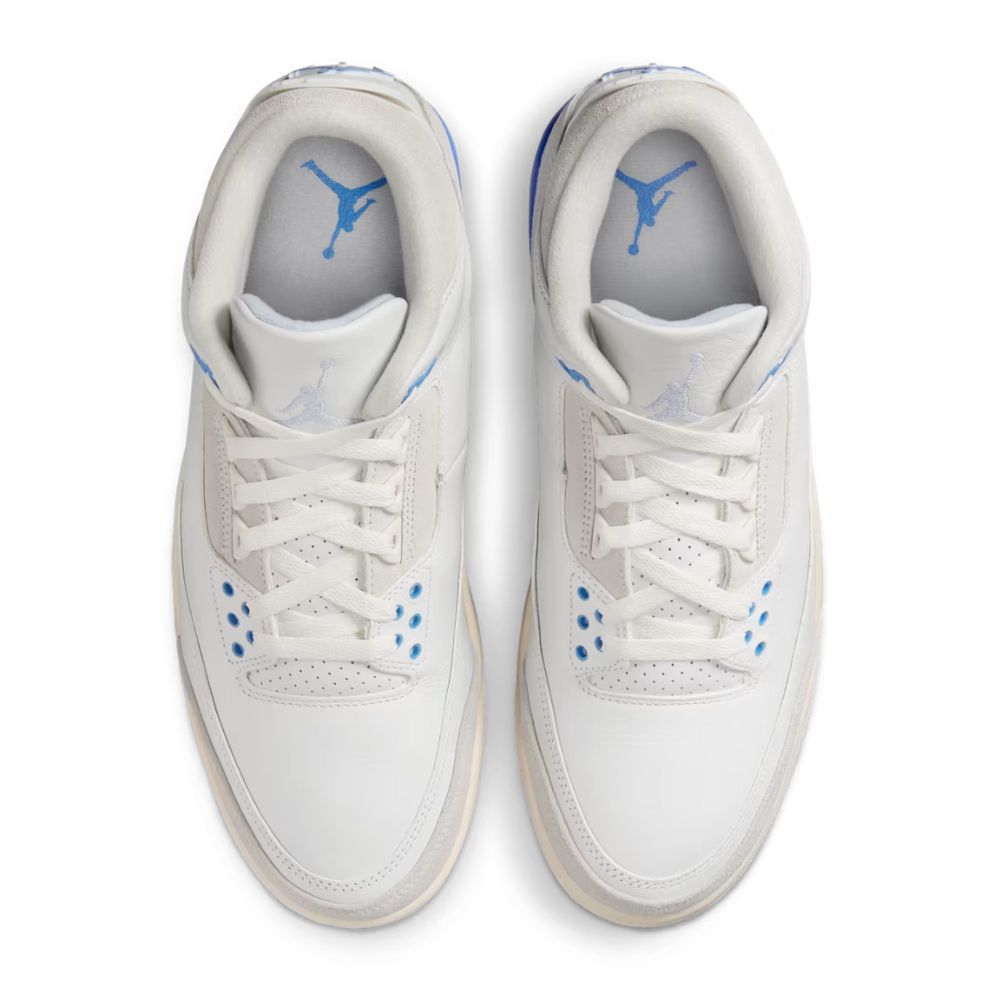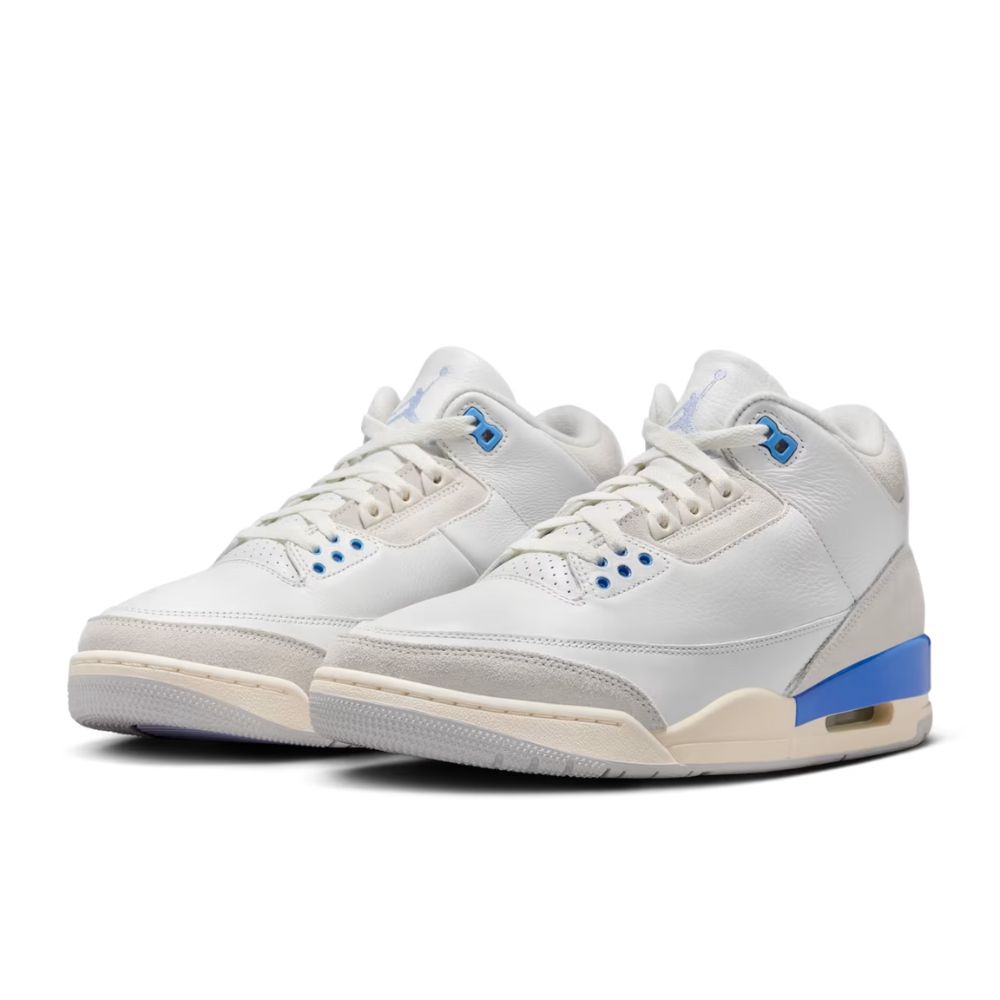 Inspired by Michael Jordan's lucky UNC practice shorts, the new Air Jordan 3 features UNC's iconic blue and white. This release honors Jordan's college roots and legendary NBA career, incorporating subtle design details reminiscent of his famed shorts.