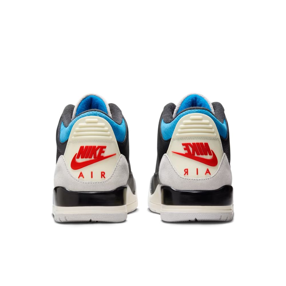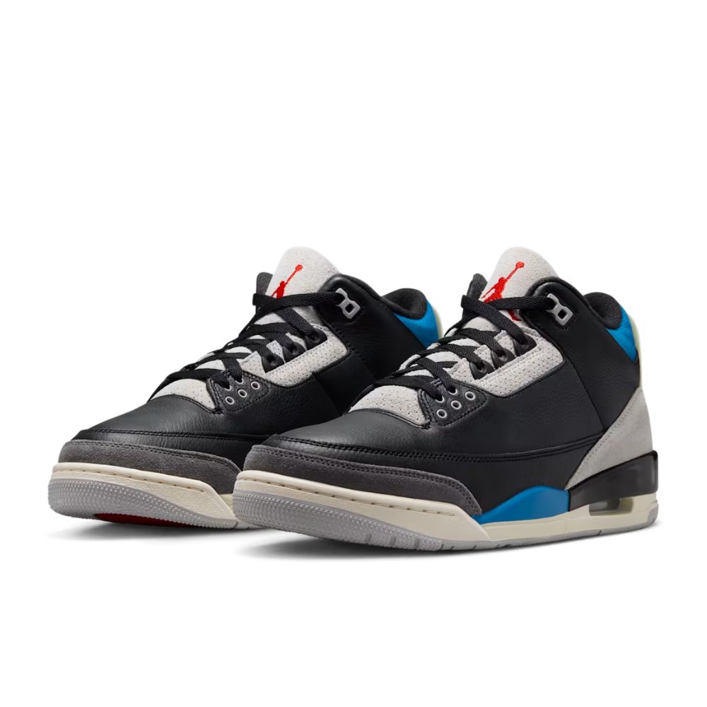 Summer 2025 drops the Air Jordan 3 OG "Rare Air," boasting a Black nubuck base with Grey and Military Blue accents. Reverse Nike Air branding on the right shoe adds a unique twist to this fresh colorway featuring Chile Red and Coconut Milk details.