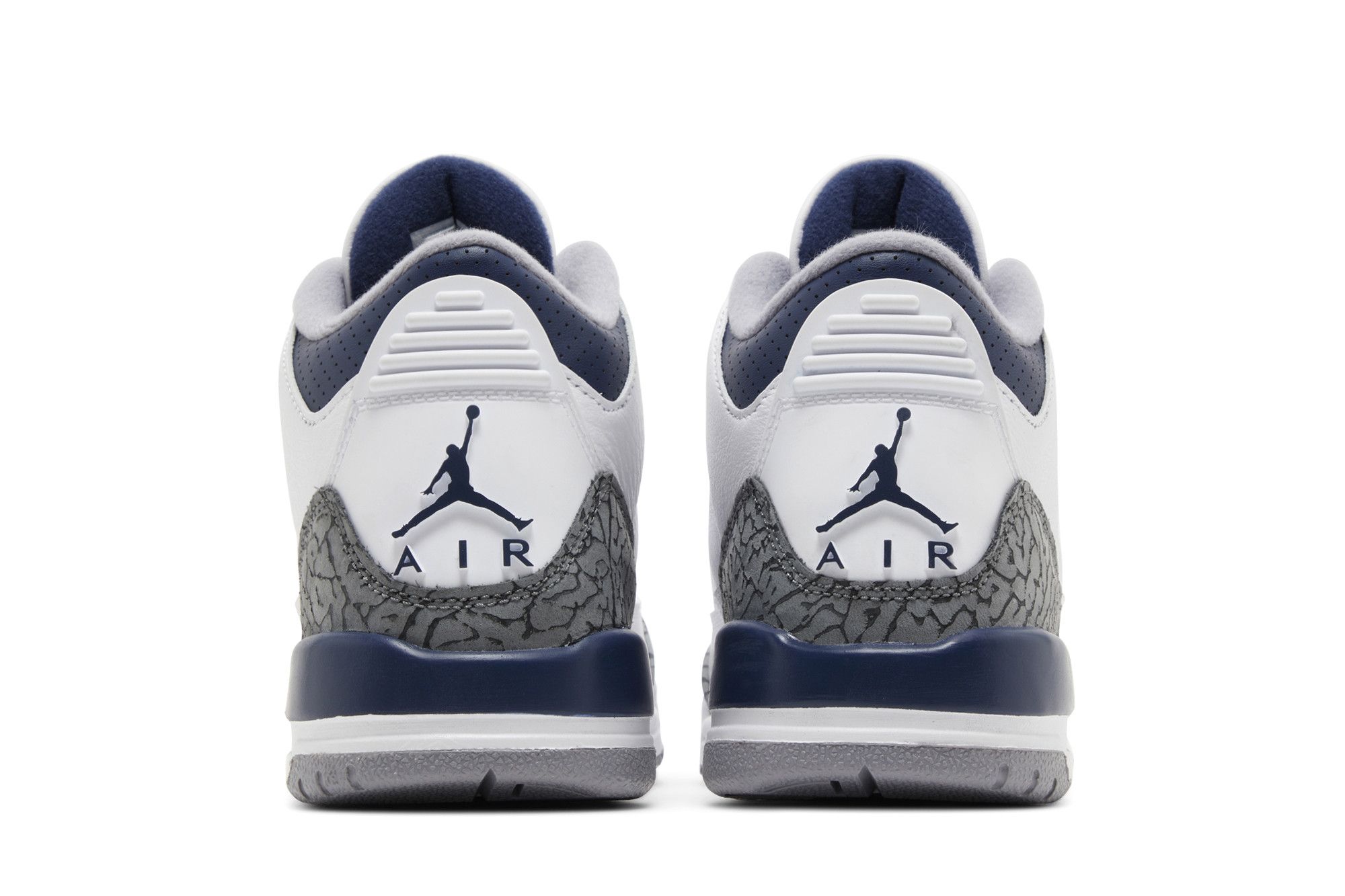 In grade school sizing, the Midnight Navy Air Jordan 3 Retro features a white leather base adorned with elephant print overlays on the toe and heels. Cement Gray perforations on the eyestays and tongues add a classic touch. The design is accentuated by Midnight Navy contrasting elements on the eyelets, collars, Jumpman branding on the tongues and heels, as well as the midsole and underfoot. The shoe is rounded off with a white midsole housing a visible Air heel unit, all set atop a Cement Gray rubber outsole.