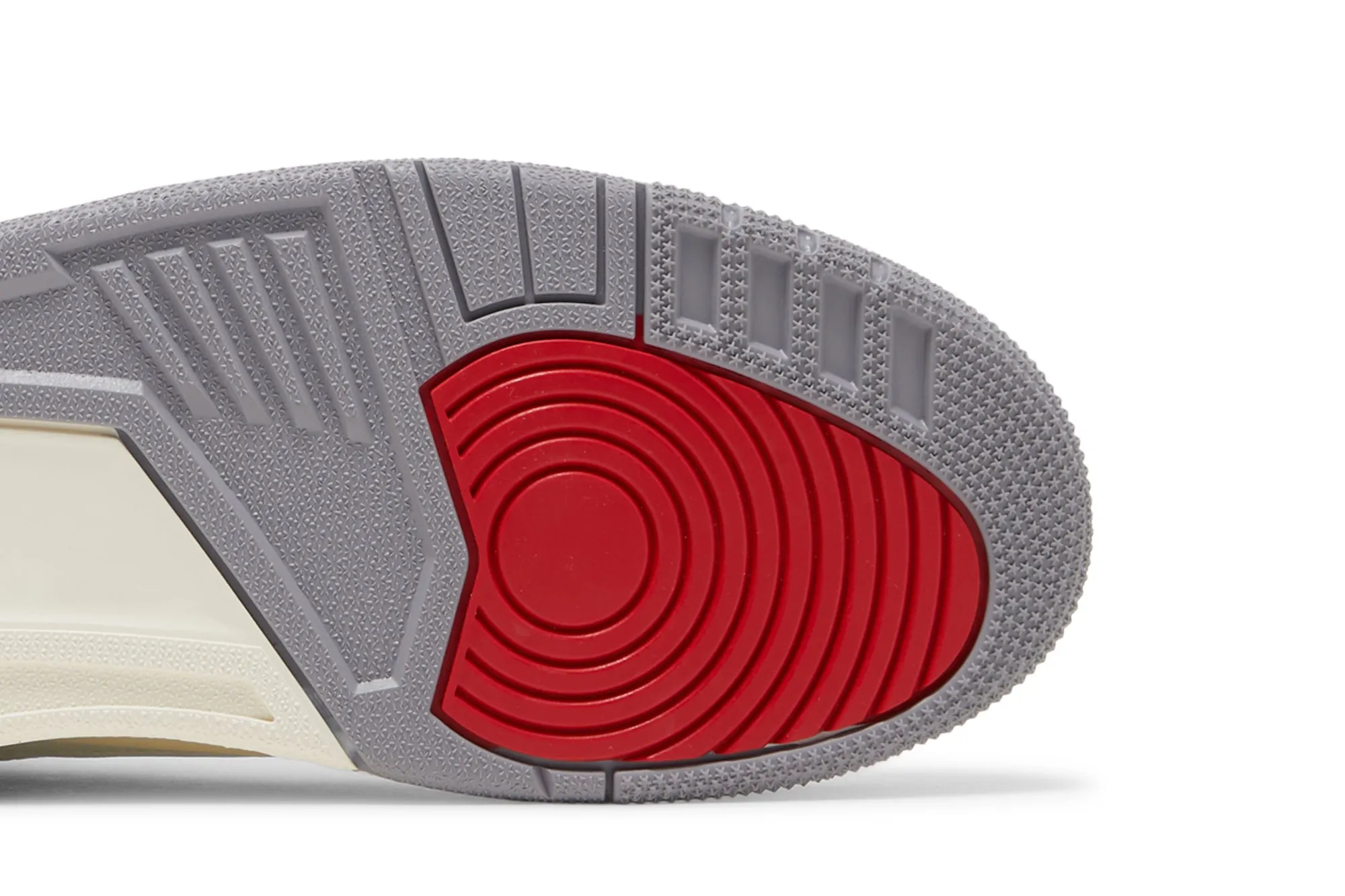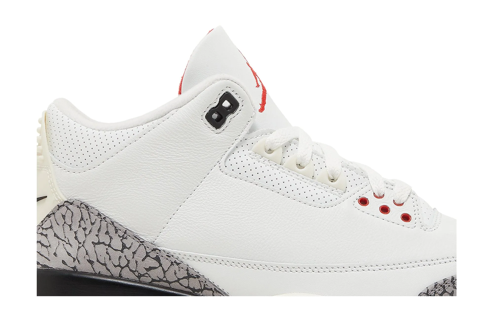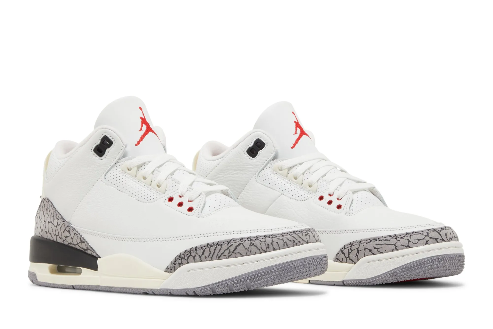 The Air Jordan 3 Retro ‘White Cement Reimagined’ brings back one of the original colorways, celebrating the 35th anniversary of the AJ3. Designed by Tinker Hatfield, the Reimagined iteration is built to the original 1988 specs. Returning true to form, the white leather upper pairs with elephant print overlays on the heel and toe while hits of Varsity Red appear on the lace loops and the Jumpman logo on the tongue. Nike Air is emblazoned on the back heel tab, while a visible Air unit provides lightweight cushioning. A slight hint of yellowing appears on the back heel and midsole, giving the shoe a vintage look.