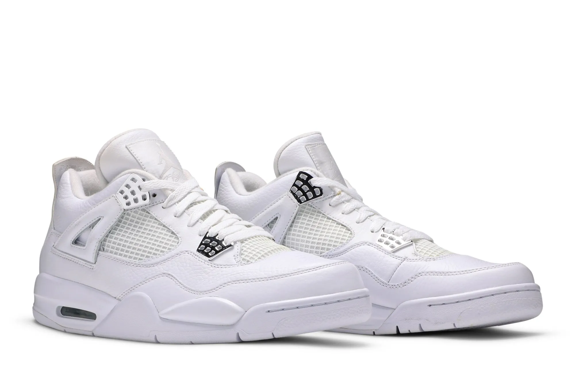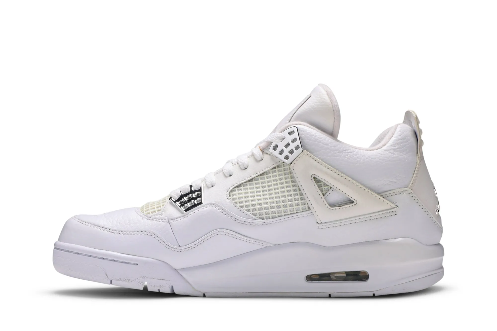 The Air Jordan 4 got the triple-white treatment in 2010 to celebrate the brand’s 25th Anniversary. The tumbled-leather upper, iconic netting, and visible Air Sole unit are presented in pristine white while metallic silver accents adorn lace hole accents on either side.