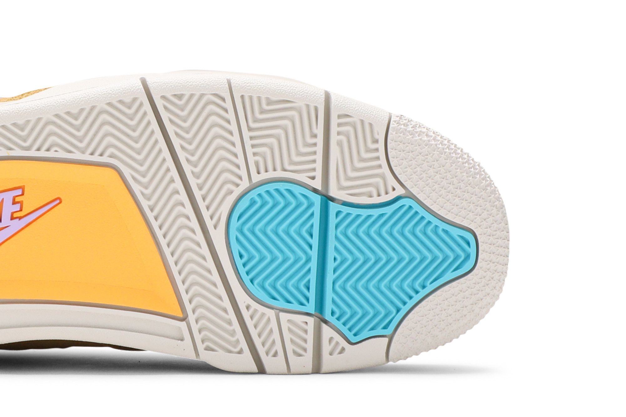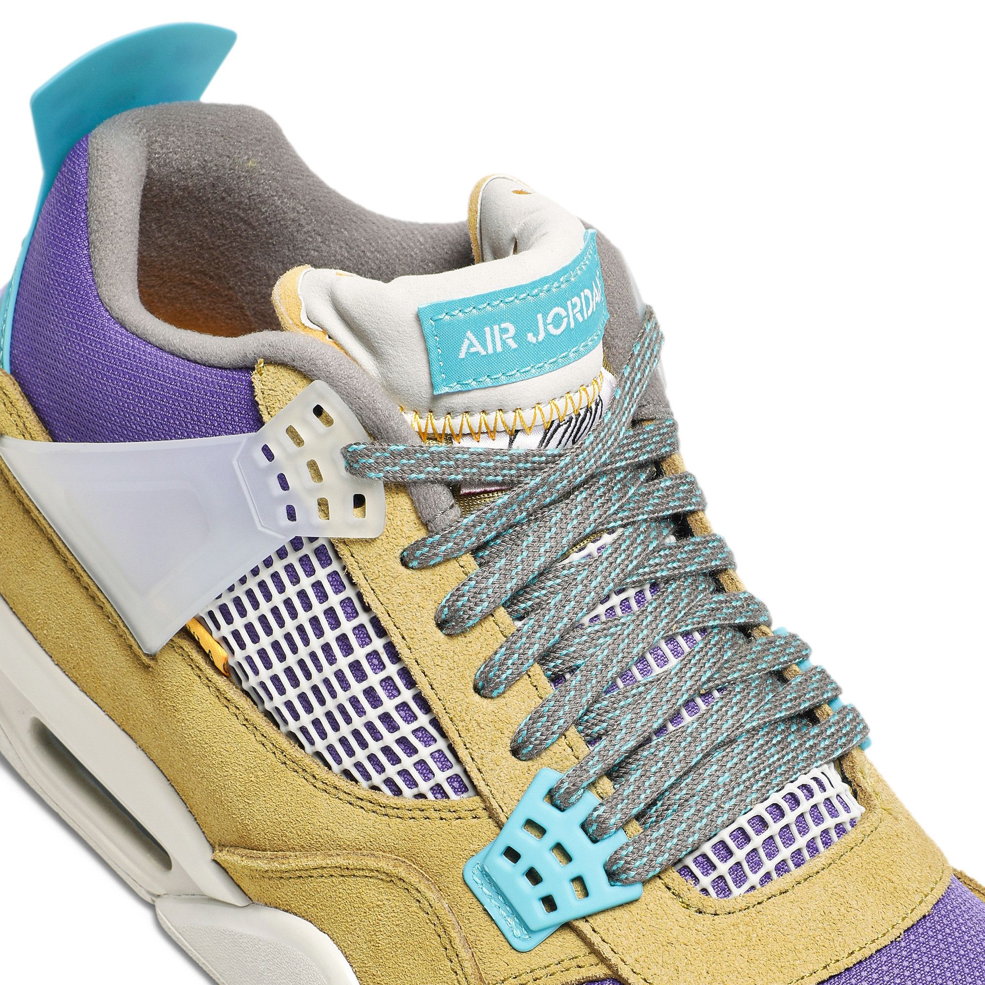 The Air Jordan 4 Union LA Desert Moss features a Dark Iris mesh upper with Desert Moss suede overlays and translucent lace loops. From there, turquoise heel tabs and Union LA woven tabs on the lateral side complete the design.
