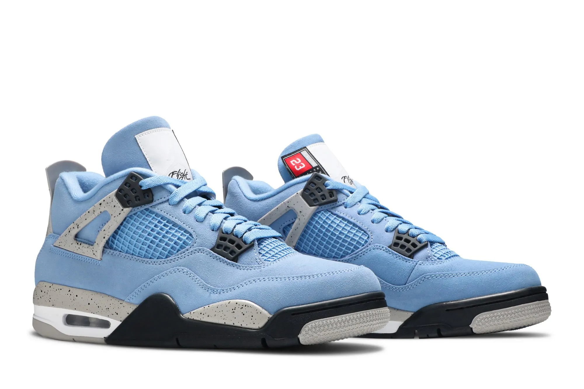 The Air Jordan 4 Retro ‘University Blue’ updates the classic silhouette with a suede upper in a familiar hue inspired by Michael Jordan’s UNC alma mater. The bright blue palette is contrasted by a speckled grey finish on the sneaker’s supportive wings and back heel, featuring a raised Jumpman icon in black. Secondary Jumpman branding adorns the woven tongue tag, designed to mimic a jock tag that typically appears on the bottom hem of Jordan jerseys.