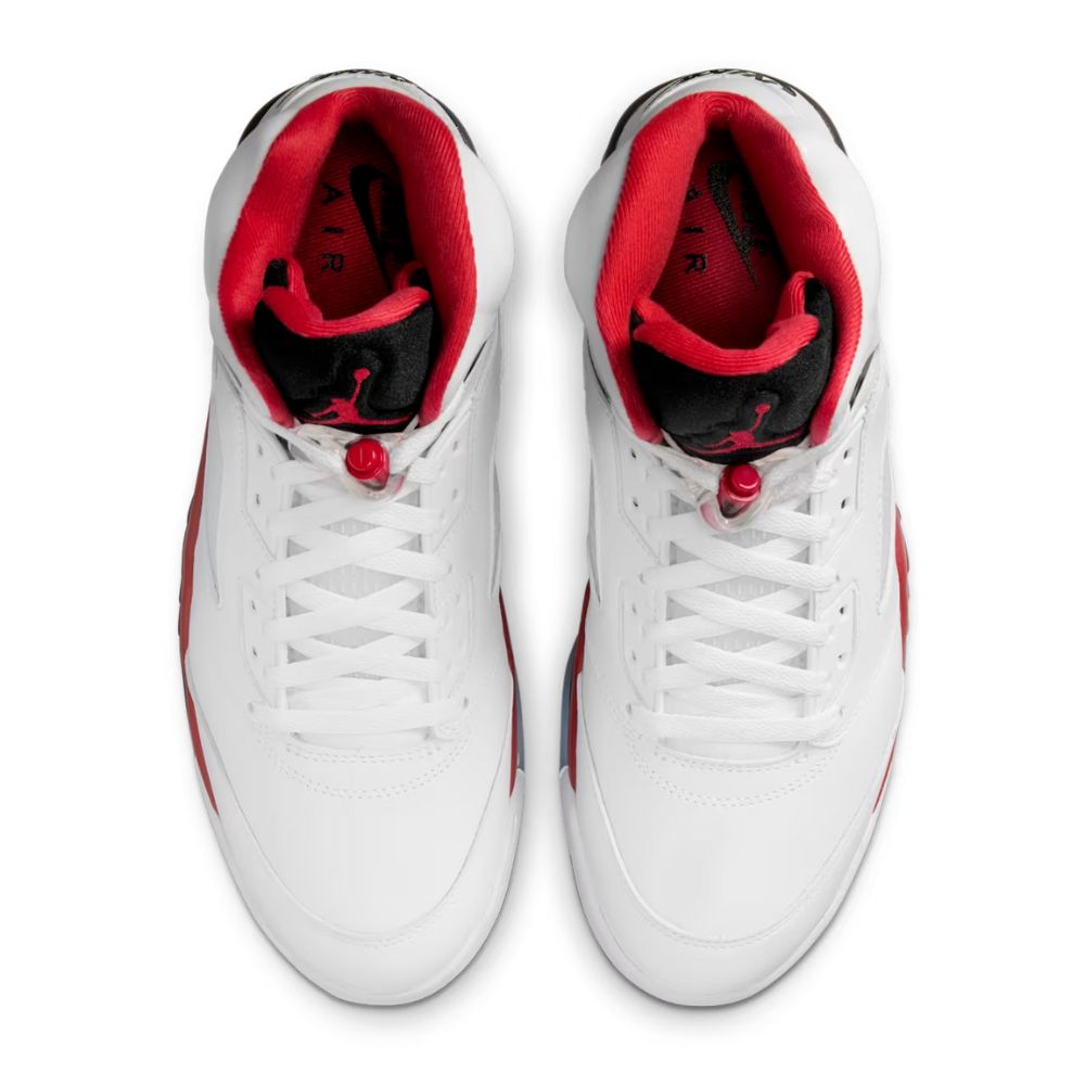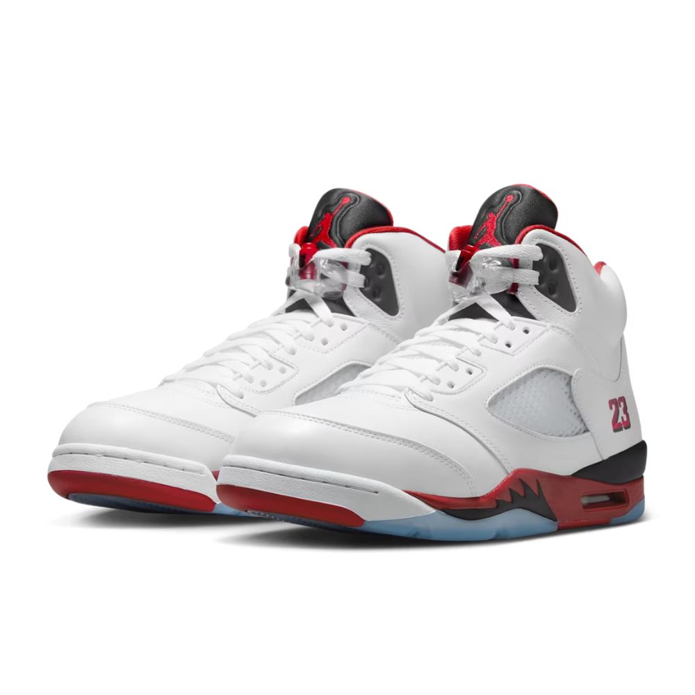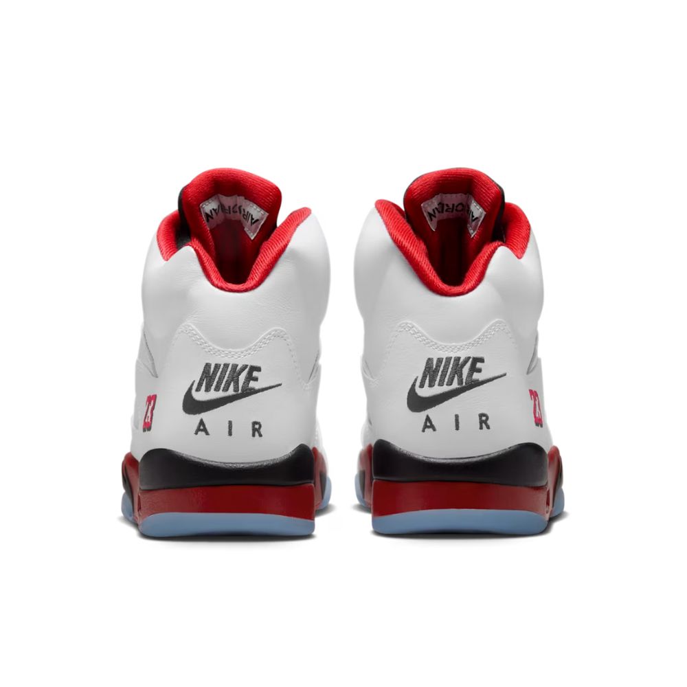 Returning in Fall 2025 for its 35th anniversary, the Air Jordan 5 Fire Red "Black Tongue" rekindles a legendary colorway. Premium white leather, black tongue, and fire red accents create a timeless design. Iconic details like the "23" embroidery and Nike Air branding complete this classic sneaker.