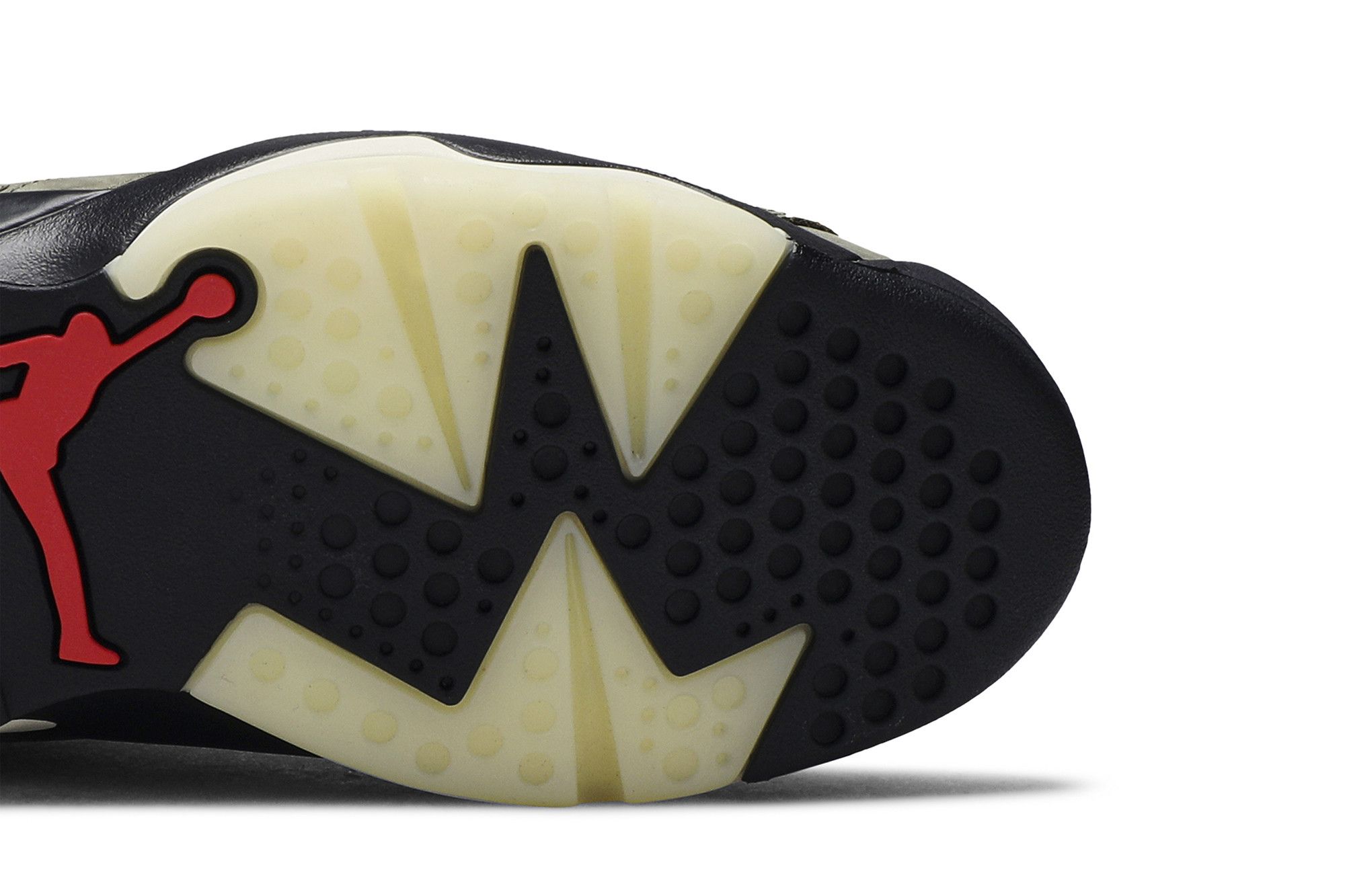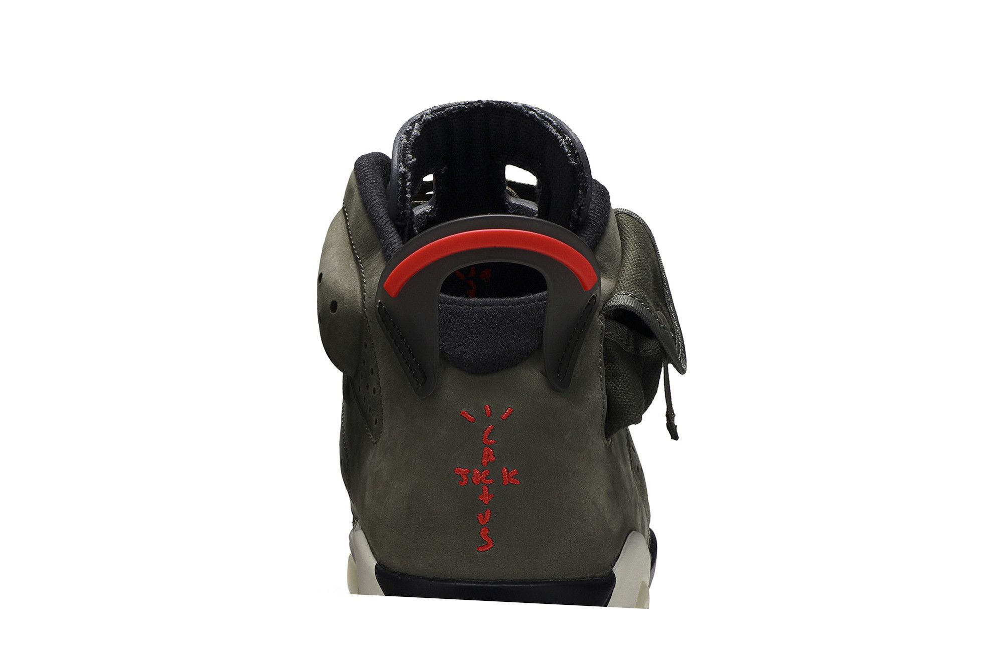 Dressed in military green nubuck, the Nike Air Jordan 6 "Medium Olive" is the third collaboration between Nike and rapper Travis Scott. The pair introduces stylish details such as cargo pouches around the collar, glow-in-the-dark outsoles and vibrant red lace locks.