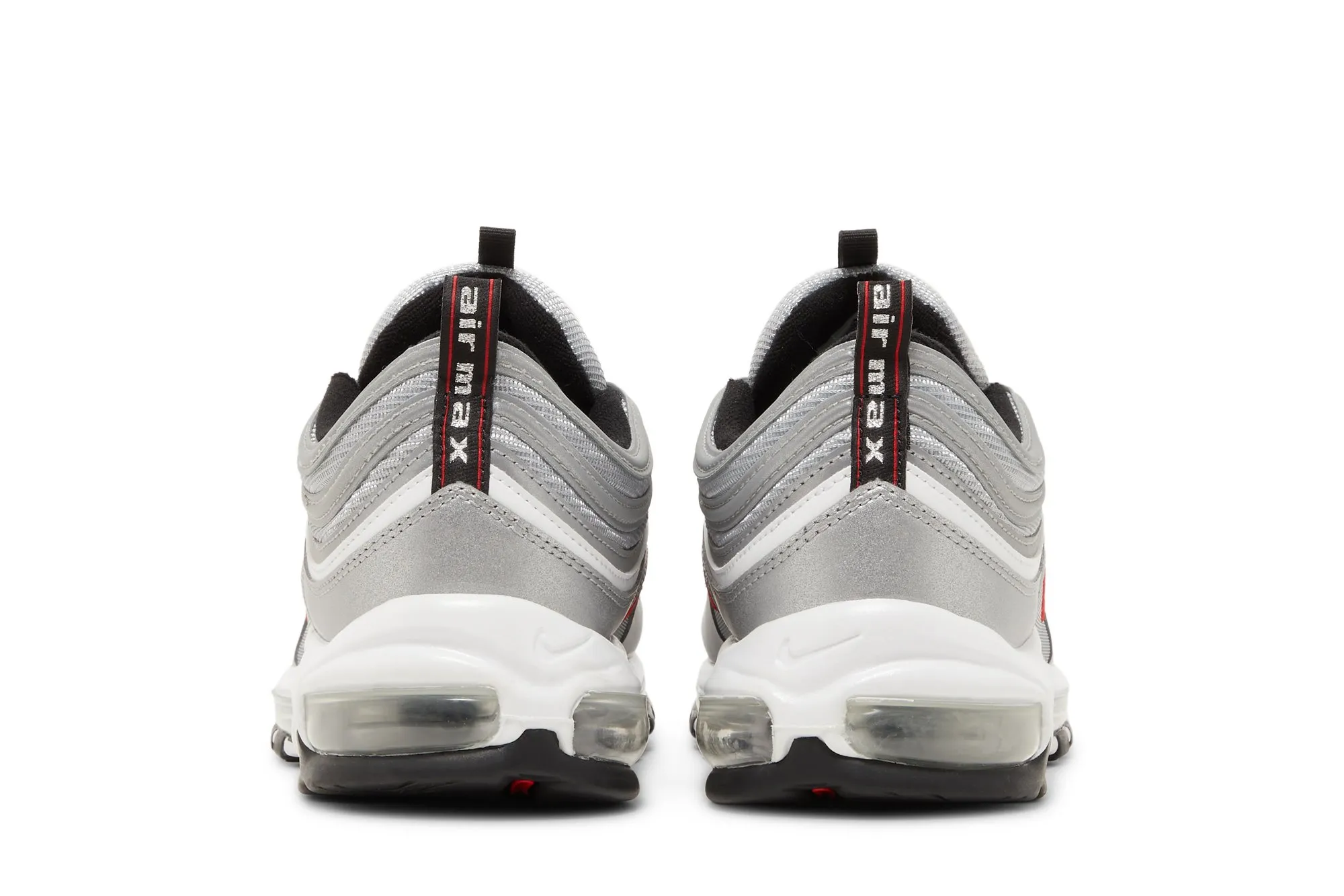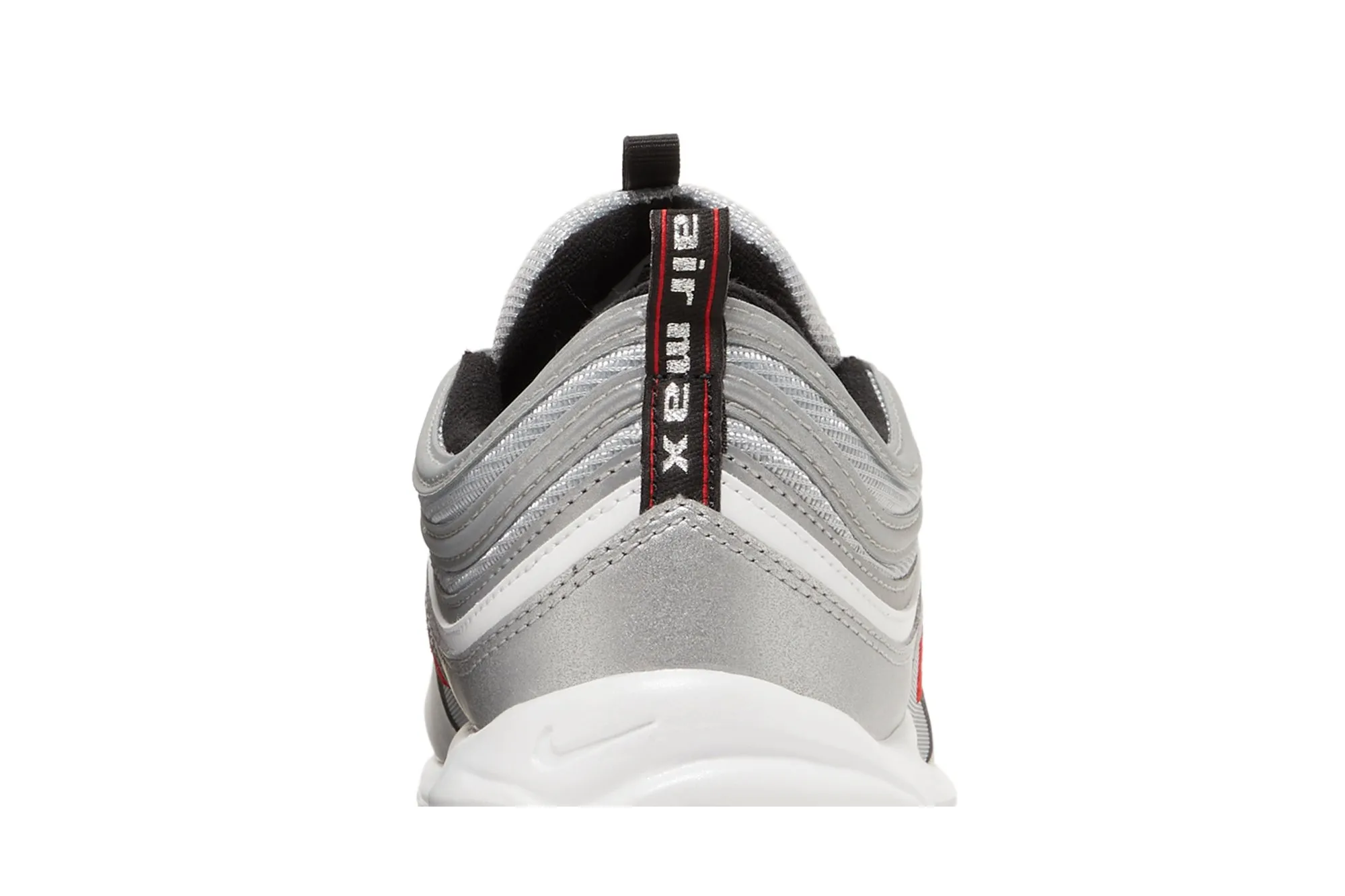 The 2022 edition of the Nike Air Max 97 OG ‘Silver Bullet’ brings back the iconic colorway of the first ever running shoe built with a visible full-length Nike Air unit. The revolutionary tooling is nearly overshadowed by the distinctive upper, featuring a metallic silver finish inspired by a mountain bike’s aluminum and titanium components. Atop the breathable mesh base, wavy overlays are meant to replicate the look of radiating lines caused by a water droplet hitting the surface of a pond. A crimson Swoosh is embroidered on the tongue and quarter panel, adding color-popped accents to the polished exterior.