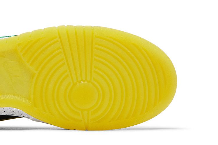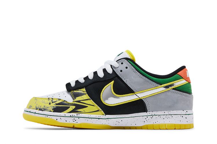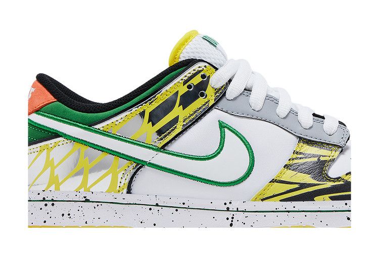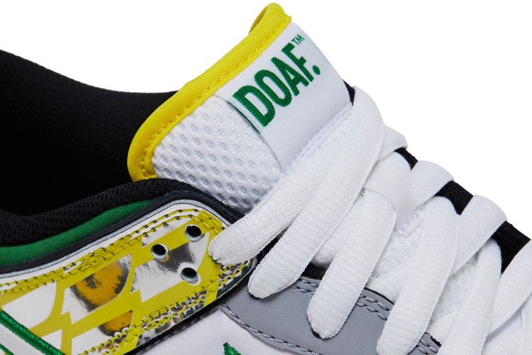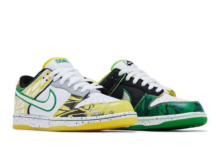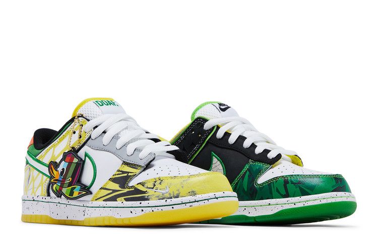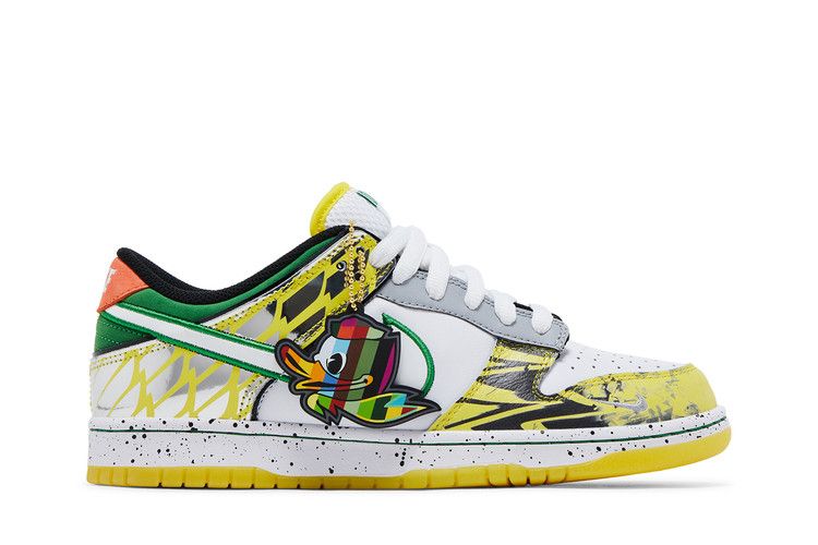 The Dunk Low 'What the Duck – University of Oregon Away' PE pays homage to the University of Oregons archive of football uniforms, symbolizing the programs tradition of wearing new uniforms for every game. More than 11 different designs are referenced across the left and right shoes. Details include a collar informed by the schools Fighting Duck mascot and 2016s ‚Å“The Duck‚ kit; a panel that recreates the topographic-map print found on 2015s ‚Å“Oregon Pioneer‚ kit; and an elephant print midfoot Swoosh that recalls both Tinker Hatfields Air Jordan 3 and the teams ‚Å“Jumpman‚ ensembles from 2018. Created in partnership with Division Streets Ducks of a Feather, abbreviated ‚Å“DOAF‚ branding is embroidered on the left heel tab and right tongue tag.