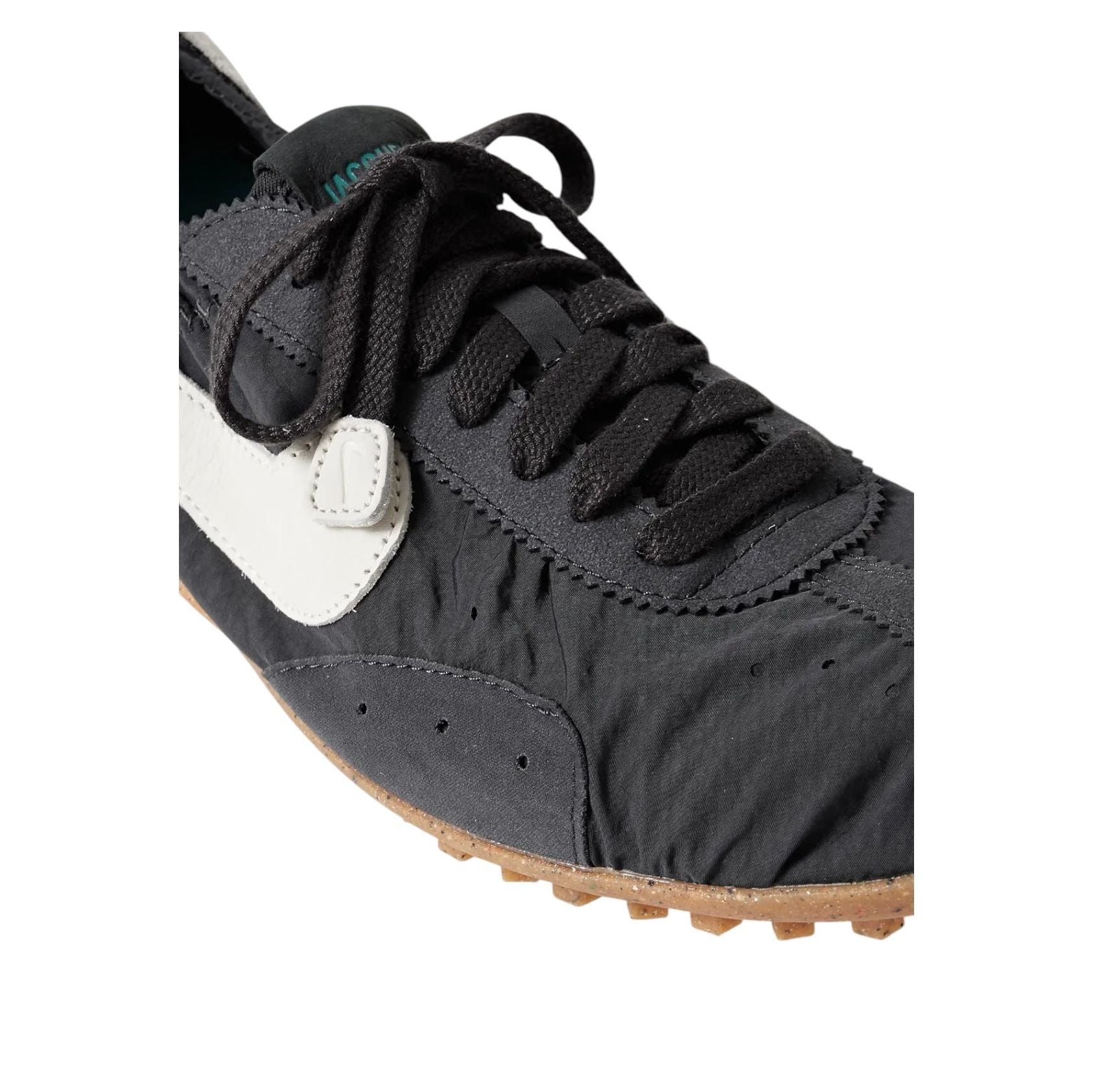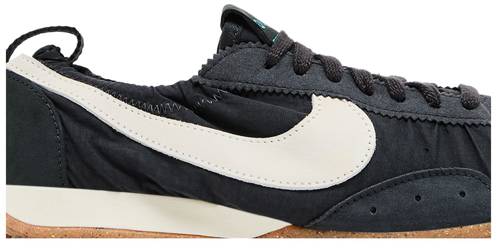 The Jacquemus x Nike Moon Shoe Off Noir HV8547-001 is the darkest and arguably most wearable entry from the trio. Built on the same archival Moon Shoe framework designed by Bill Bowerman in 1972, this colorway takes a deep off-noir base and pairs it with cashmere, gum light brown, neptune green, and hydrogen blue accents — a layered earth-toned approach that rewards close inspection. The ruched nylon upper introduces texture that's more couture than sneaker, which is precisely Jacquemus' signature move. A leather Swoosh and heel counter give the shoe structure, while the Nike Regrind outsole grounds it in sustainability. This is one of three colorways released October 6th 2025, and the Off Noir quickly became the most-hyped among sneaker purists who want something understated but deeply layered. Retail was $180. For collectors who want the history of Nike's first shoe told through a fashion lens, HV8547-001 delivers.