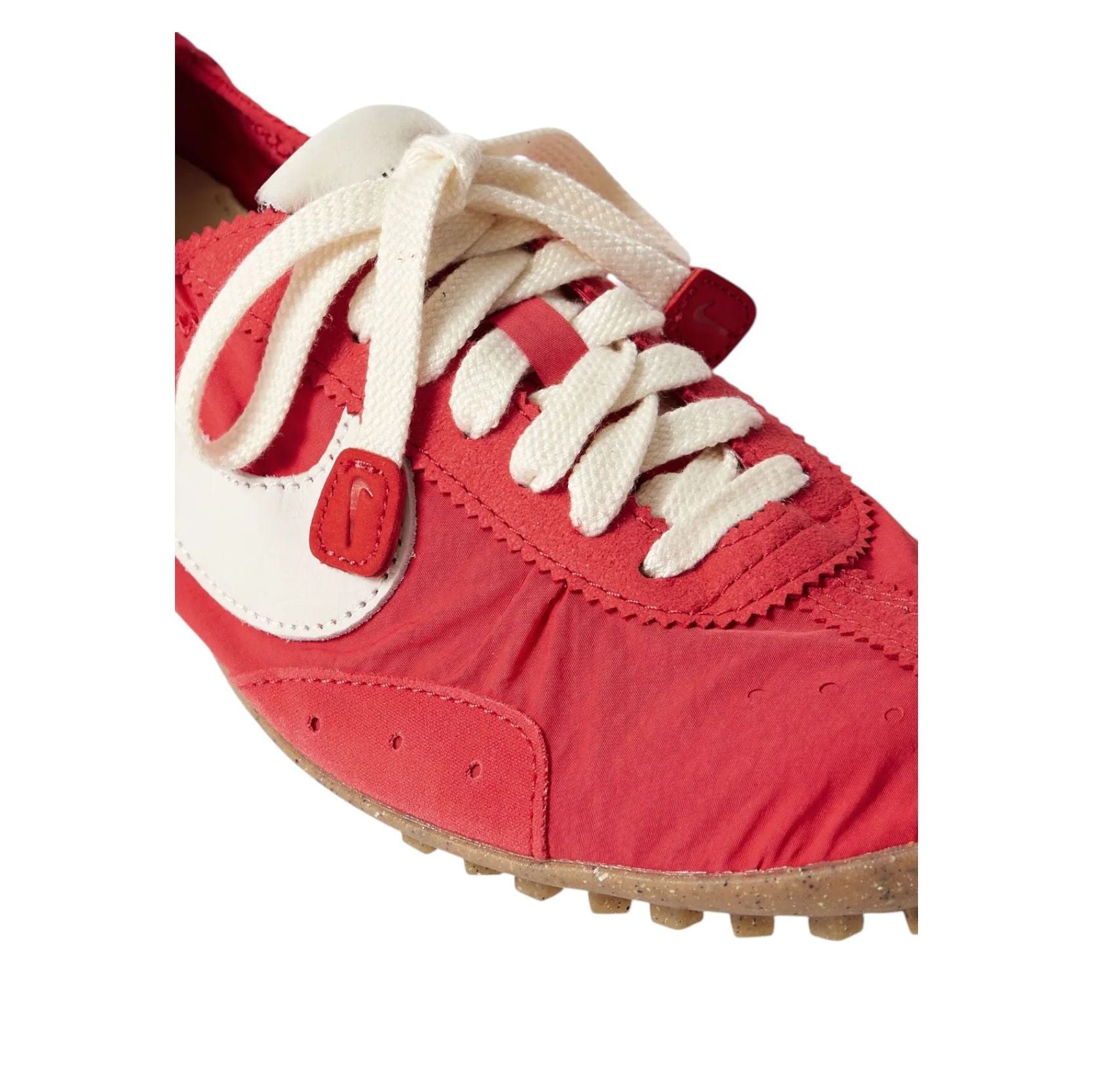 The Jacquemus x Nike Moon Shoe University Red HV8547-600 is a fashion collab built on sneaker history that doesn't get more foundational than this. Bill Bowerman's 1972 Moon Shoe — only 12 pairs ever made, originally hand-crafted for Olympic Trials athletes — finally gets a proper retro treatment via Simon Porte Jacquemus. The University Red colorway splashes across a ruched nylon upper, giving the silhouette a textural depth that contrasts sharply with the bicycle yellow and gum light brown accents. A black leather Swoosh and Jacquemus branding on the tongue tag elevate it into fashion territory. The Nike Regrind rubber outsole pays respect to the original waffle-inspired tread pattern. Dropped October 6th 2025 at $180, this collab marks one of Nike's most historically significant retro projects in recent memory. HV8547-600 is for collectors who want something that means something.