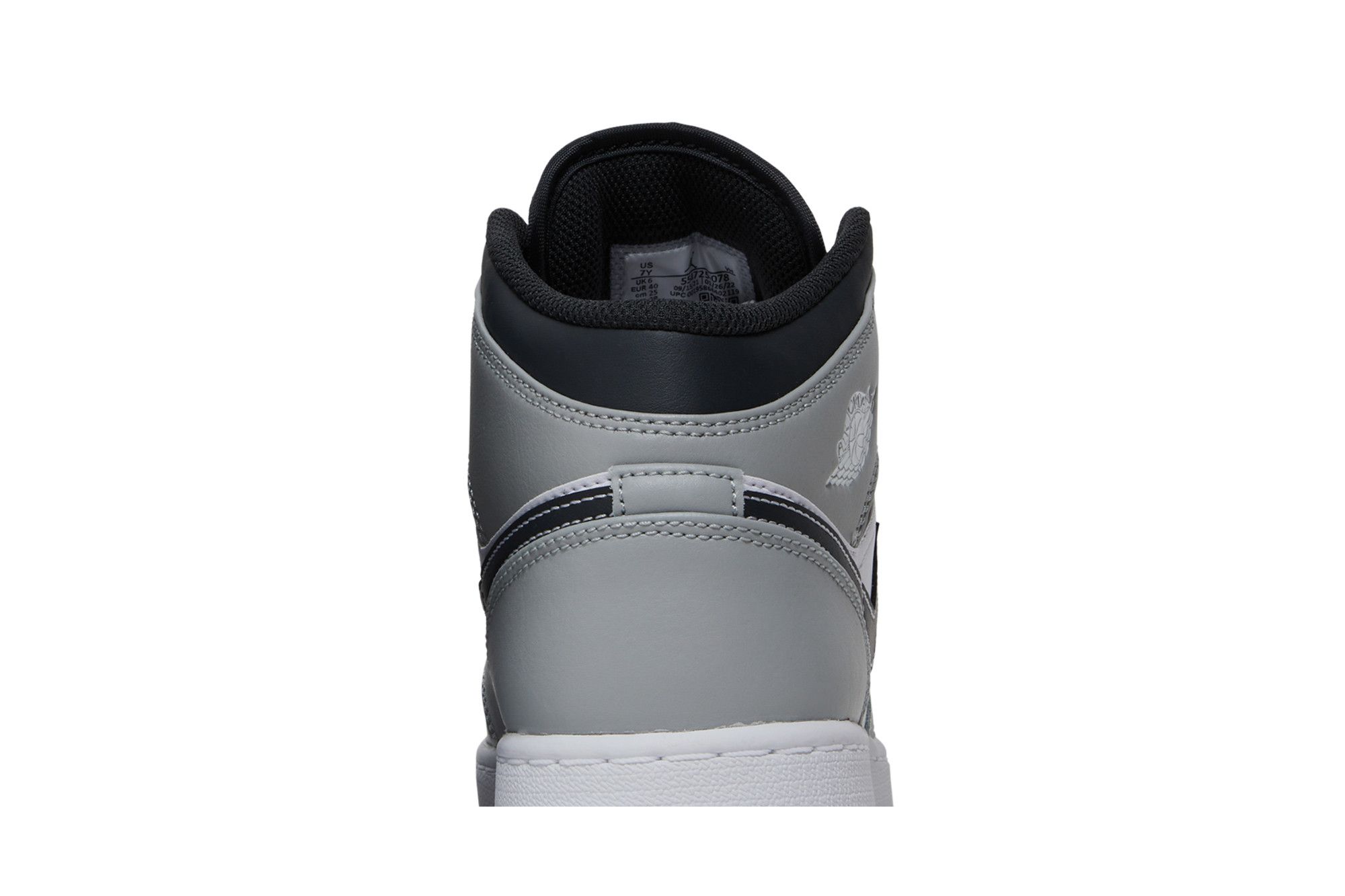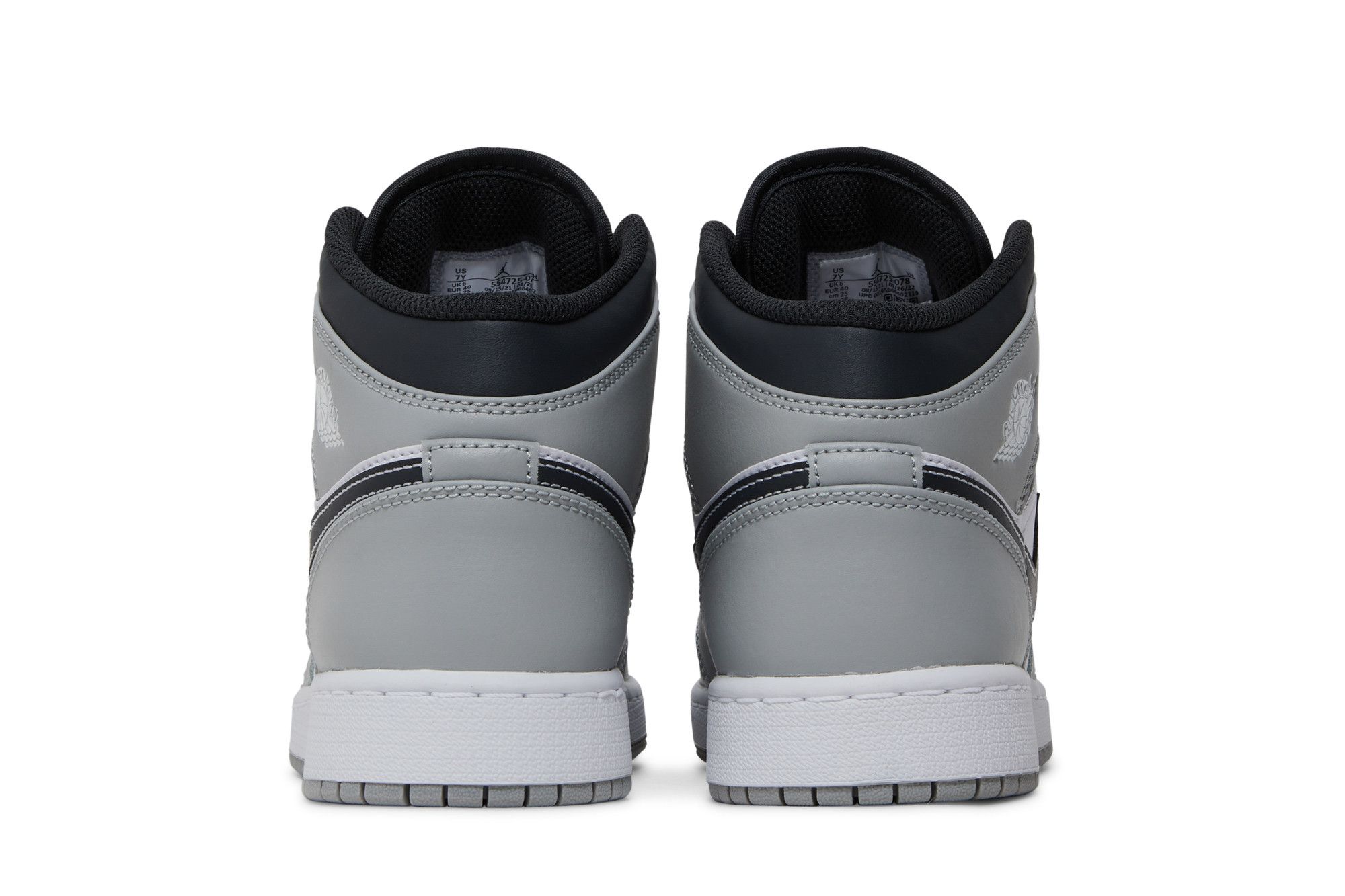 The Air Jordan 1 Mid Greyscale (GS) for grade schoolers has a gray tongue surrounded by black fabric.