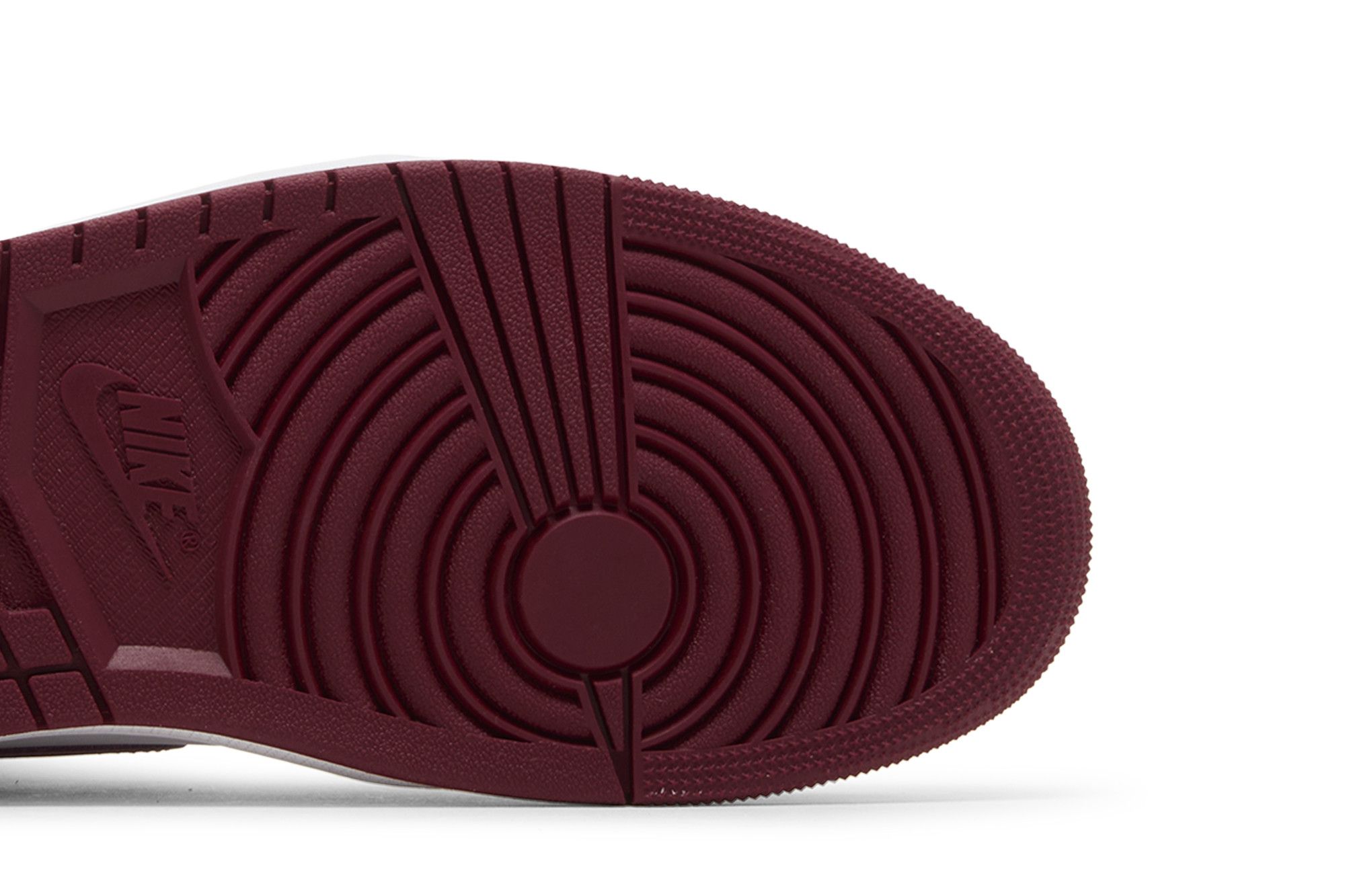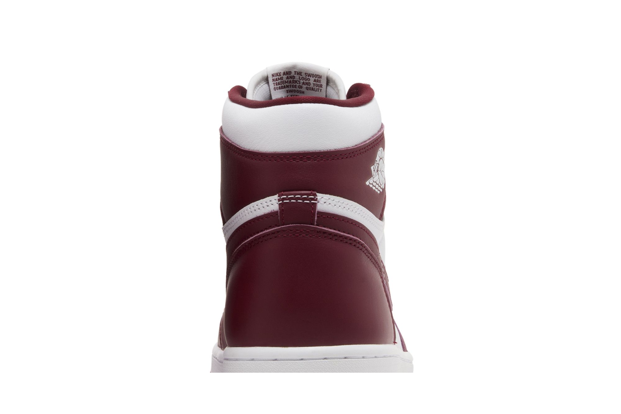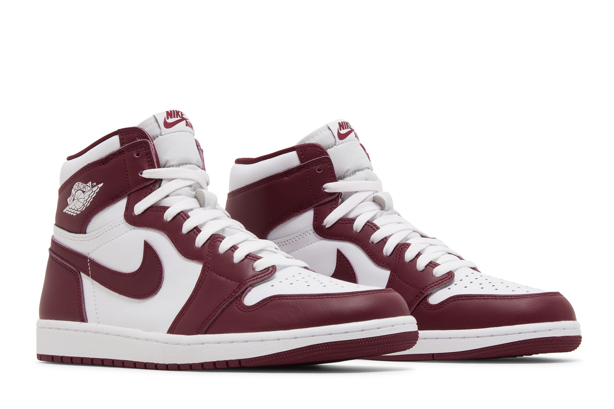 This iteration of the Jordan 1 Retro High OG is made with a leather upper. The base of the upper is white on the sides, toebox, and around the heel, and the toebox contains perforations for air flow. Smooth red leather overlays adorn the upper, outlining the toebox, snaking up under the laces, supporting the heel, and acting as the ankle strap. The Nike Swoosh that appears on both sides is also red. White Air Jordan branding can be found on the outer red ankle strap. The cushioned tongue contains a Nike Air patch, and the rubber sole is patterned for traction.