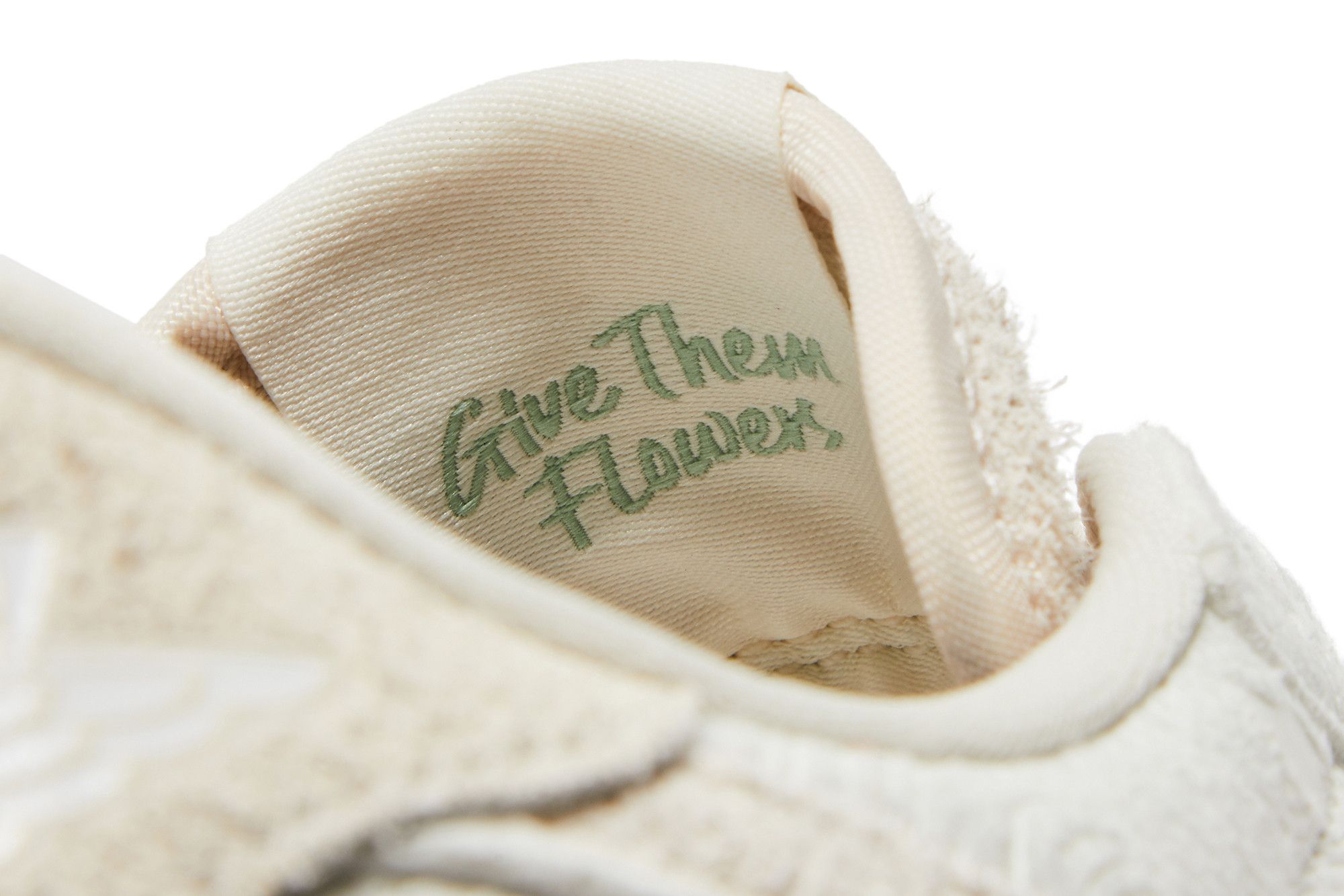 Chris Paul’s AJ 1 Retro Low OG stands out due to its neutral color scheme and intricate floral details. In fact, the sneaker is often referred to as the Chris Paul "Give Them Flowers" and features a colorway of Light Cream and Sail with bright floral prints on the insole. Floral paisley patterns that almost look embossed cover the leather upper. The Swoosh, tongue, vamp, and heel tab come in a shaggy suede that gives the shoe a soft appearance.