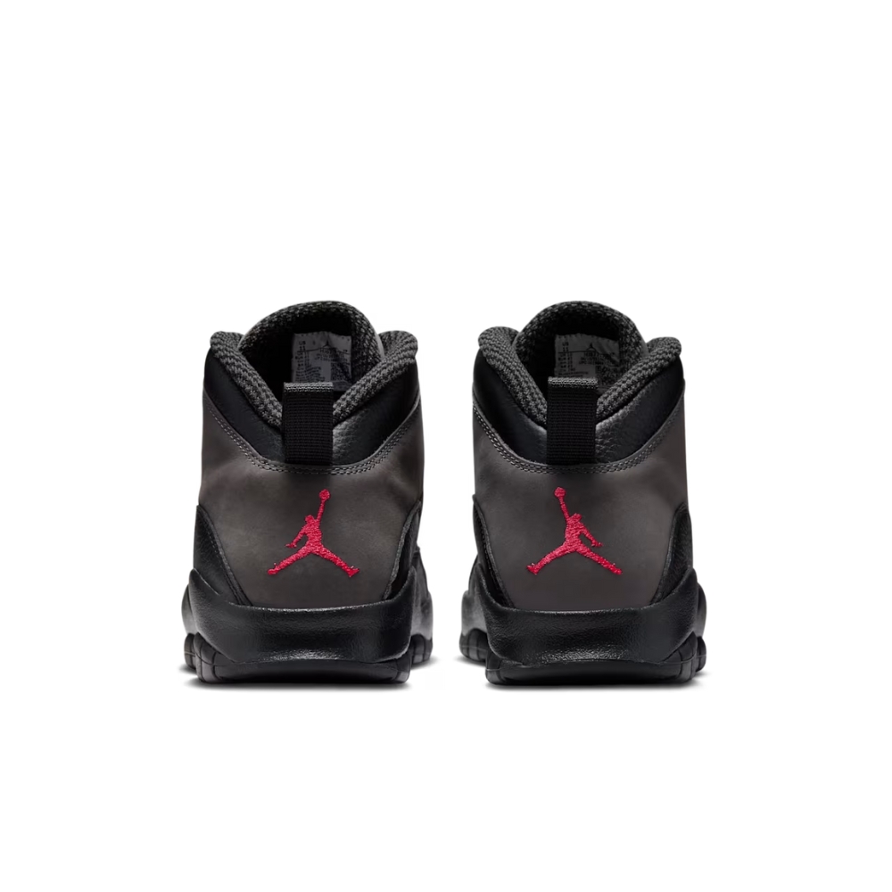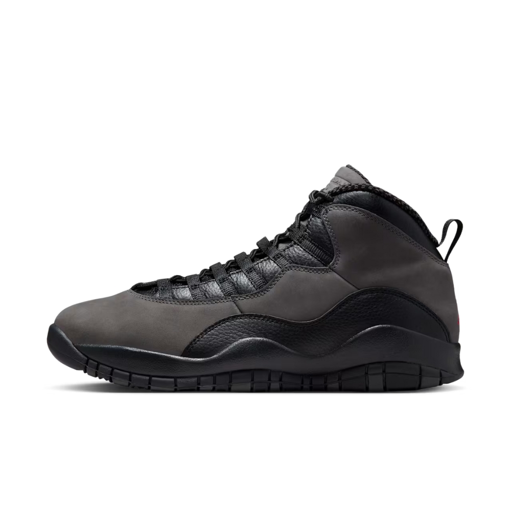 Air Jordan 10 'Shadow' designed by Tinker Hatfield during Jordan's first retirement, features a sophisticated blend of black rolled leather and charcoal grey suede. This 1994 retro retains the distinctive outsole detailing Jordan's early career achievements, complete with a full-length Nike Air cushioning unit.