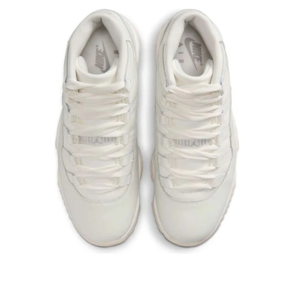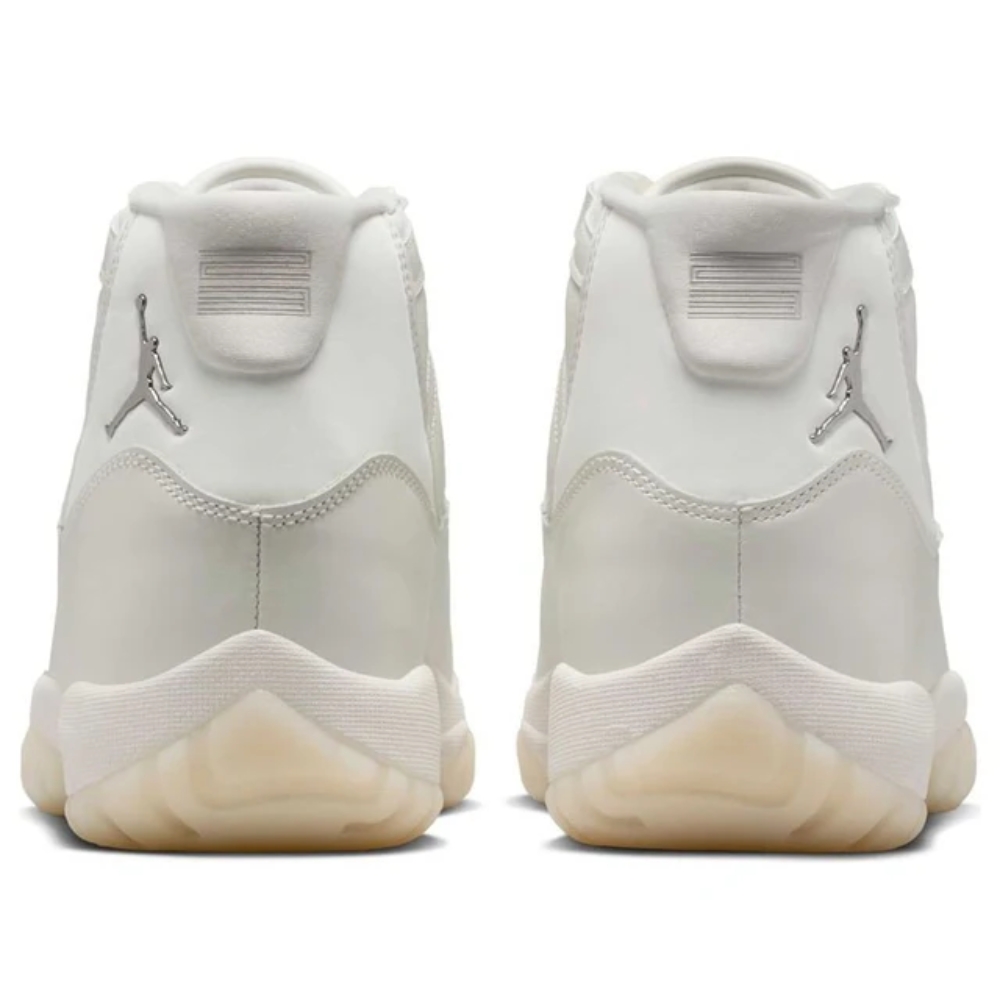 The elegant Jordan 11 "Pearl" combines style and comfort in a sophisticated Sail, Pearl Grey, and White palette. The upper features premium white leather contrasted by a sleek sail patent leather mudguard, offering a polished finish. With Metallic Silver Jumpman branding and a semi-translucent outsole, this release reflects the brand's commitment to quality and timeless design, fitting any look during the holidays.