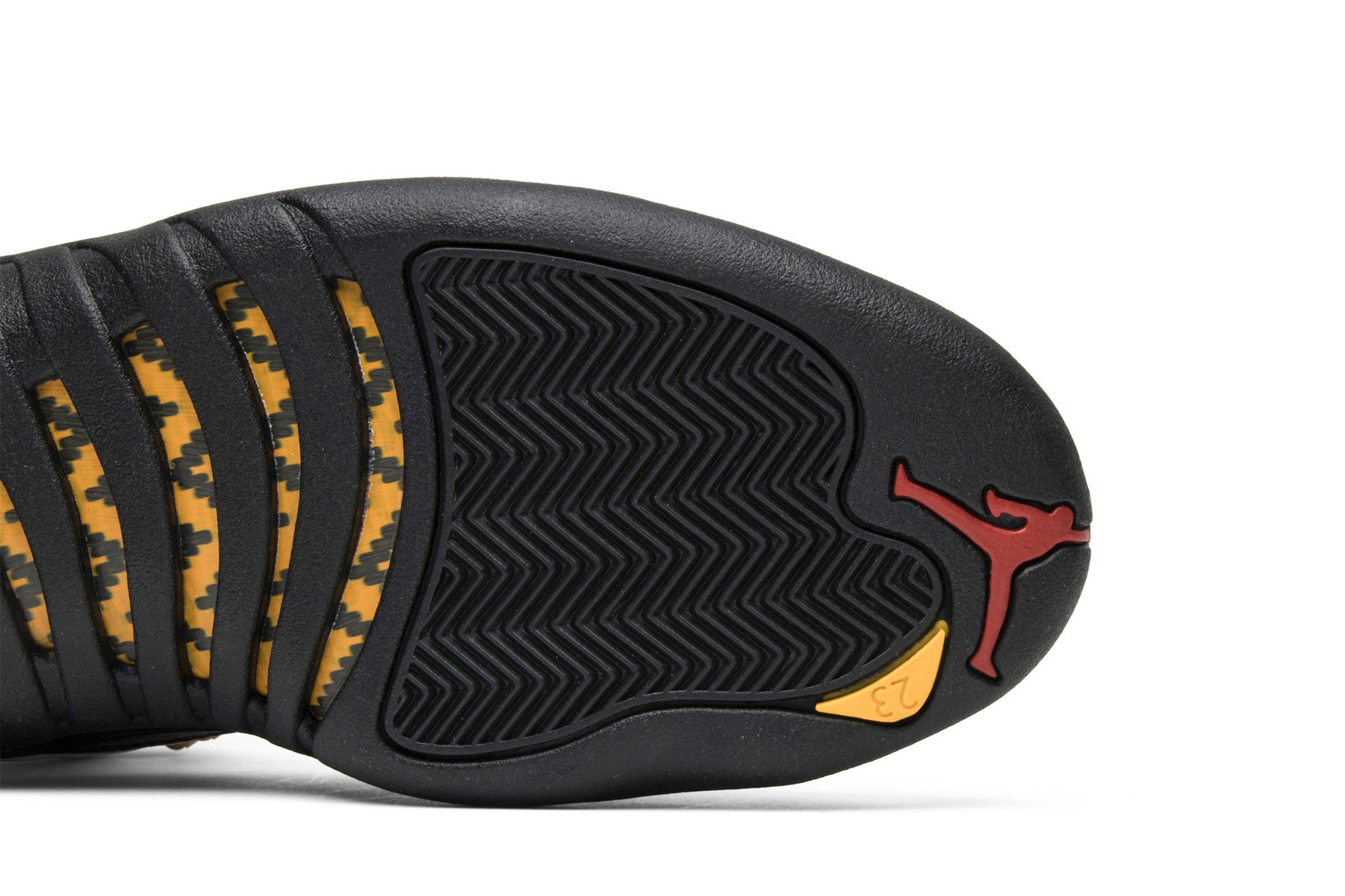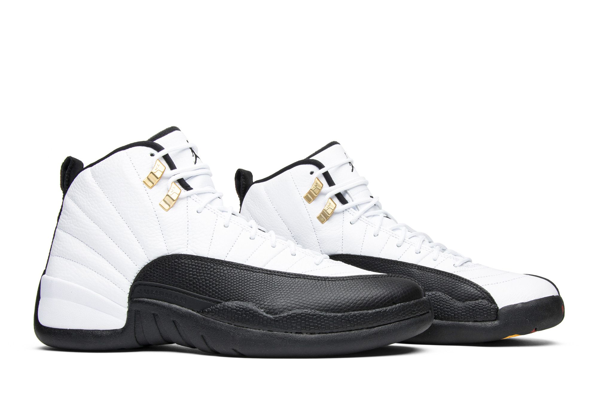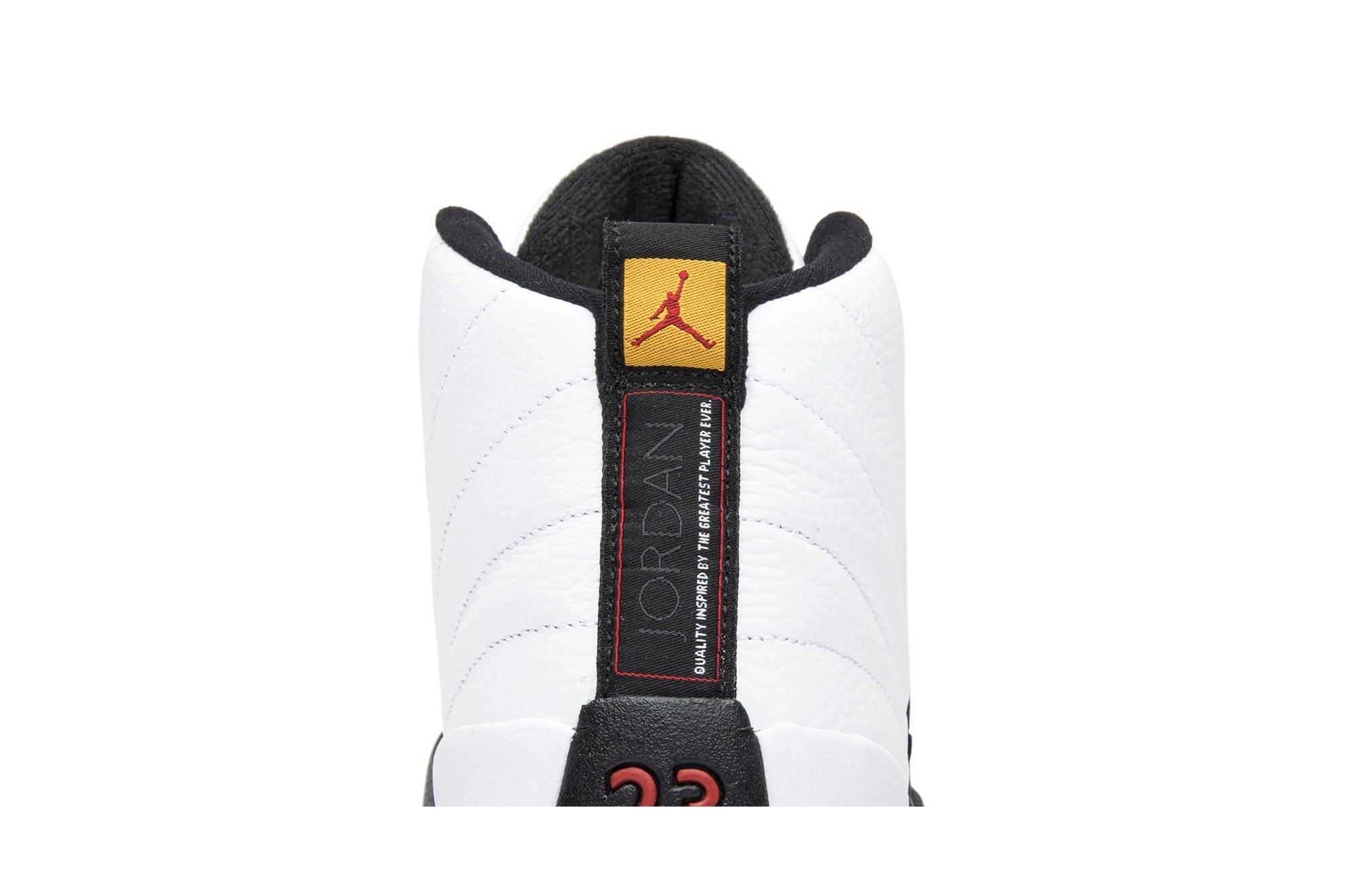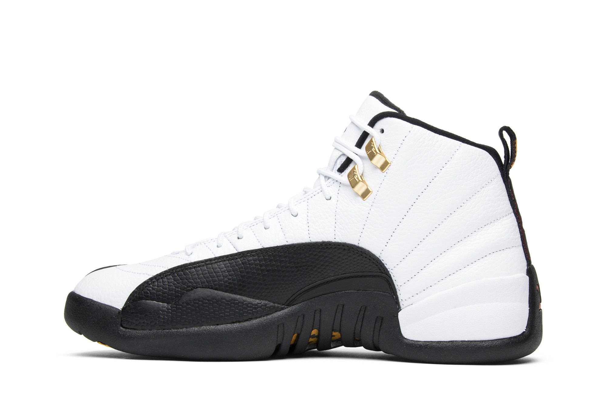The Air Jordan 12 Retro Taxi 2013 features a a black outsole, metallic gold eyelets, and a white upper. The heel strip is styled with a red '23' on a black backdrop and a yellow/red Jumpman emblem. Jordan 12 Retro Taxi 2013 release shoes pay tribute to Michael Jordan's 5th championship season (1996 - 1997). The mostly black sole includes a yellow/black design and the iconic Jumpman logo in red.