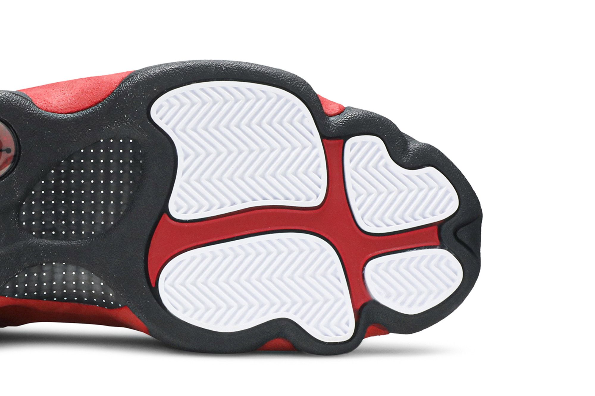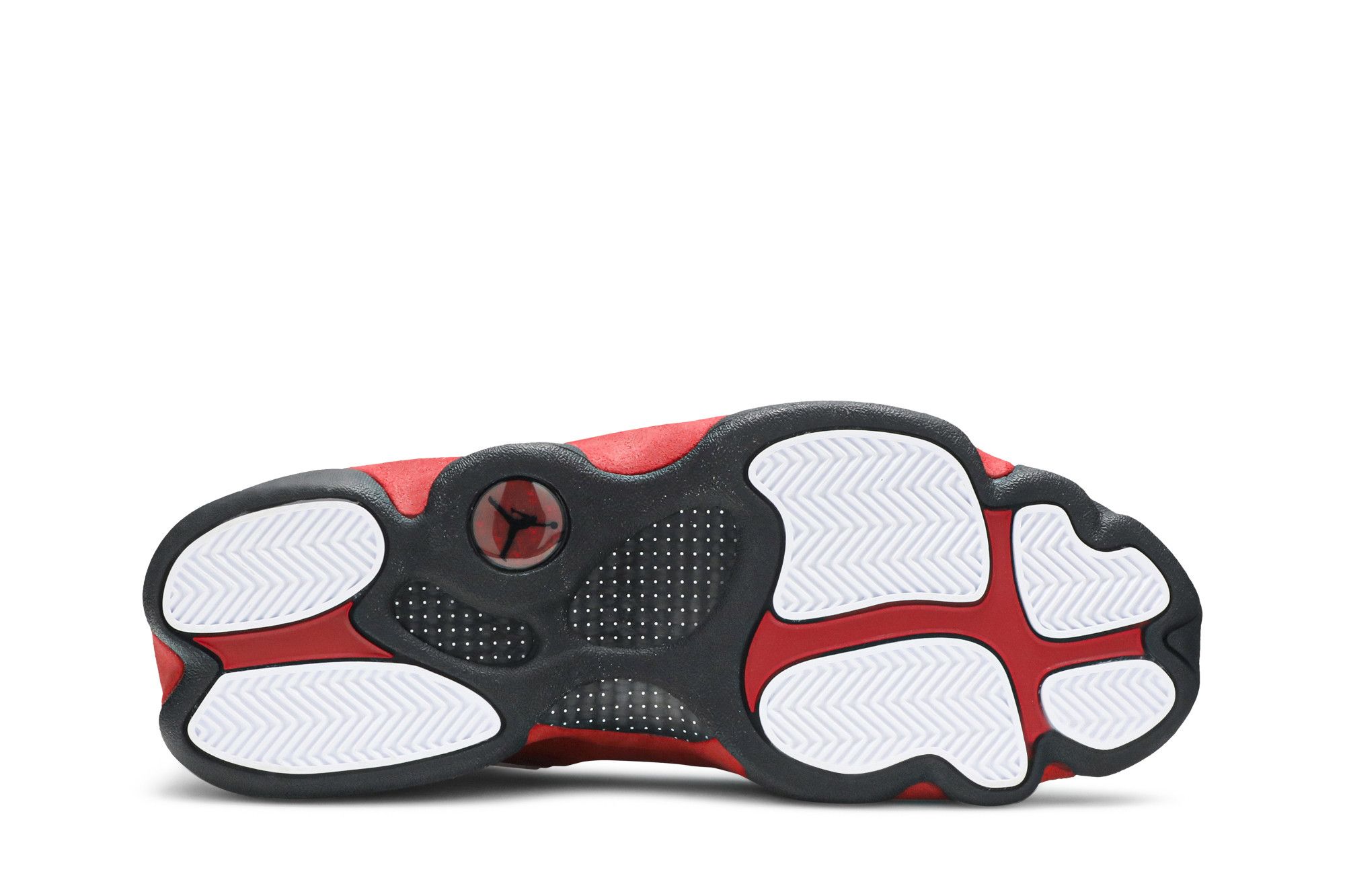 The Cherry Jordan 13 Retro (2010) features a classic color scheme, boasting a white leather upper contrasted by rich Varsity Red suede accents on the mudguard, midsole, and heel. The sneaker also features a distinctive touch with its unique holographic cat's eye on the heel and provides comfort with its responsive Zoom Air unit. Additionally, the shoe features a rubber outsole with a herringbone traction pattern. Completing the Chicago Bulls-inspired look are the black Jumpman logo on the tongue and the black outsole, giving fans a chance to relive a historic moment in basketball and sneaker culture.
