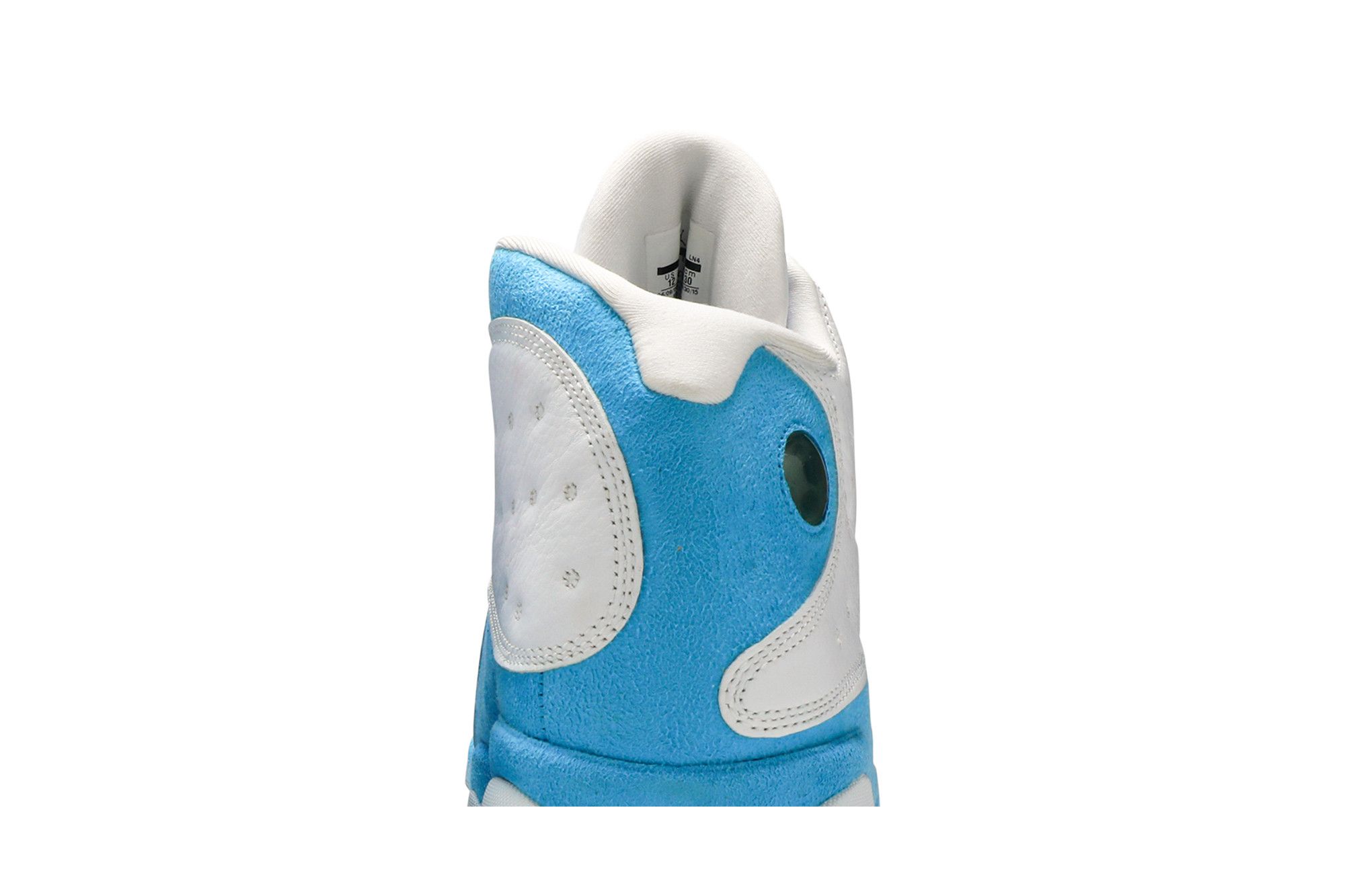 The shoe has a predominantly white upper made from a combination of leather and suede material, both of which give the shoe a luxurious touch. The white base is complemented by light blue details which cover the heel area as well as the mudguard and midsole. The shoe retains a few Air Jordan 13 design elements such as the holographic eye on the ankle area as well as the dimpled pattern across the upper.