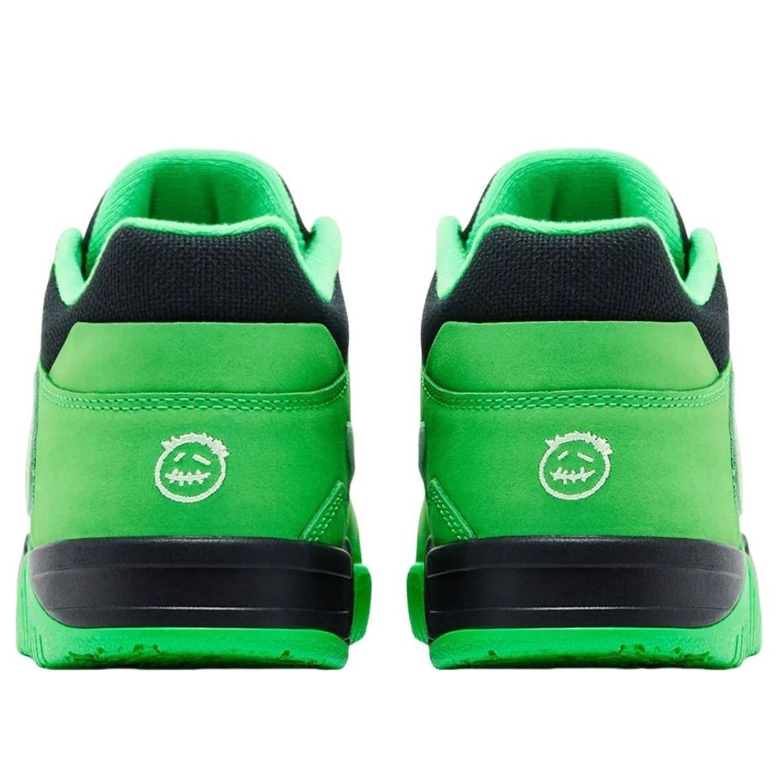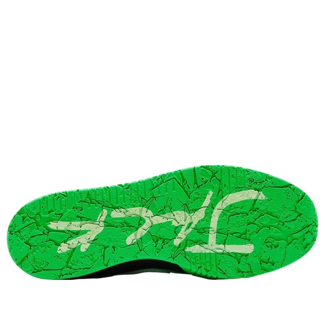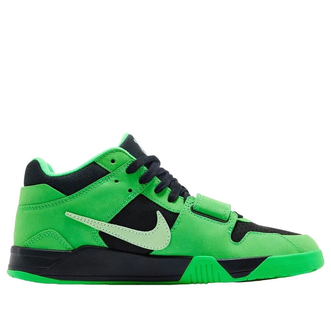 The Jordan Jumpman Jack TR "Green Spark" — dubbed the "Celtics" edition by fans — is Travis Scott's boldest Jumpman Jack colorway yet, pivoting hard from his signature palette of earthy browns and neutrals. First spotted on La Flame's feet courtside at TD Garden during Game 2 of the 2024 NBA Finals, the shoe waited nearly two years before hitting retail. The upper is built from breathable black suede and mesh with perforated detailing on the toebox for airflow. Green Spark overlays in nubuck wrap the toe, heel, and eyestays, while a lighter Vapor Green coats the signature reverse Swoosh on the lateral side. The forefoot lace strap — a hallmark of the cross-trainer-meets-skate-shoe design — provides lockdown support, and the Cactus Jack face logo stamps the heel. Hidden beneath the outsole rubber, the word "Jack" reveals itself as the sole wears down. A green rubber outsole and black-painted midsole round out the aggressive, court-ready build.