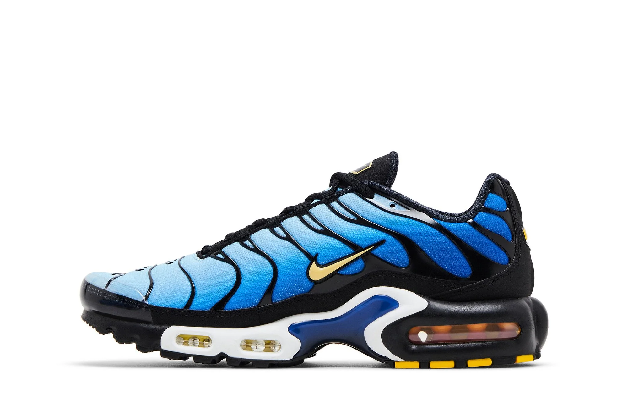 The 2025 edition of the Nike Air Max Plus 'Hyper Blue' brings back an OG colorway of the lifestyle running shoe, designed by Sean McDowell and added to the Air Max dynasty in 1998. A gradient blue finish is executed on the mesh upper, overlaid with navy TPU 'fingers' inspired by palm trees swaying in the wind. Branding elements include a yellow mini-Swoosh and the iconic hexagonal Tn Air badge on the back heel. The sneaker rests on a white and black polyurethane midsole, fitted with orange-tinged Air-sole units and a prominent shank plate that evokes a whale's tail protruding from the water. Experience all-day comfort and timeless style with this versatile Nike sneaker, engineered to keep up with your every move. Blending iconic design with responsive cushioning, it’s perfect for everything from morning commutes to weekend adventures. Whether you’re dressing up or keeping it casual, this sneaker delivers the perfect balance of performance, durability, and everyday style—so you can stay sharp, confident, and comfortable all day long.