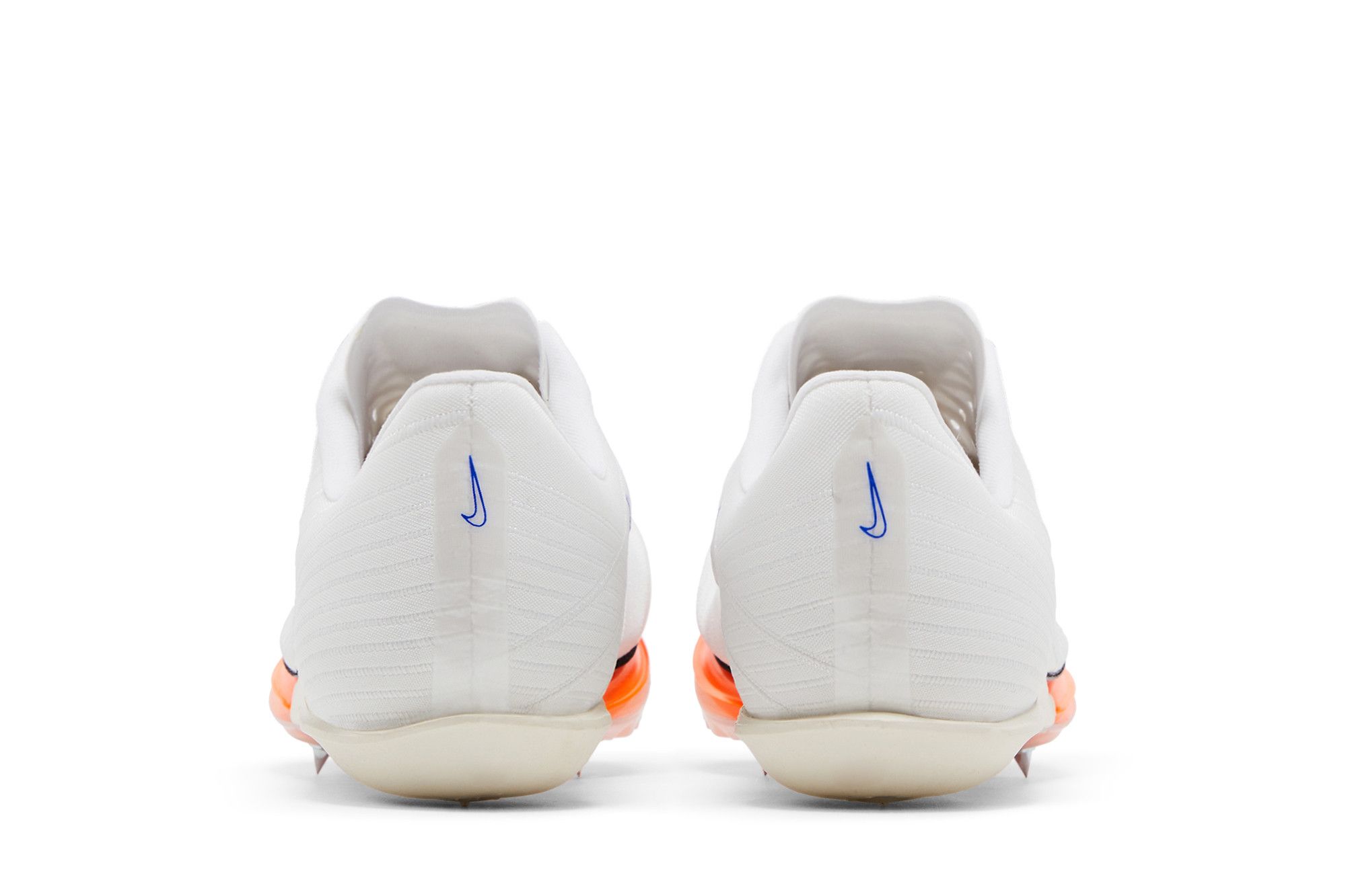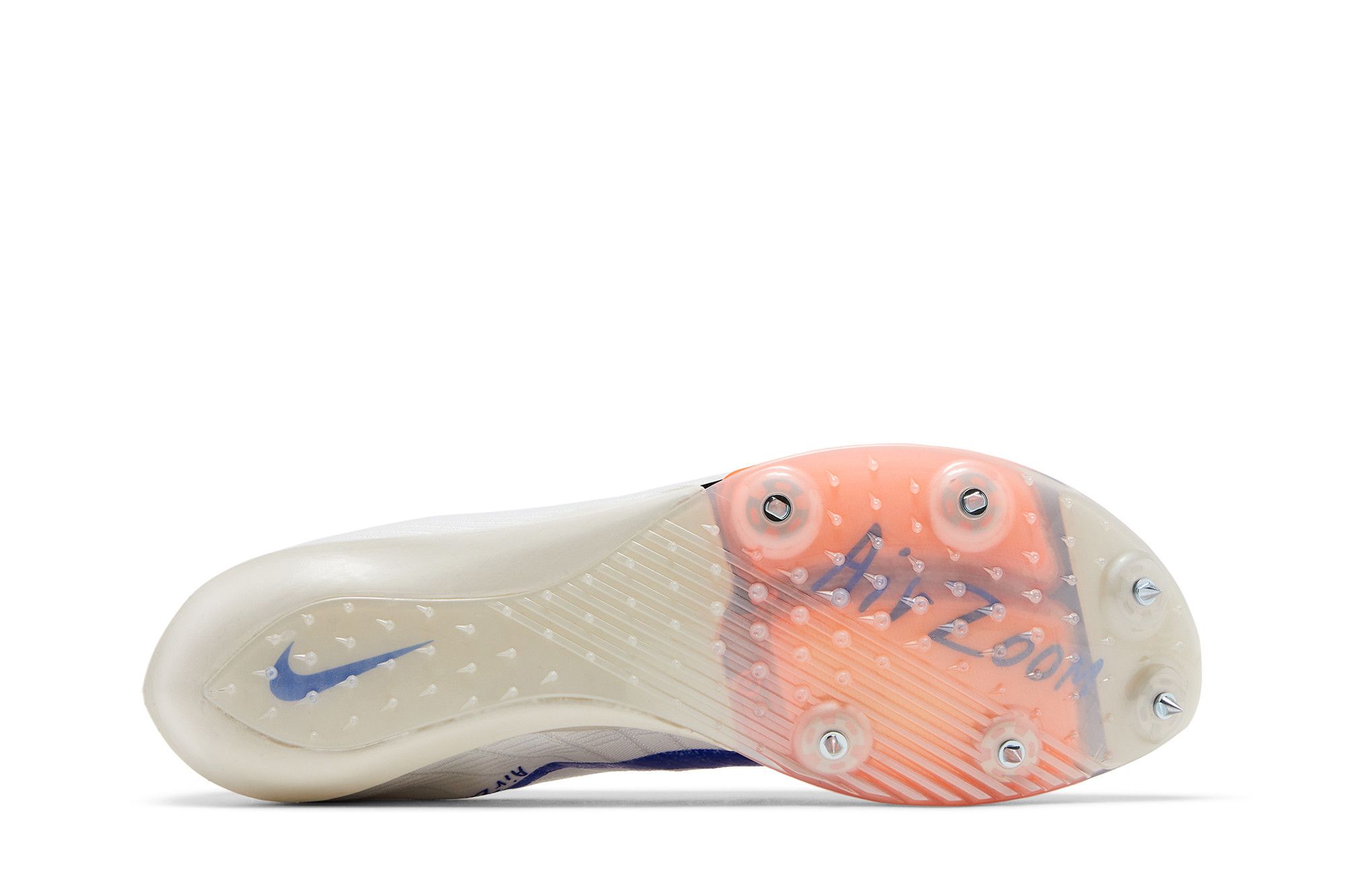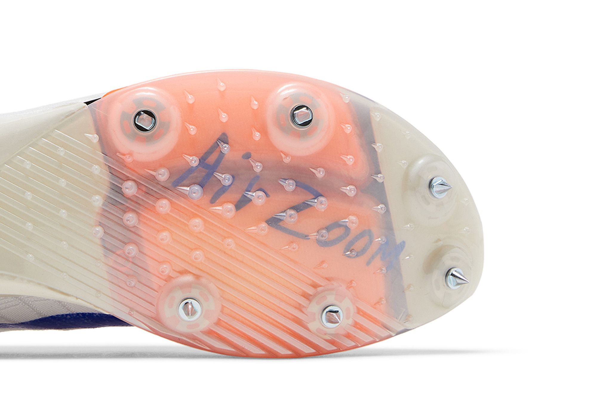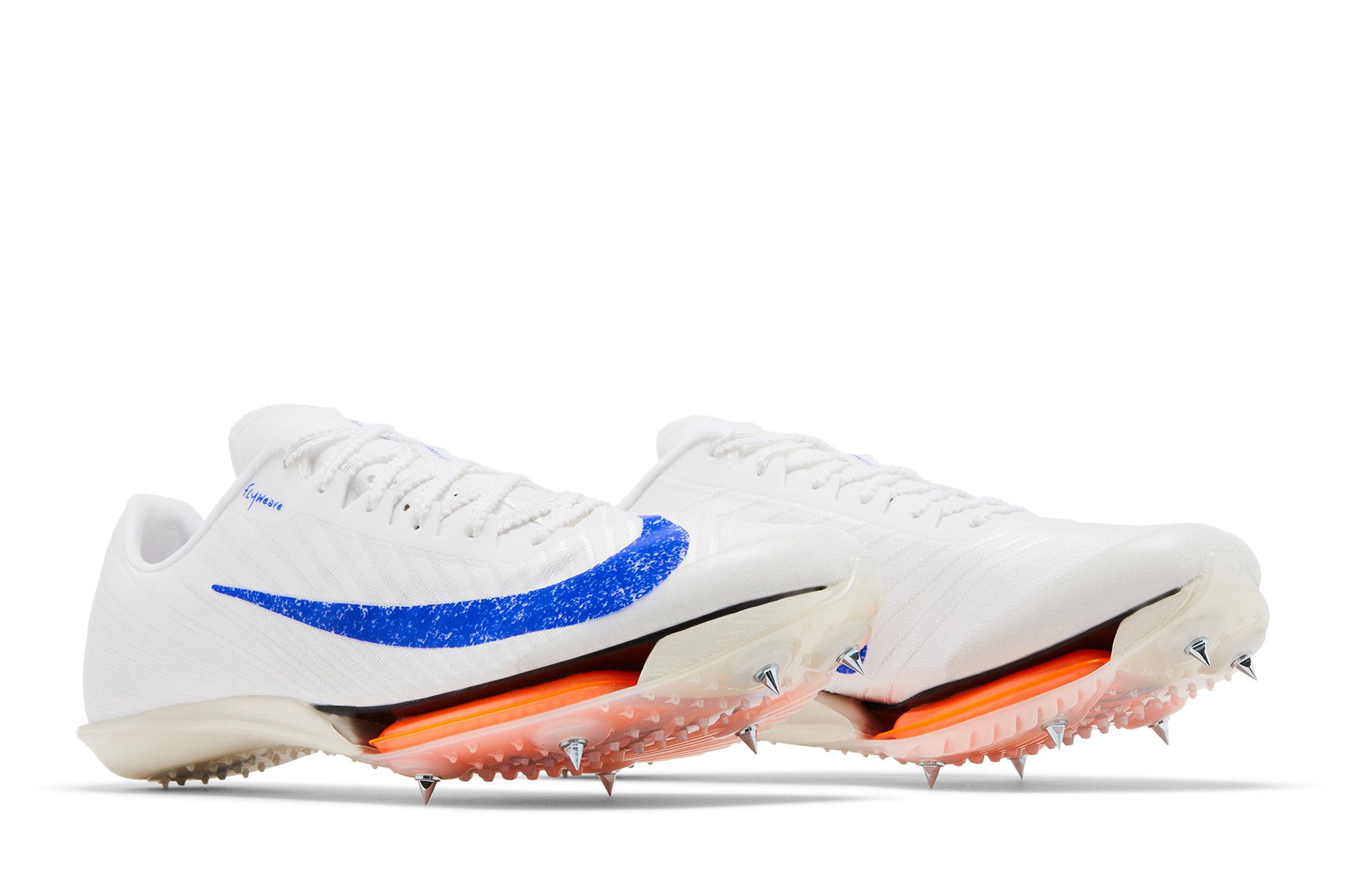 The Nike Air Zoom unit in these spikes has been specially adapted for elite athletes. It's divided into two compartments in the forefoot, providing slimmed down cushioning without adding any noticeable extra weight. These super-sleek shoes also have a carbon fiber insole that gives extremely sturdy support. The plain white colorway features a bright blue Swoosh, and the front undersole is punctuated by a flame-colored gradient.
