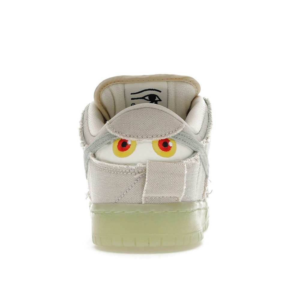 The Nike SB Dunk Low Mummy draws inspiration from the Ancient Egyptian mummification process. It features a layered textile upper with cross-stitched detailing and a suede Swoosh overlay. At the heel, eye graphics peek out from underneath the layered textile. A glow-in-the-dark sole and Eye of Horus woven tongue tag completes this Halloween design.