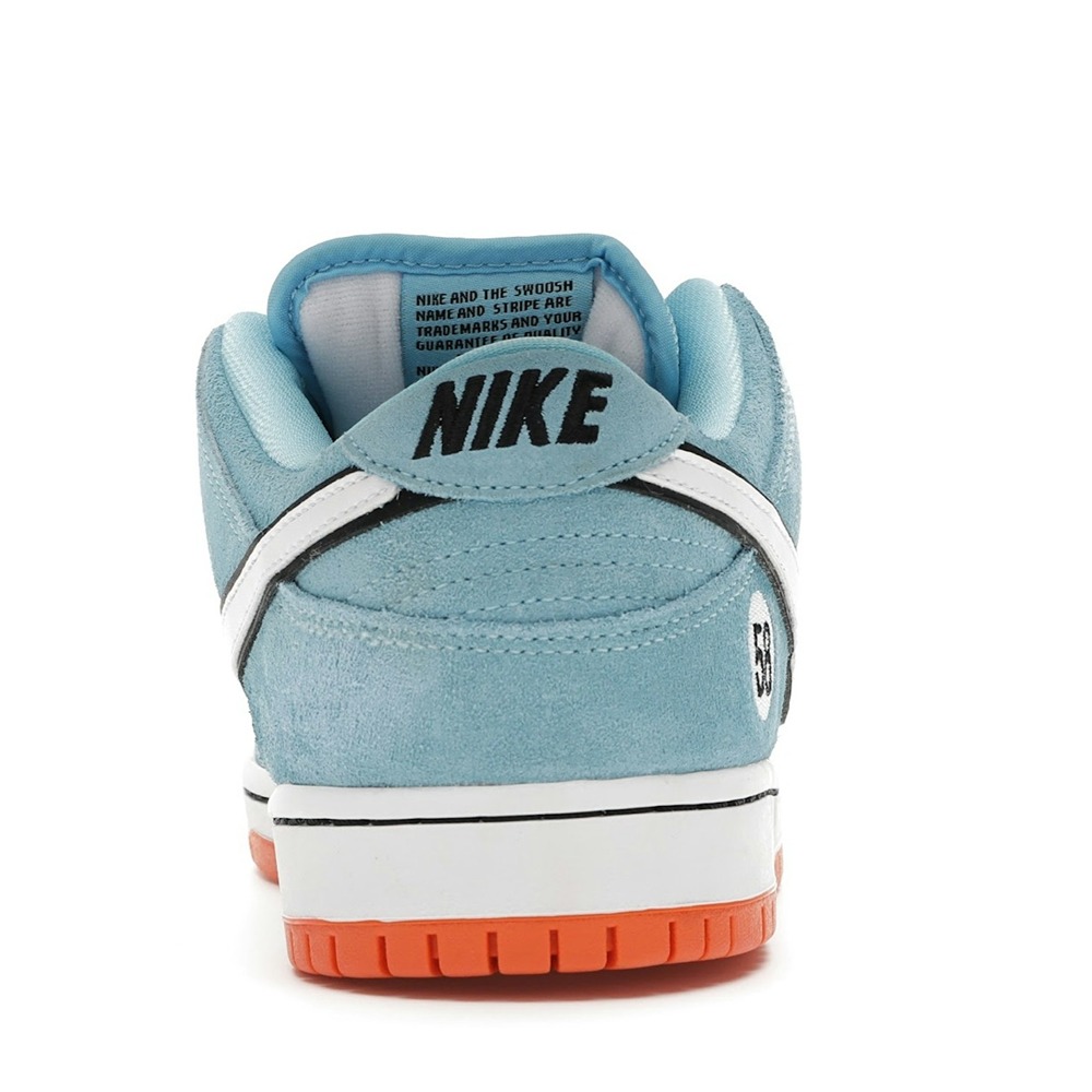 This light blue Nike SB Dunk Low Club 58 Gulf adds to the Dunk SB range of race car-inspired sneakers. The Nike SB Dunk Low Club 58 Gulf features a Blue Chill suede upper, with black laces and a white leather Swoosh contrasting the silhouette. A patch with the number 58 is embroidered near the heel, and the same digits are repeated on the woven tag affixed to the stuffed mesh tongue. The design is finished with a two-tone sole: white with an orange outsole.