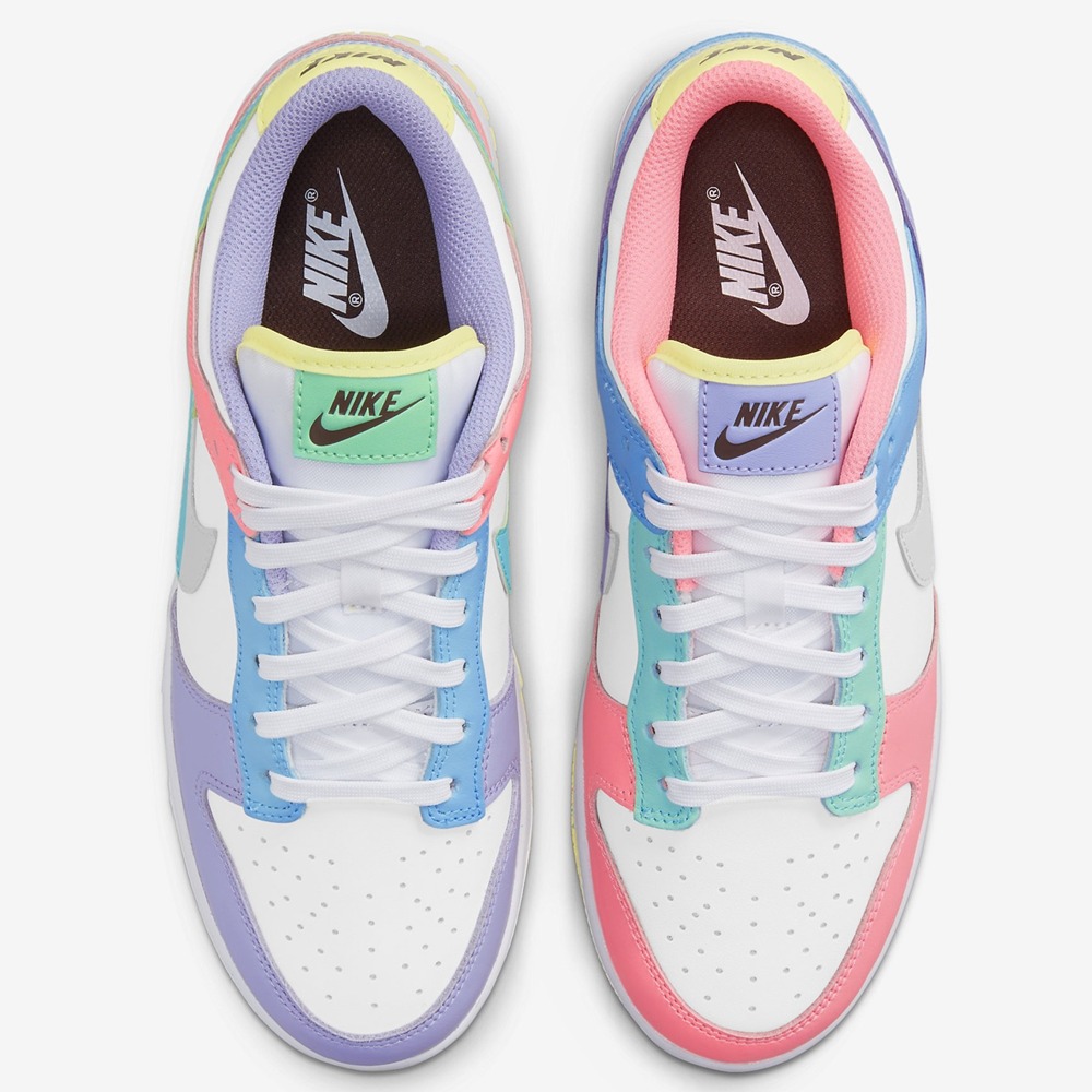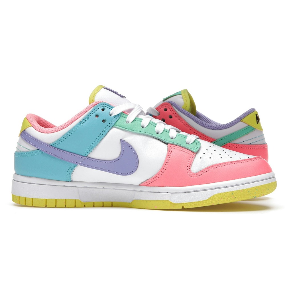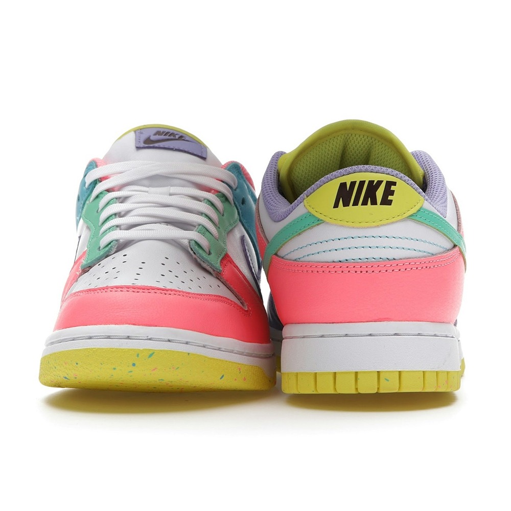 This Nike Dunk Low "Easter" is dressed in a Green Glow, Sunset Pulse, and White color hue. It features White leather across the base while various pastel shades land on the overlays. At the bottom, each is completed by a white midsole and a yellow outsole with red and blue flecked detailing. SKU: DD1872-100 Release Date: Spring 2021 Color: White/Green Glow-Sunset Pulse