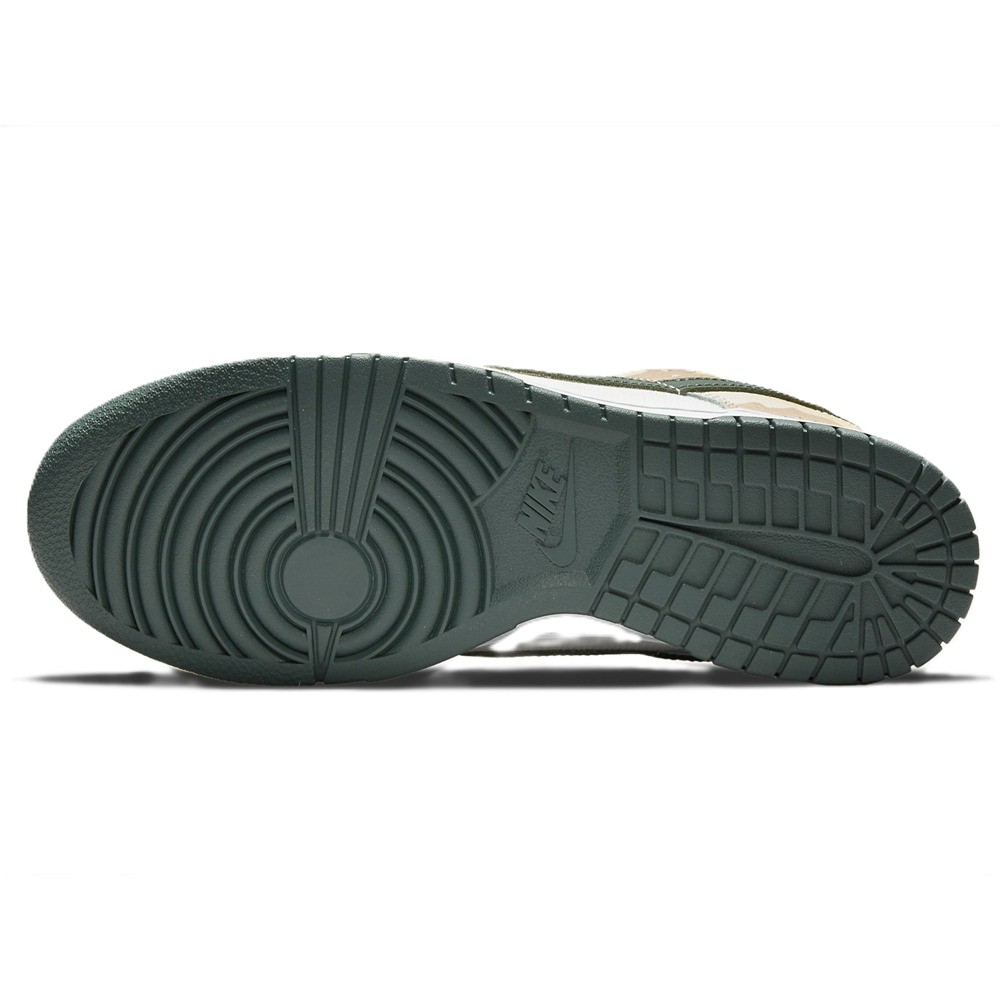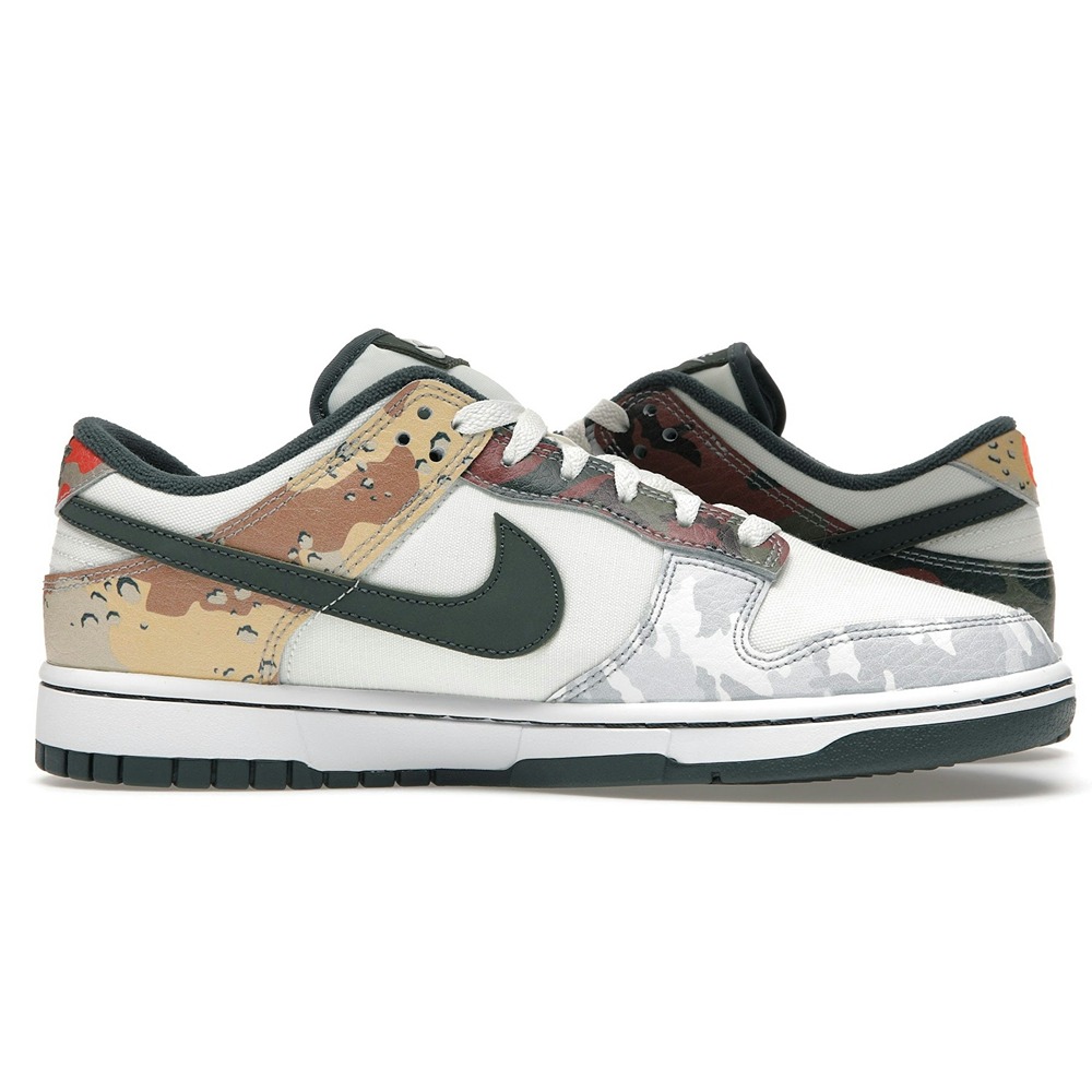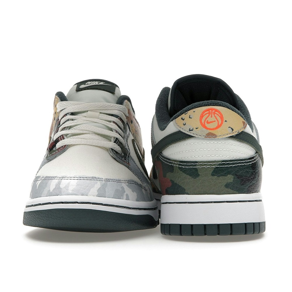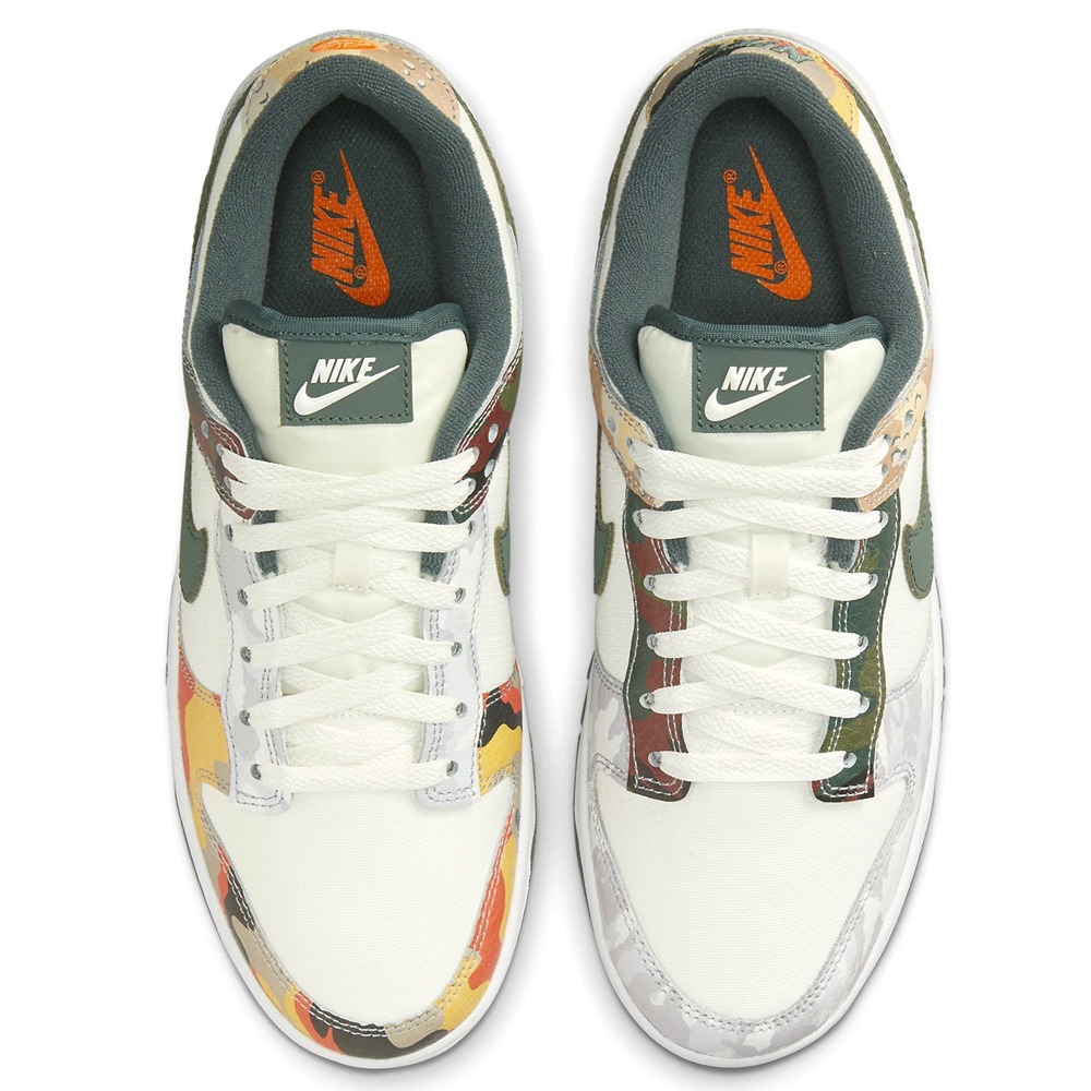 Boasting clashing camouflage patterns, the Nike Dunk Low Sail Multi-Camo is a statement piece. The design utilizes a white leather base to prominently display its multi-color camo overlays, which feature five different styles of camo. Green Swooshes and vibrant orange Nike embroidery on the heel tabs add the finishing touches.