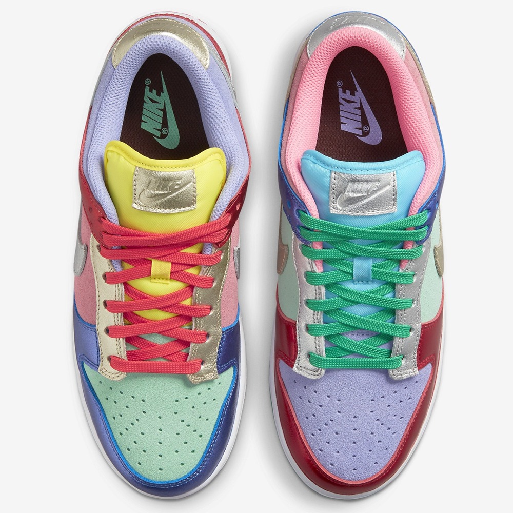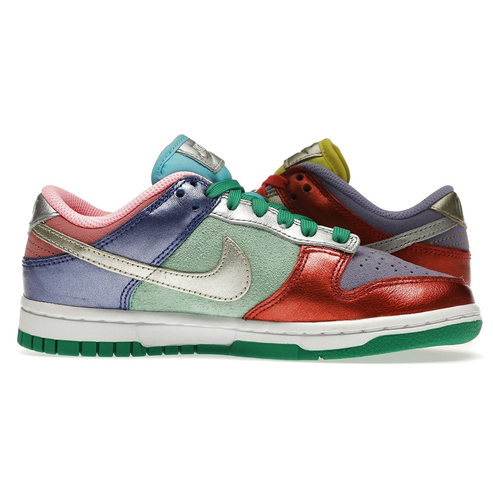 Dressed in mismatched colors, the women's Nike Dunk Low Sunset Pulse (W) is constructed of a mix of metallic leather and suede. Metallic silver tongue labels and heel tabs offer the design’s only points of symmetry. The women's Nike Dunk Low Sunset Pulse (W) released in June of 2021 and retailed for $100.