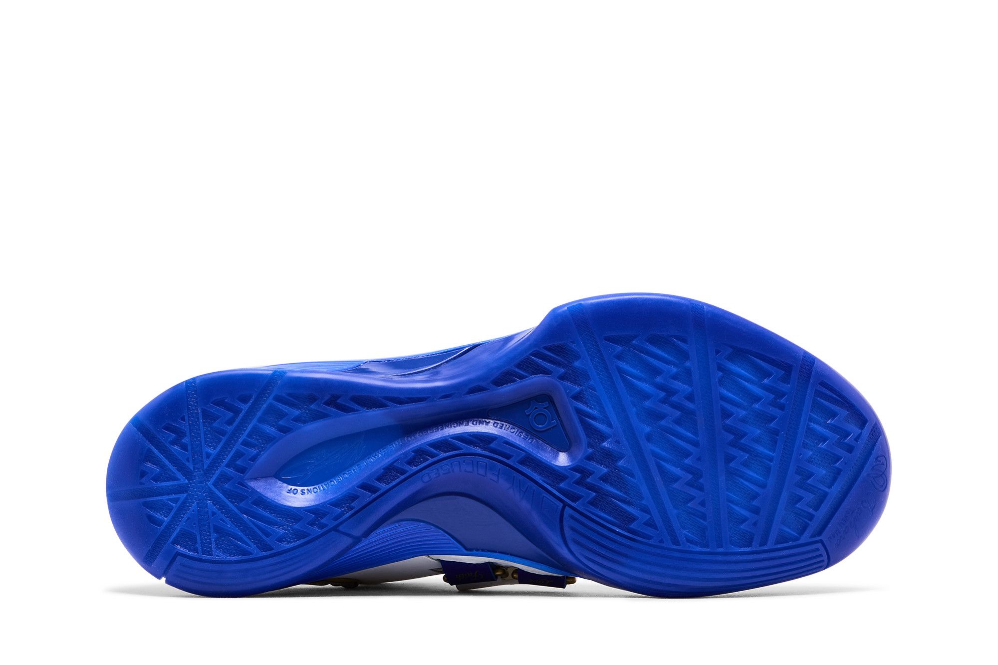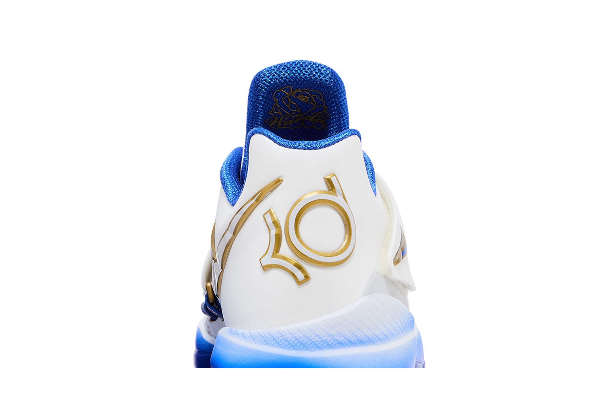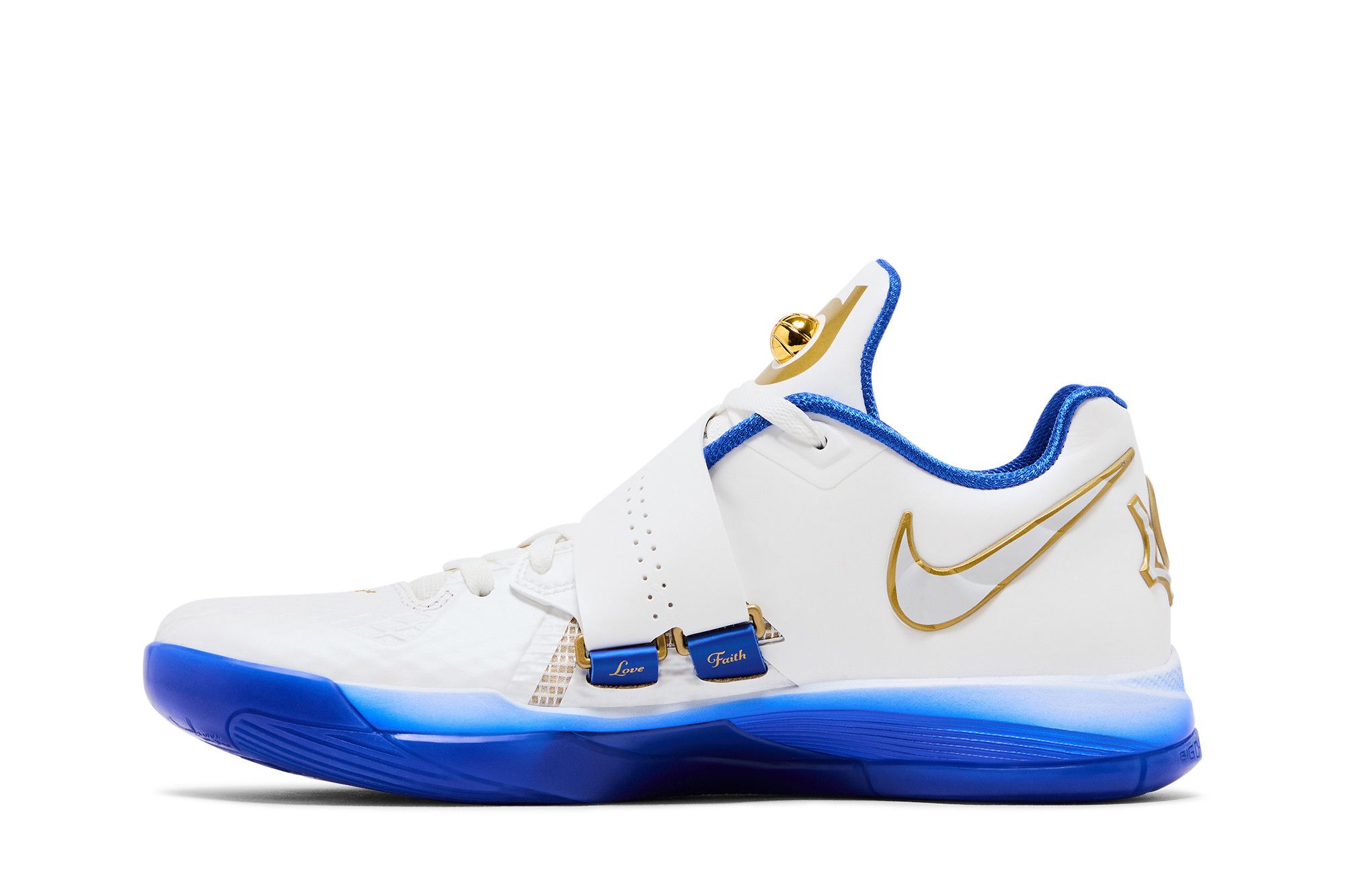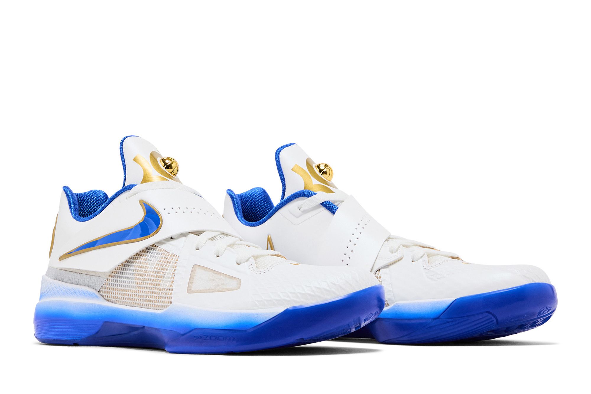 The Nike KD 4 The Real MVP is a high-top basketball shoe featuring a leather and mesh fabric upper in Summit White. Accented by a perforated midfoot strap that displays the Nike Swoosh in Hyper Royal, outlined with Metallic Gold, the tongue features KD branding with a Metallic Gold basketball, which reappears on the rear heel next to the Nike Swoosh. An airbrush-style midsole ombrés from Summit White to Hyper Royal.