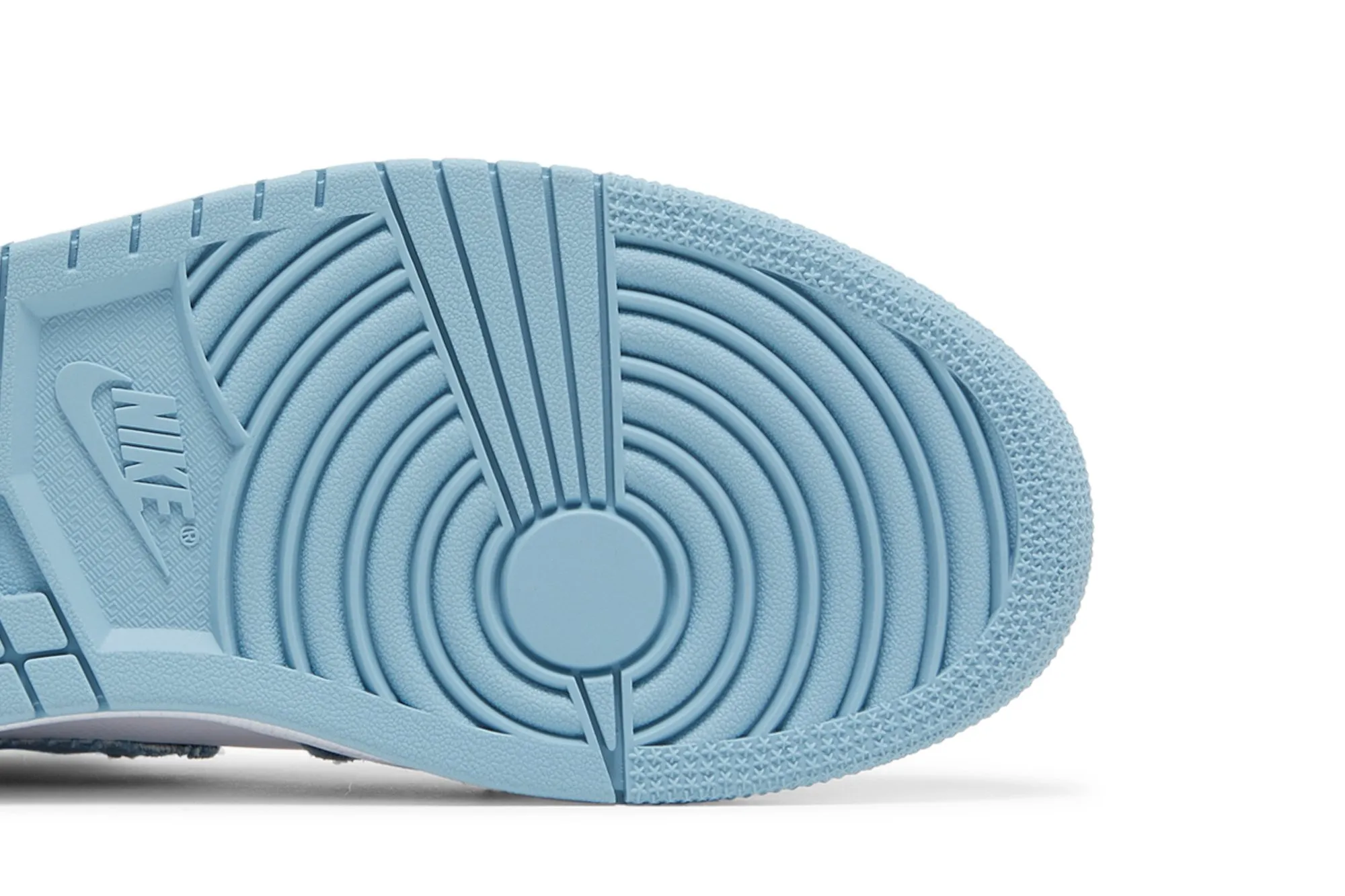 The women’s Air Jordan 1 Retro High OG ‘Denim’ updates the iconic silhouette with a material makeover inspired by the world of casual apparel. The high-top is clad in a white tumbled leather upper with denim overlays in washed indigo, complete with frayed edges for a worn-in aesthetic. The signature Wings logo appears on a sewed-on patch atop the lateral ankle, while oversized lace jewels in metallic gold feature a Jordan wordmark on one shoe and a molded Jumpman logo on the other. The sneaker rests on a rubber cupsole with encapsulated Air-sole cushioning in the heel.