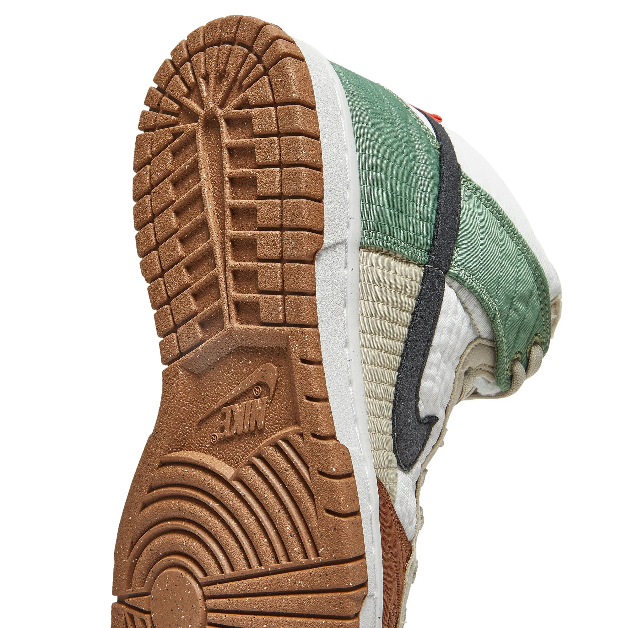The Nike women’s Dunk High LX ‘Toasty’ treats the classic silhouette to a winter-ready makeover, highlighted by 20% recycled content by weight. The quilted textile upper features mismatched panels in white, brown, green and tan, along with a black synthetic suede Swoosh. A crimson suede heel tab provides a bold pop of color. Nike’s pinwheel tongue tag references the shoe’s sustainable build, while the sockliner features Toasty branding in a nod to the warm fleece that lines the interior.