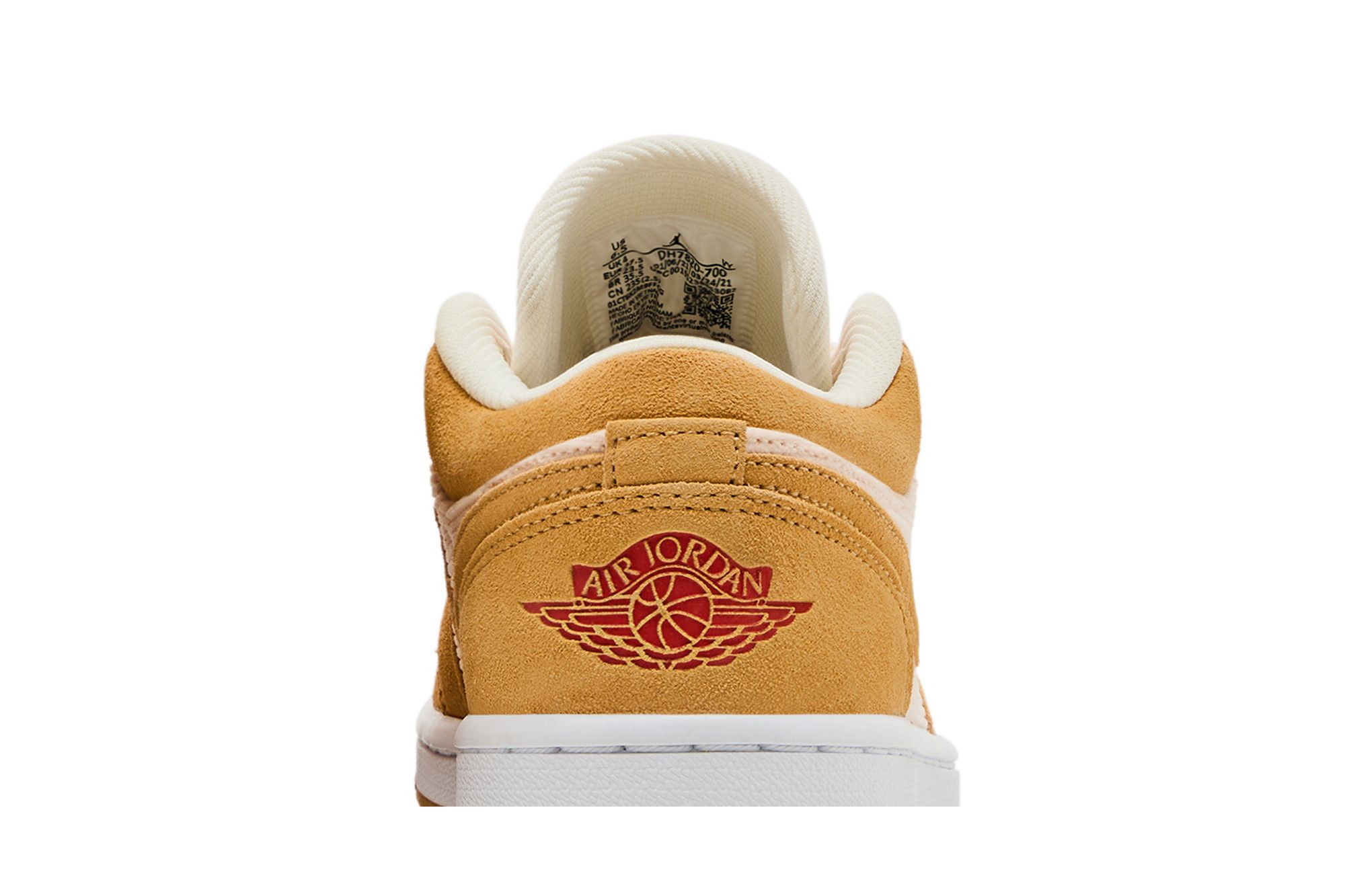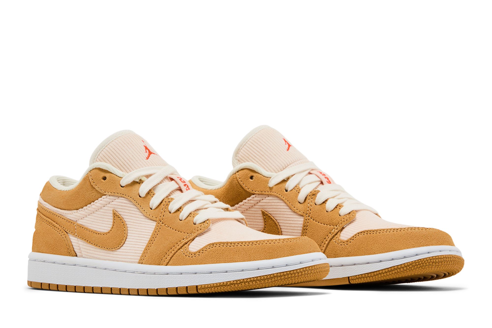The Air Jordan 1 Low SE Twine Orange Quartz Corduroy (W) is known for its fall-like color scheme. This women's shoe features caramel-colored suede overlays that match the outer sole. A white midsole complements thick white laces. A hint of pale pink tints the ribbed upper made of corduroy. A reddish Jumpman logo is on the tongue and a matching Wings logo is on the heel.