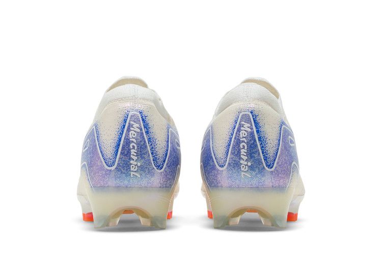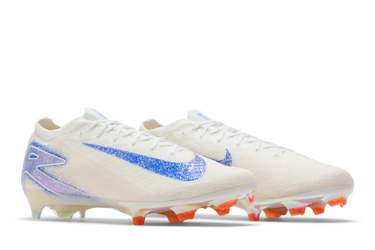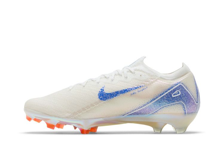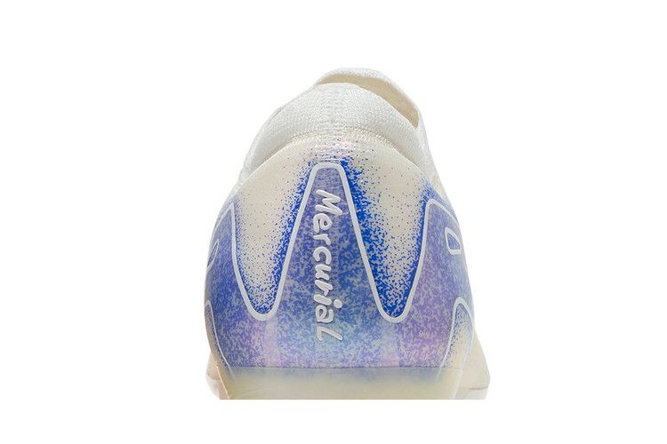 The Nike Zoom Mercurial Vapor 16 Elite FG 'Blueprint Pack' features a white Flyknit upper with AtomKnit side panels and Nike Gripknit overlays for improved touch and control. Branding elements include a speckled blue Swoosh and an oversized 'AIR' graphic that wraps around the heel. A 3/4-length Zoom Air unit offers responsive cushioning with each step. Underfoot, the iridescent outsole plate utilizes a wave-like traction pattern with a series of chevron and blade studs.